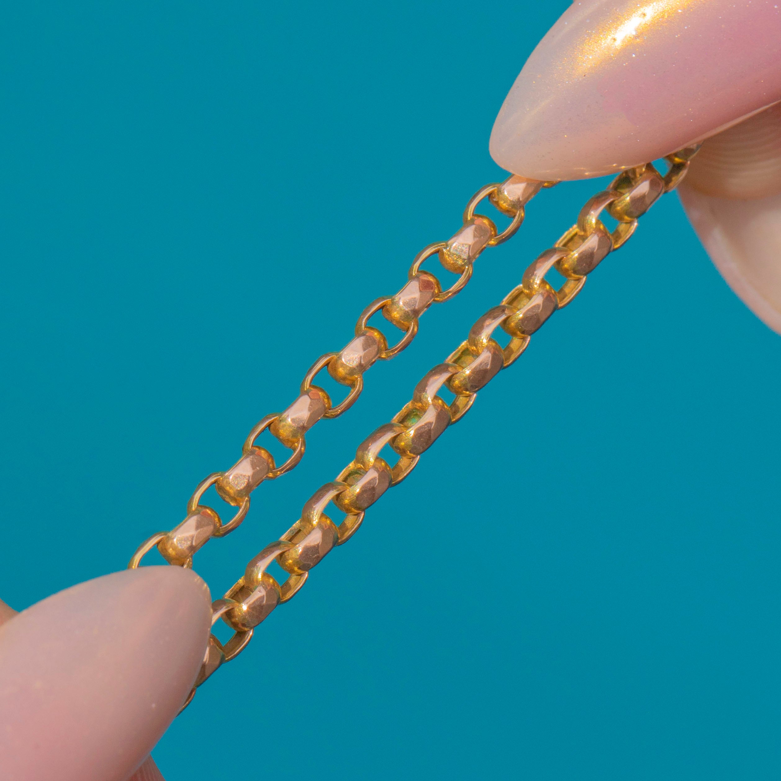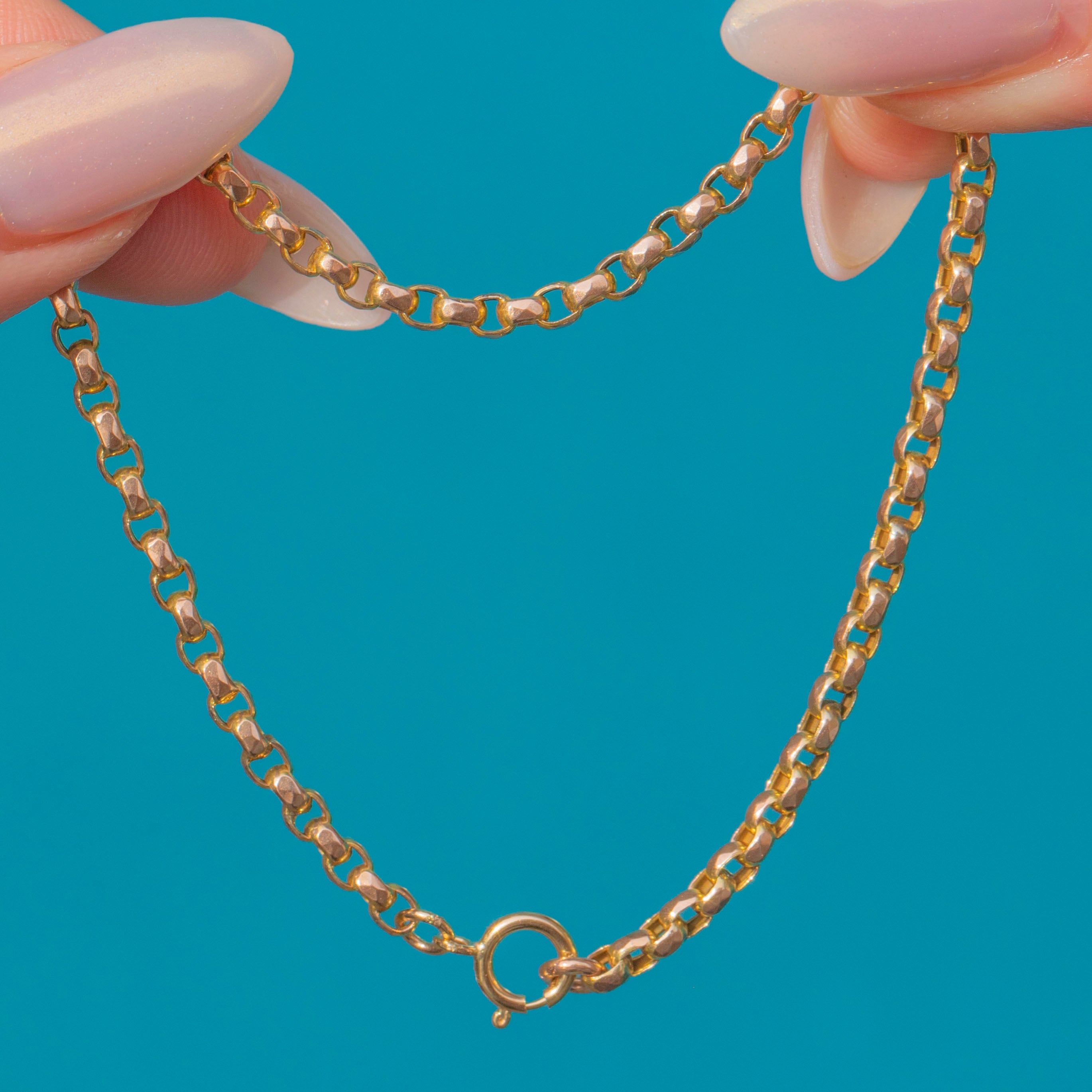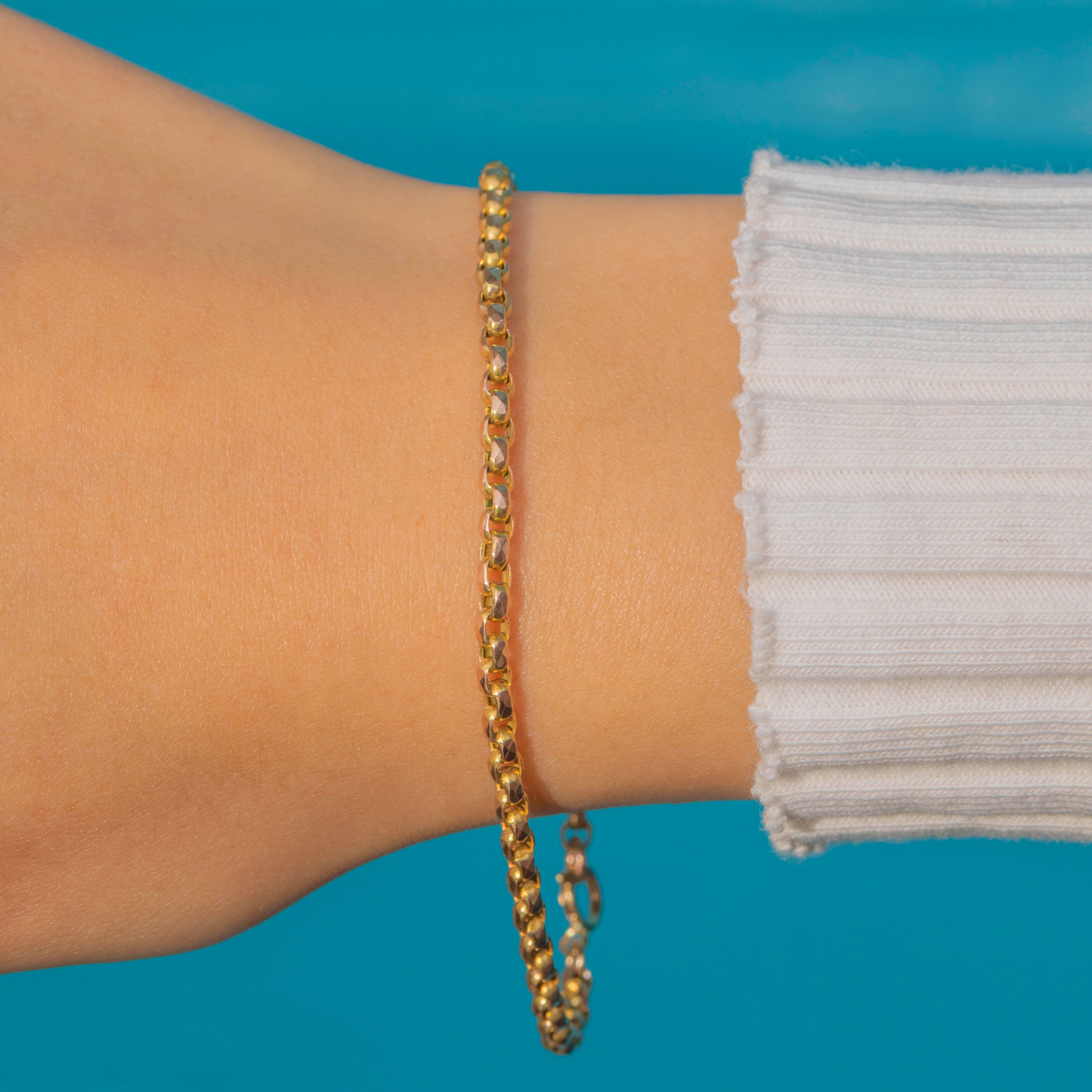 This charming Antique Victorian bracelet is crafted in solid 9ct Gold and designed in a classic Belcher link. Beloved for its strength and timeless simplicity, the Belcher chain is made up of uniform, rounded links that sit smoothly against the wrist. Lightweight yet durable, this piece is perfect for everyday wear and can also be styled with charms for a personal touch.