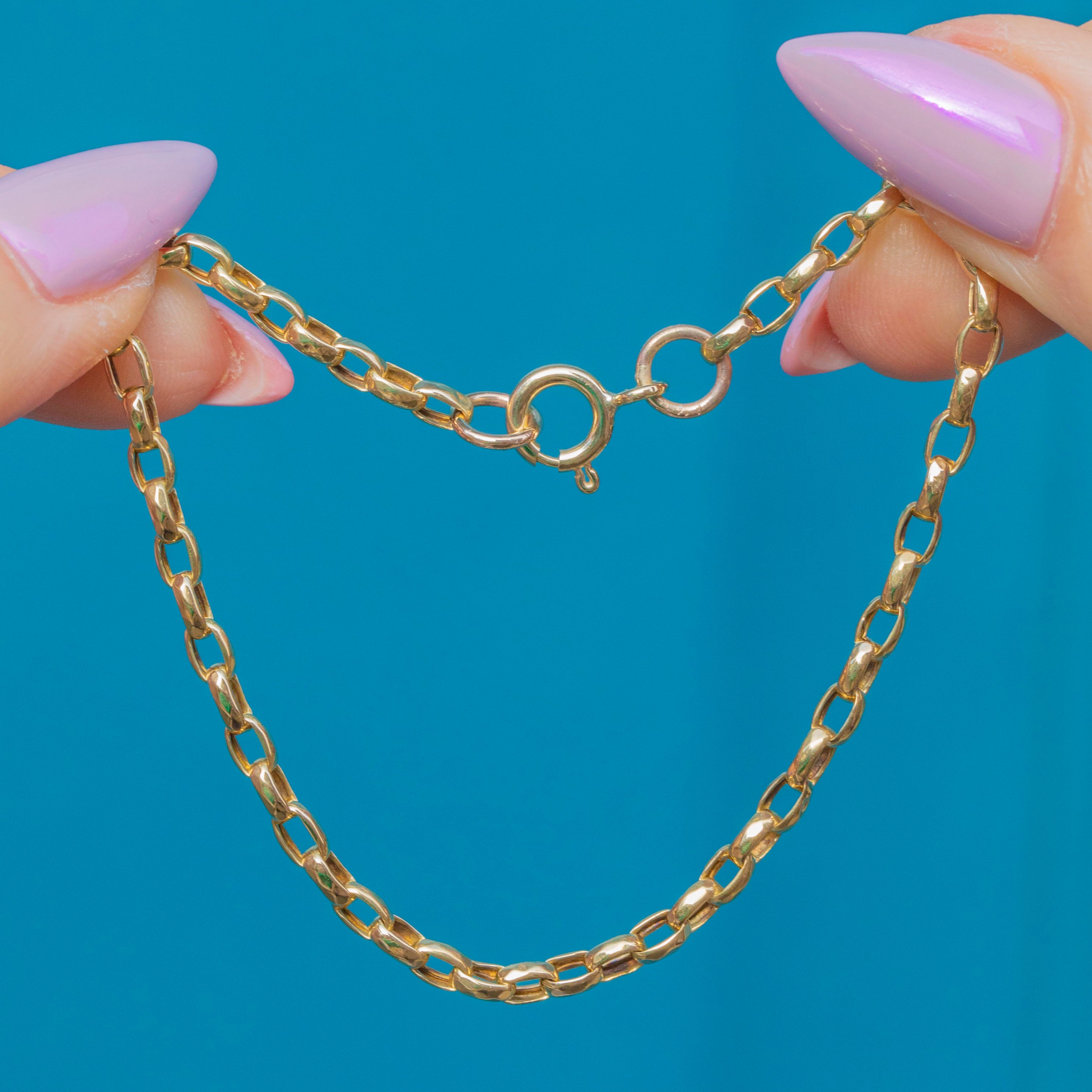 This antique Victorian bracelet is crafted in solid 9ct Gold with classic belcher links. Each 2.5mm link is finely formed and catches the light beautifully, giving the bracelet a subtle sparkle and refined character.
