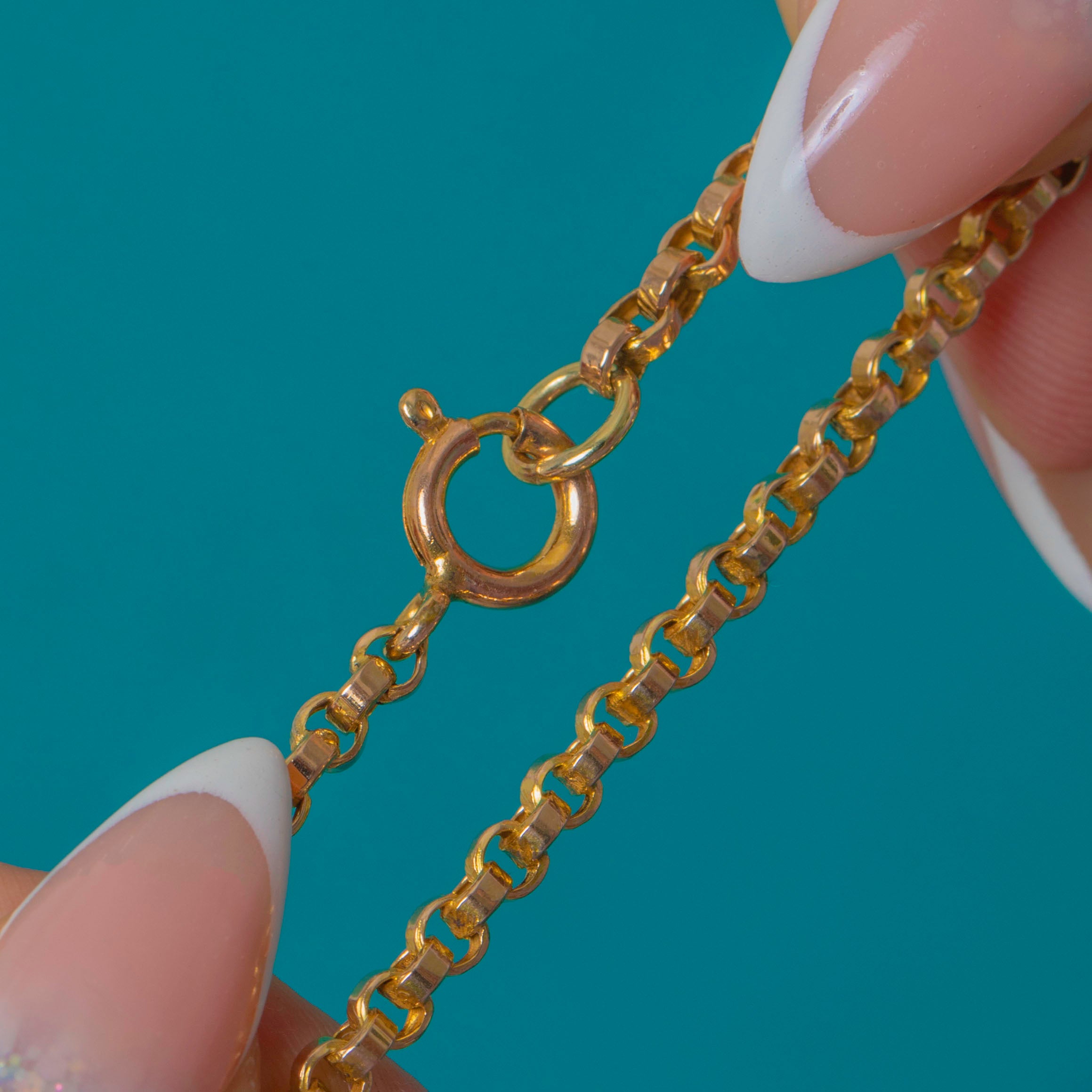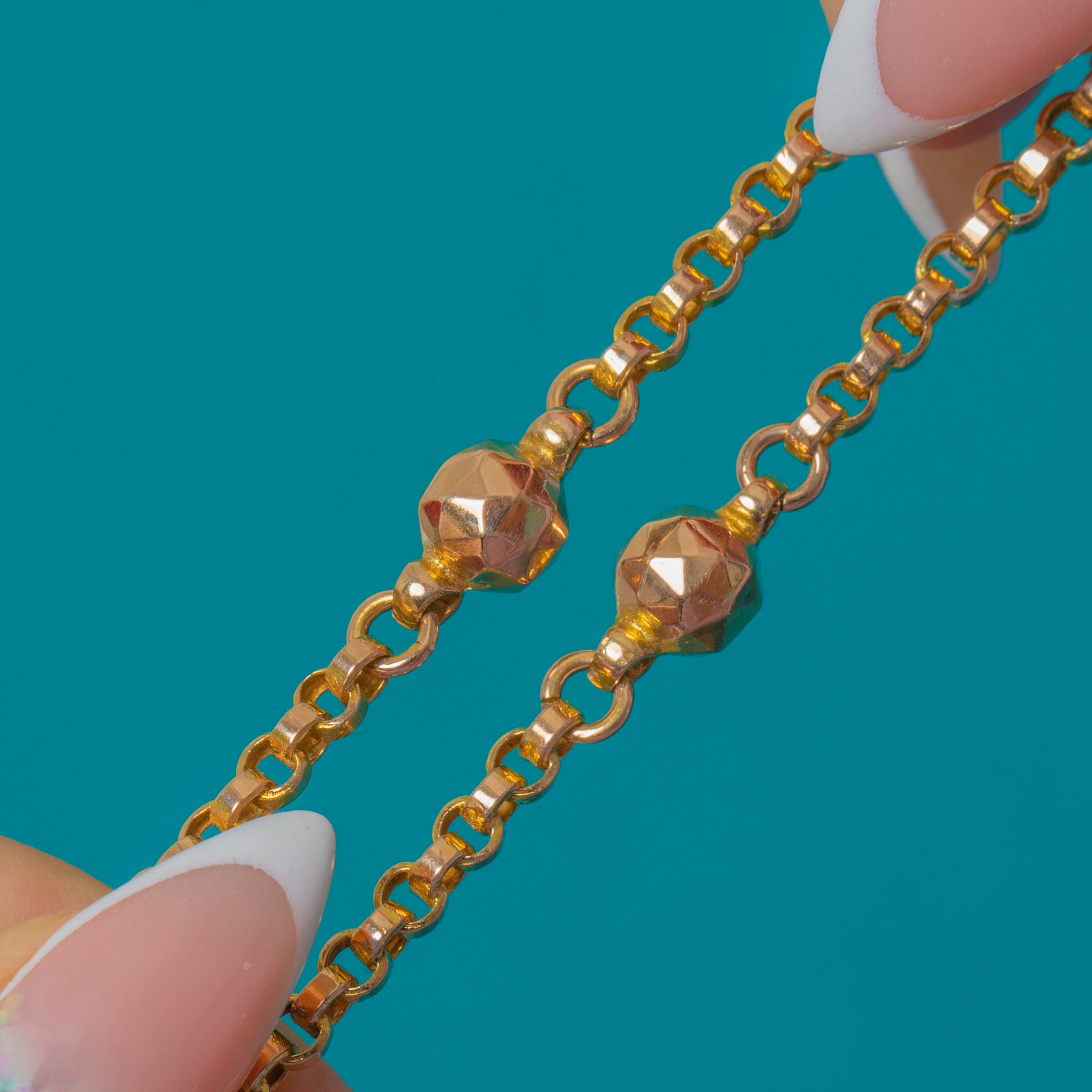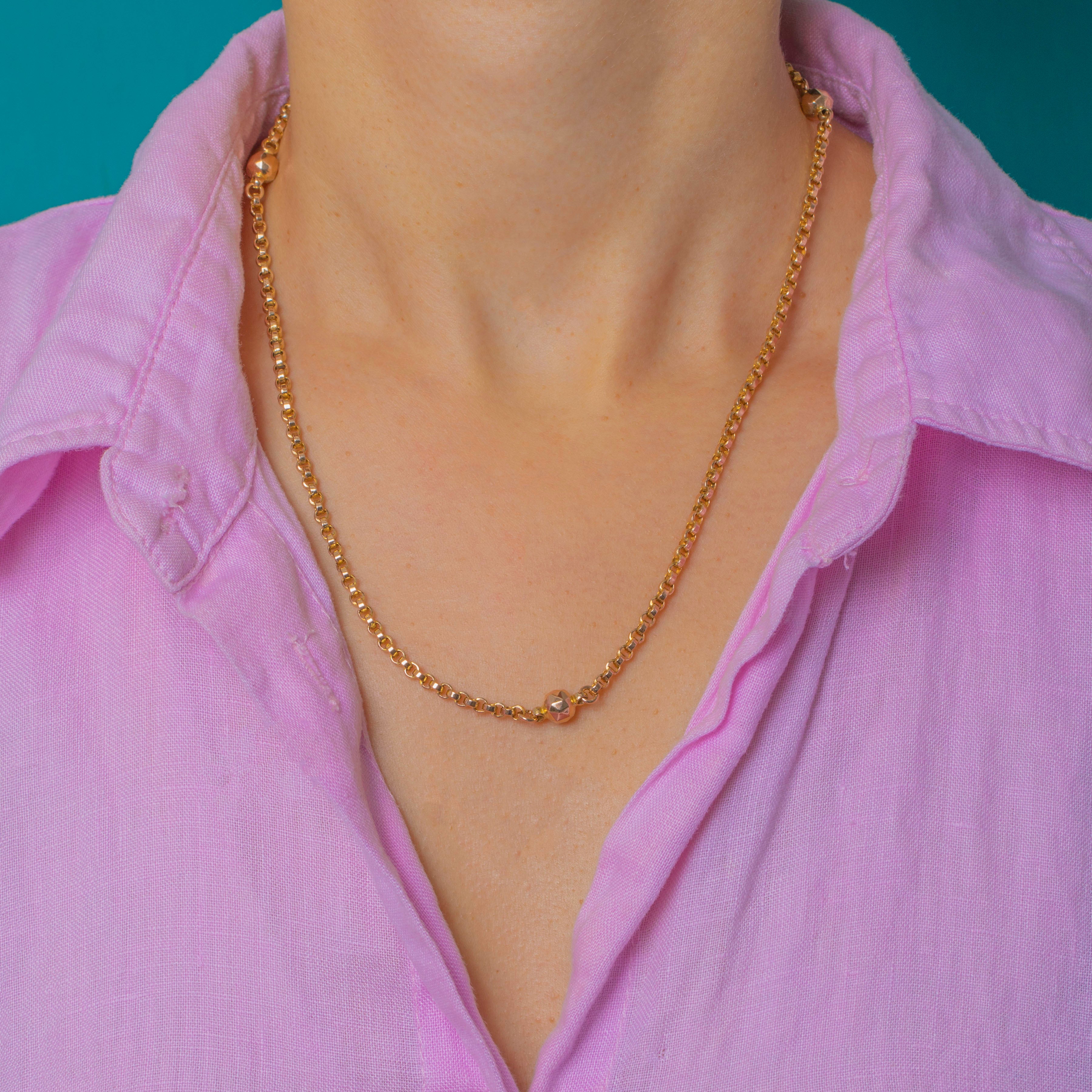 This Victorian 9ct Gold belcher chain is a charming and unusual example, featuring faceted Gold beads spaced along the length of the chain. These subtle facets catch the light beautifully, adding sparkle and texture while keeping the look classic and refined.