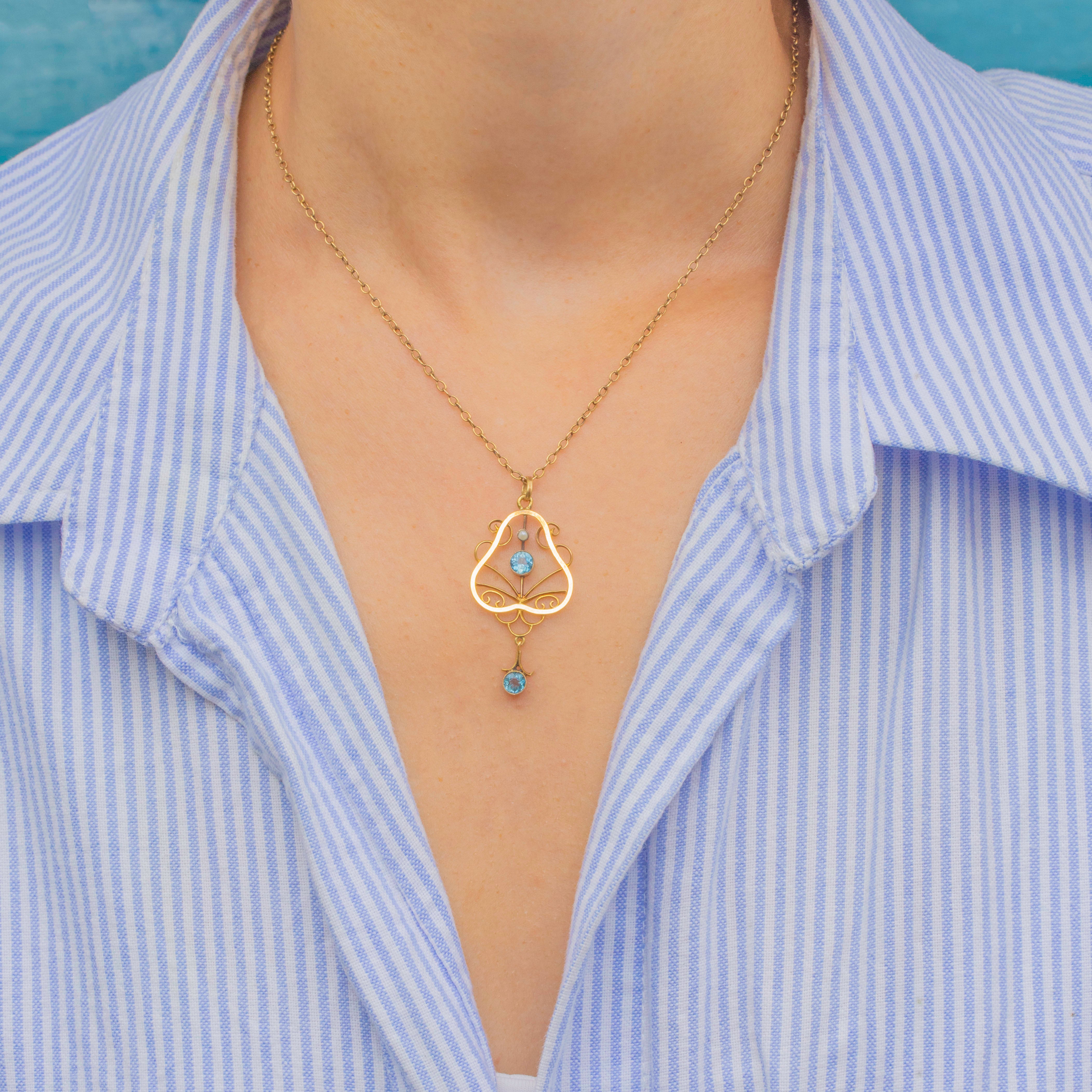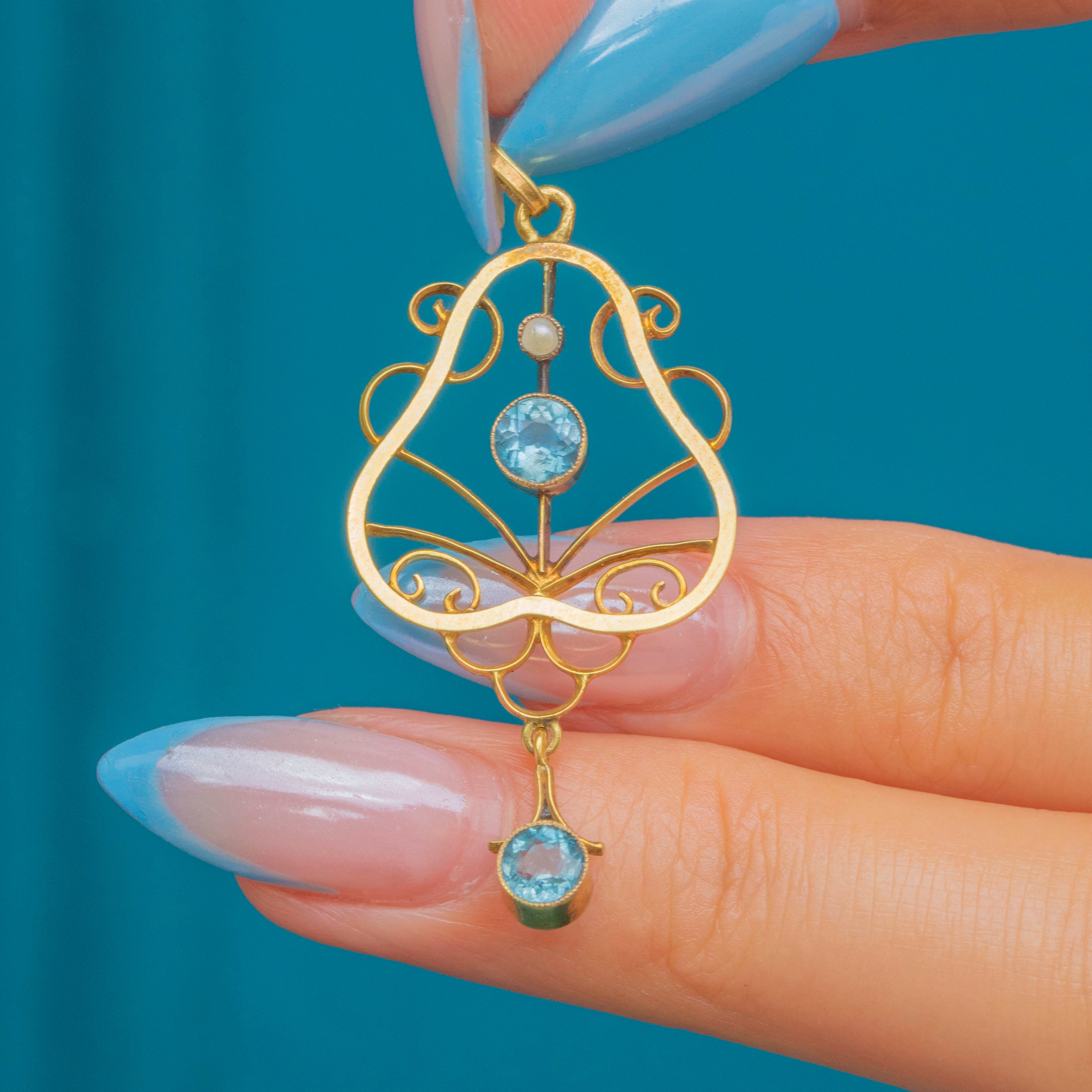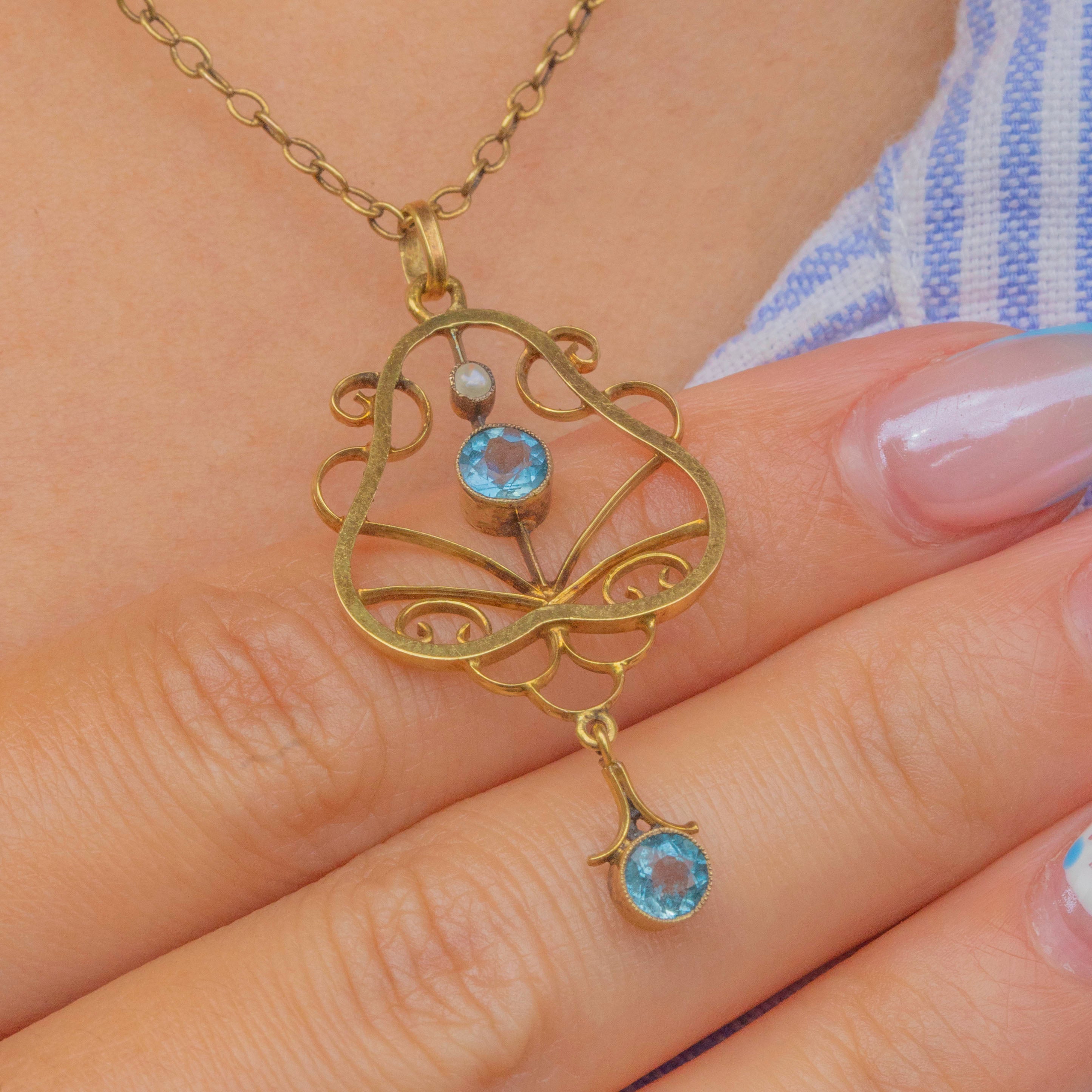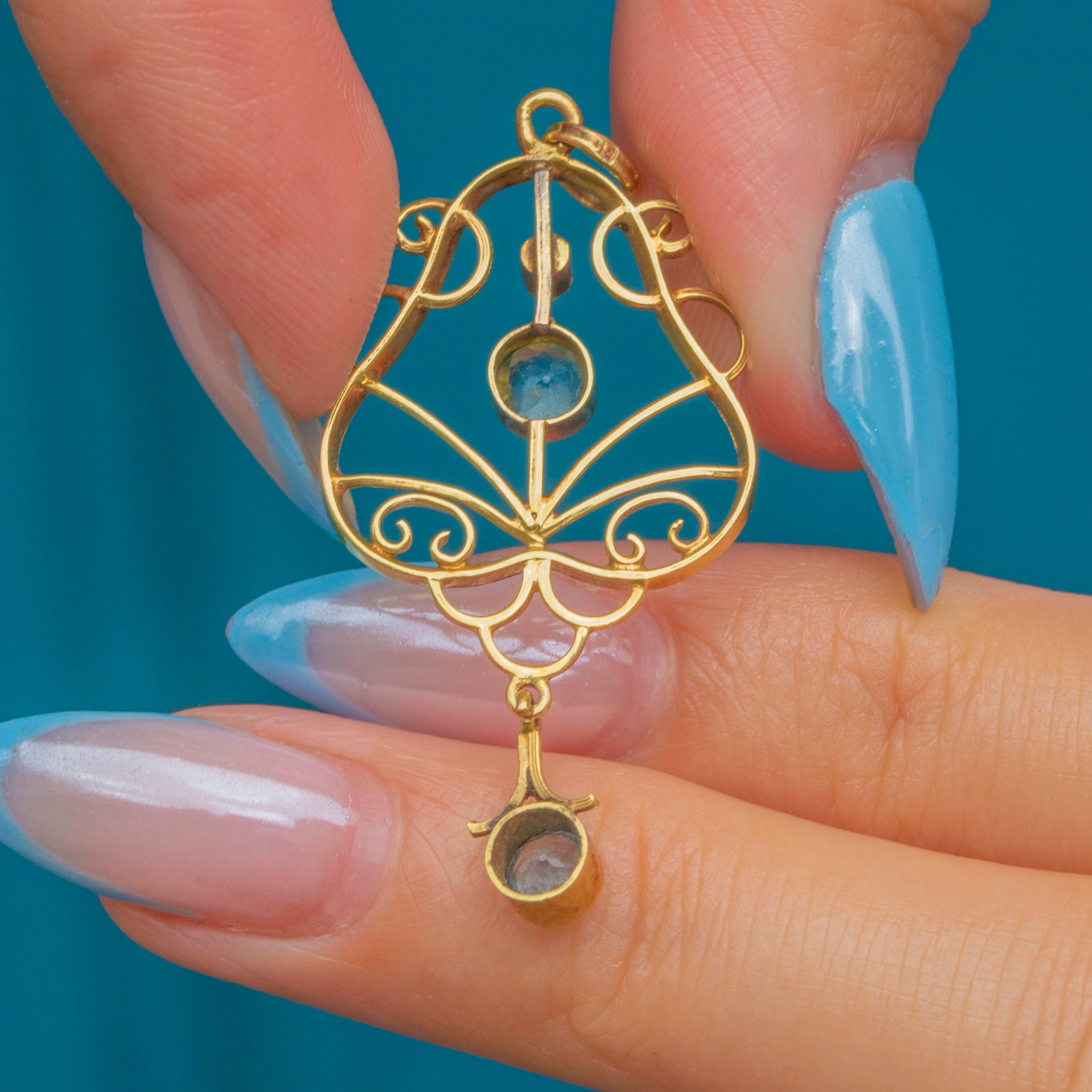 Antique 9ct Gold Blue Tourmaline Pearl Lavalier Pendant