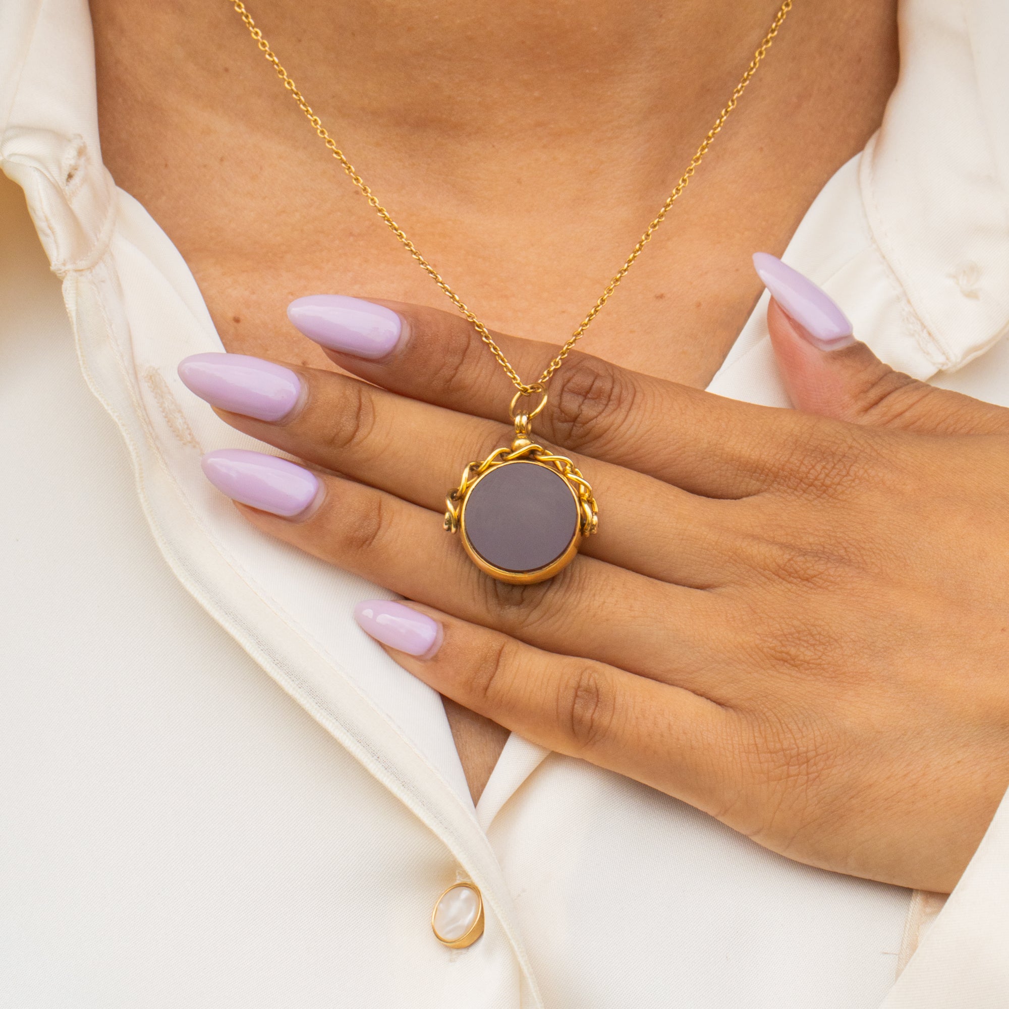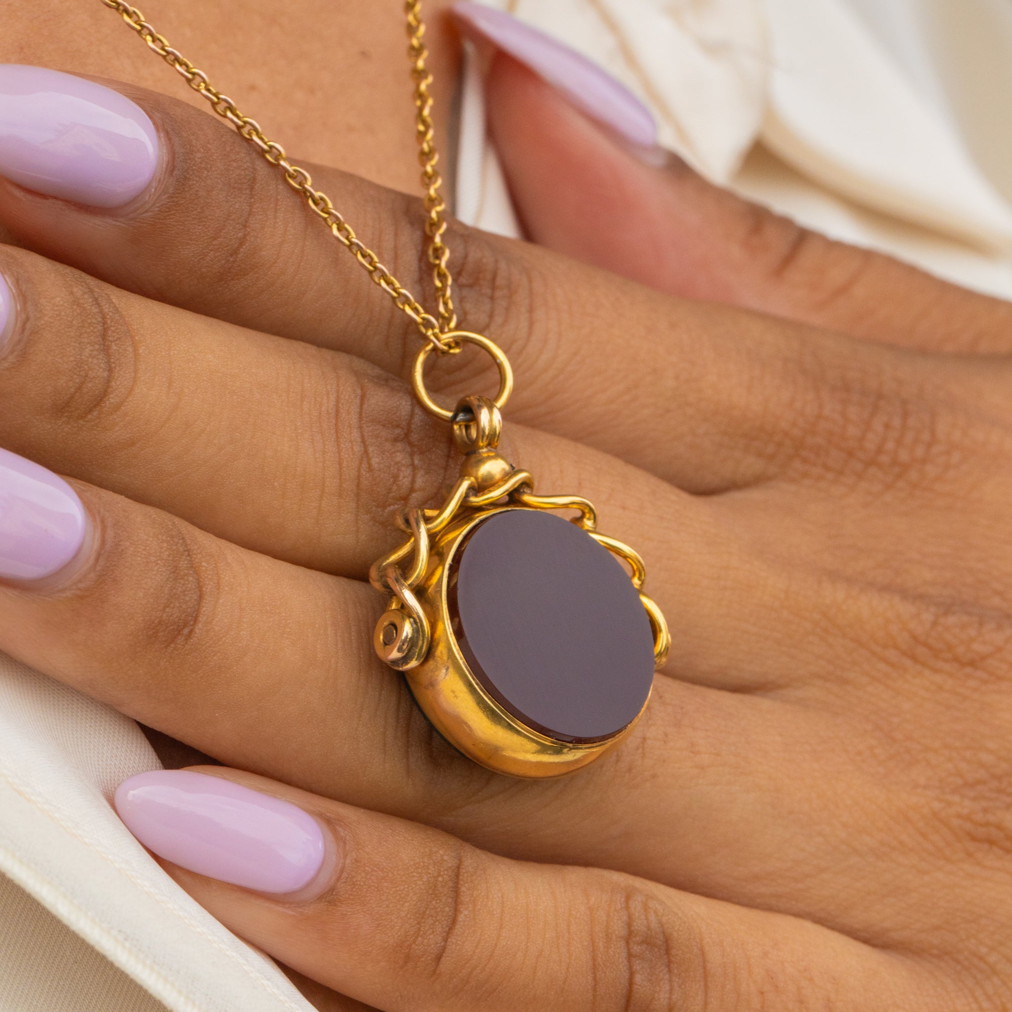 This antique 9ct Gold Carnelian Bloodstone swivel fob pendant is an Edwardian delight. Inlaid with a smooth wine red Carnelian and a gorgeous Bloodstone, this piece has a full set of hallmarks dating to 1900, so she's a true antique treasure!