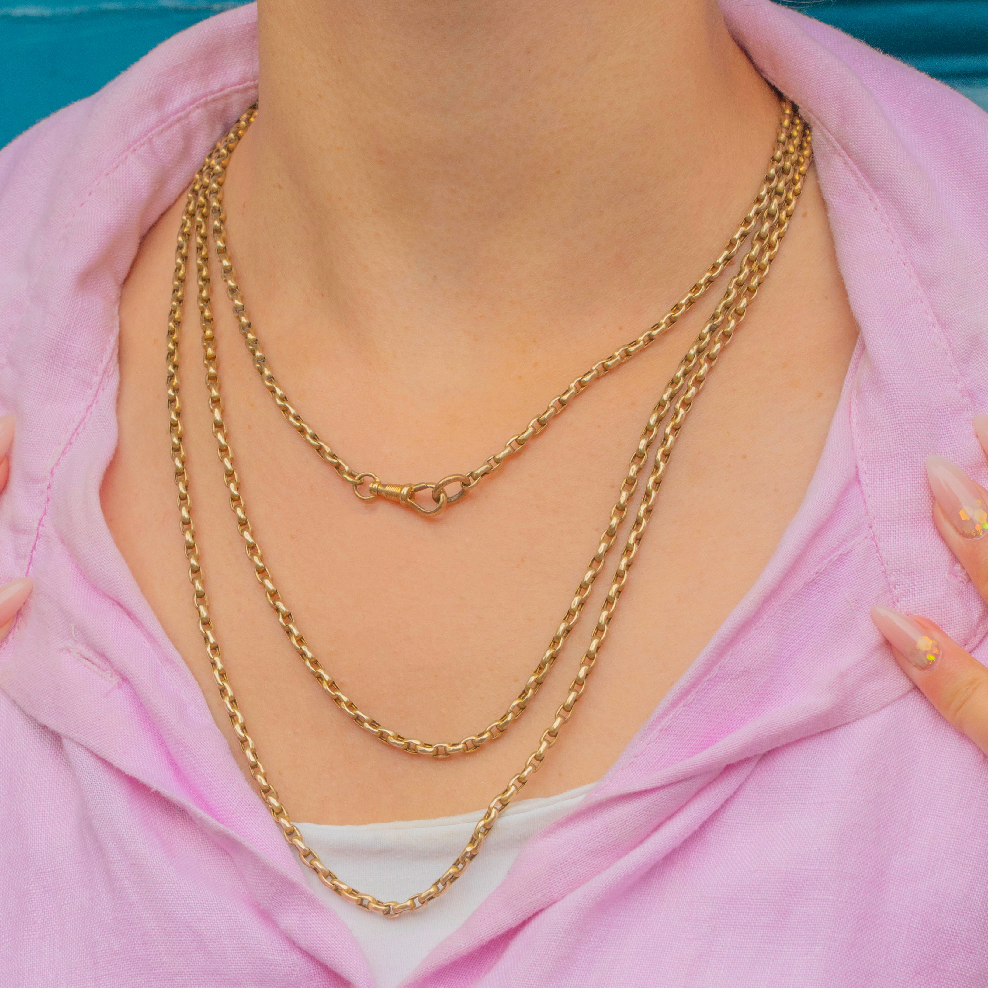 Measuring an impressive 57" in length, this chain offers endless styling opportunities. It can be worn long, doubled, or even layered with other antique necklaces for a bold statement. A versatile and classic piece of Victorian jewellery with a rich golden hue.