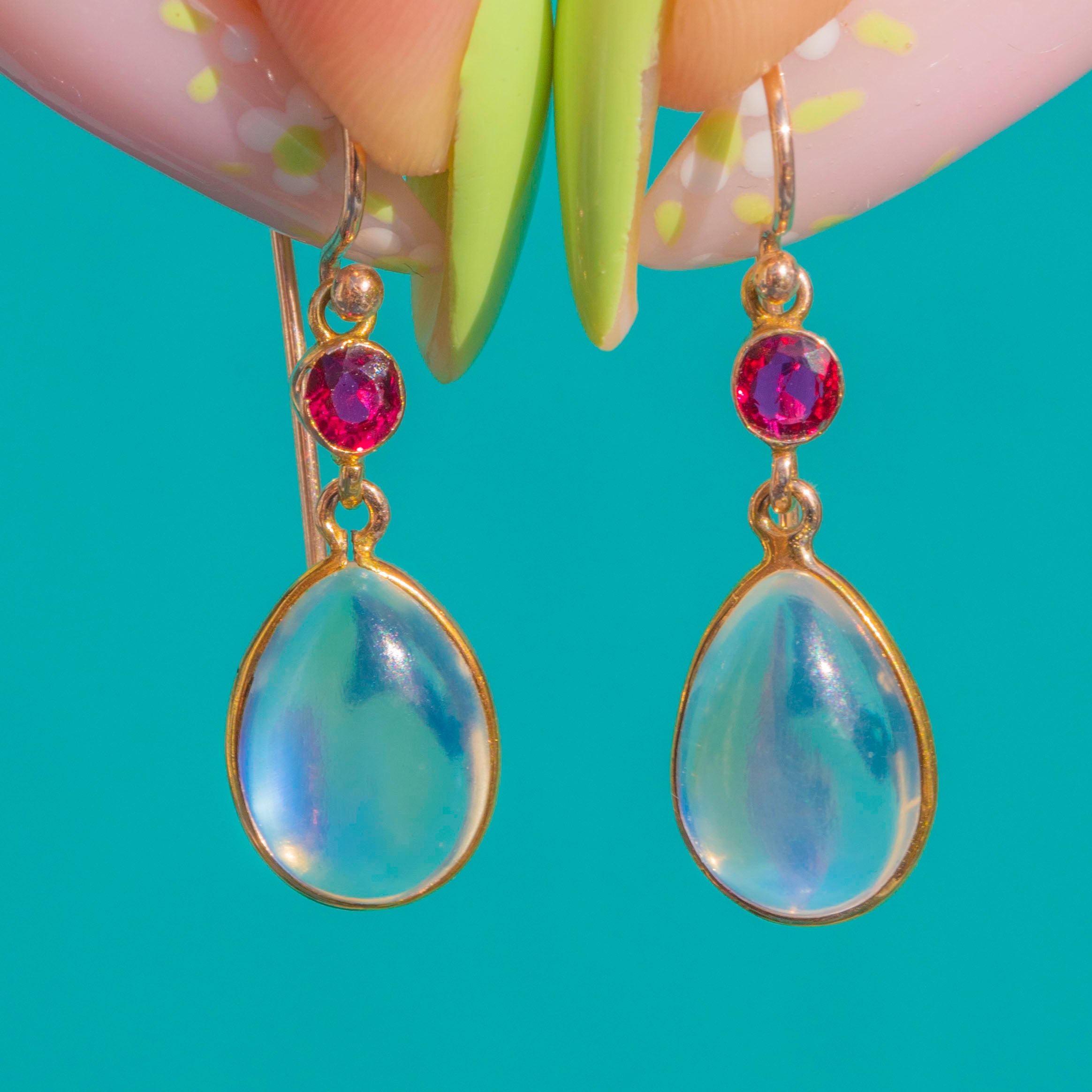 Antique 9ct Gold Ceylon Moonstone Ruby Teardrop Earrings
