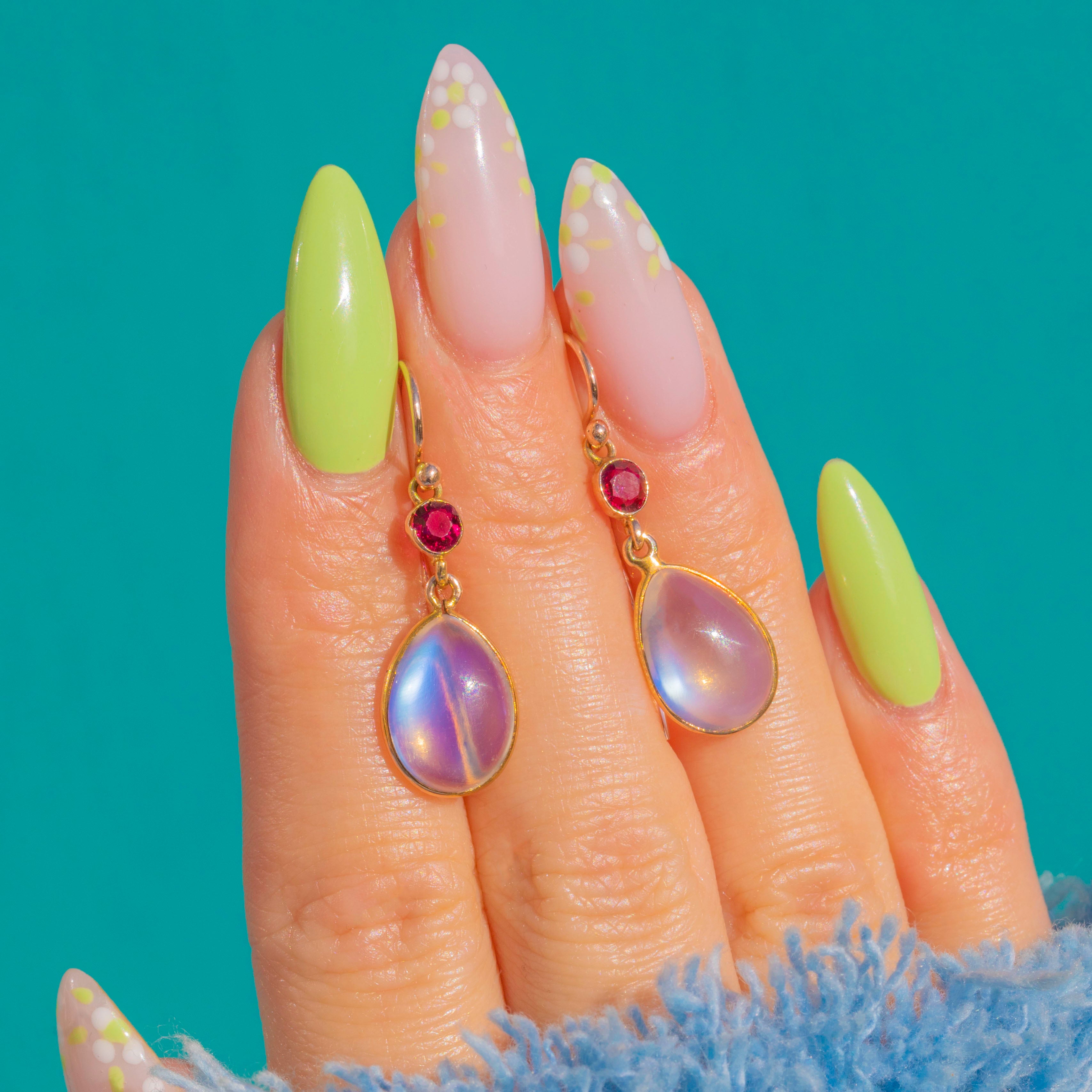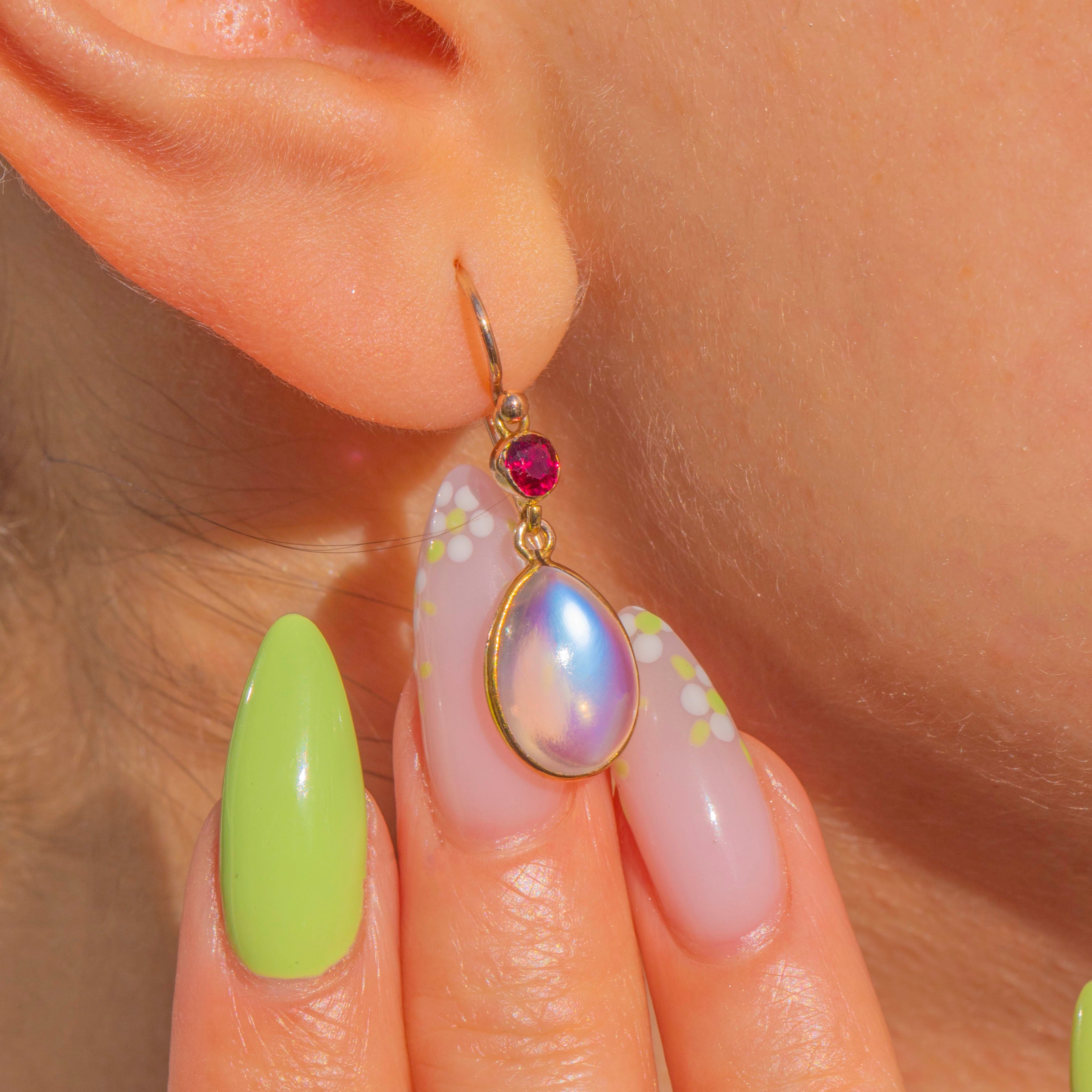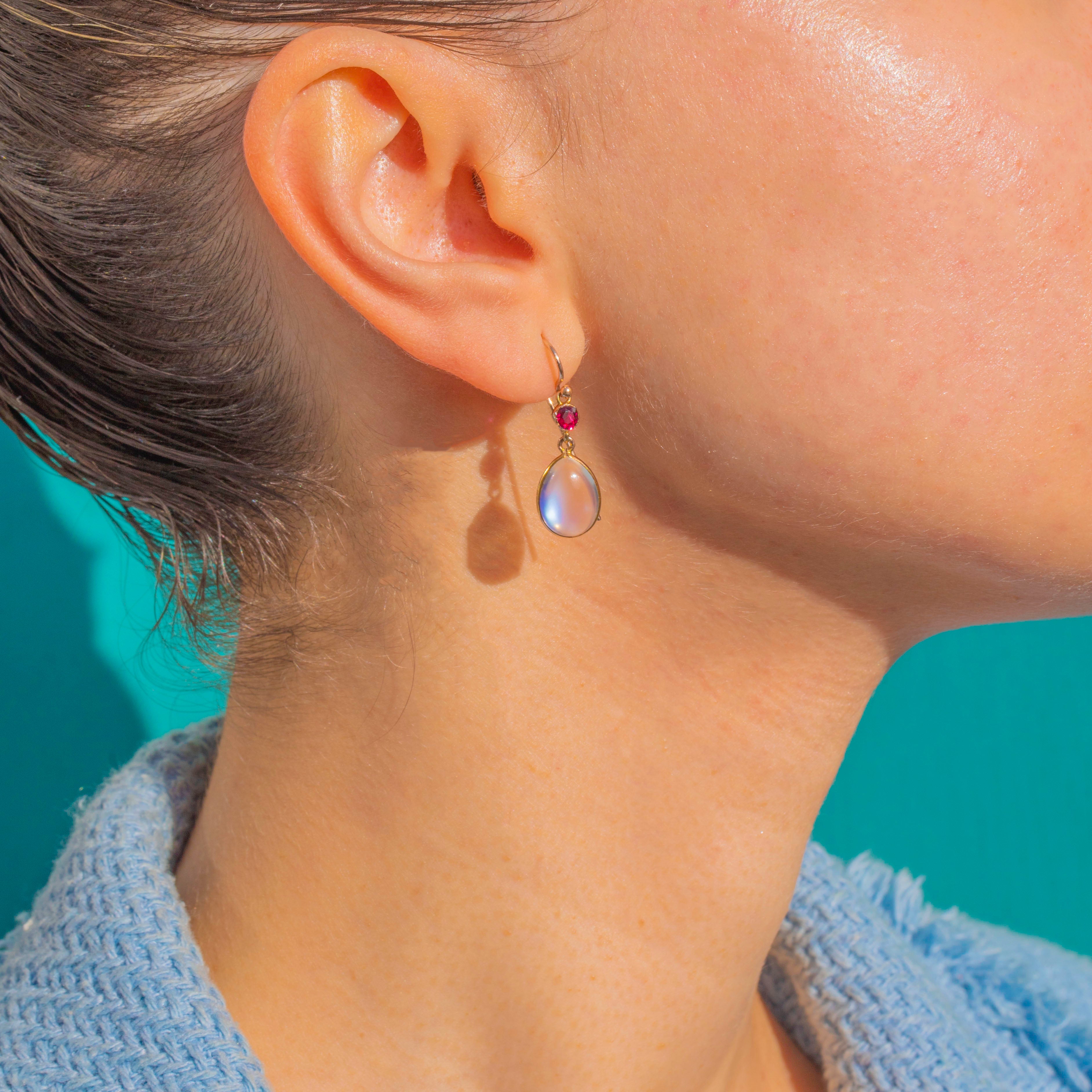 Elegant and romantic, these Edwardian drop earrings marry luminous Moonstone with vivid Ruby in glowing 9ct Gold. Each articulated drop features a domed pear Moonstone cabochon displaying a soft, ethereal sheen, crowned by a bright faceted round Ruby for a delicious pop of colour. Sleek full bezels and graceful French shepherd hooks complete the refined silhouette, allowing the stones to sway and catch the light with every movement.