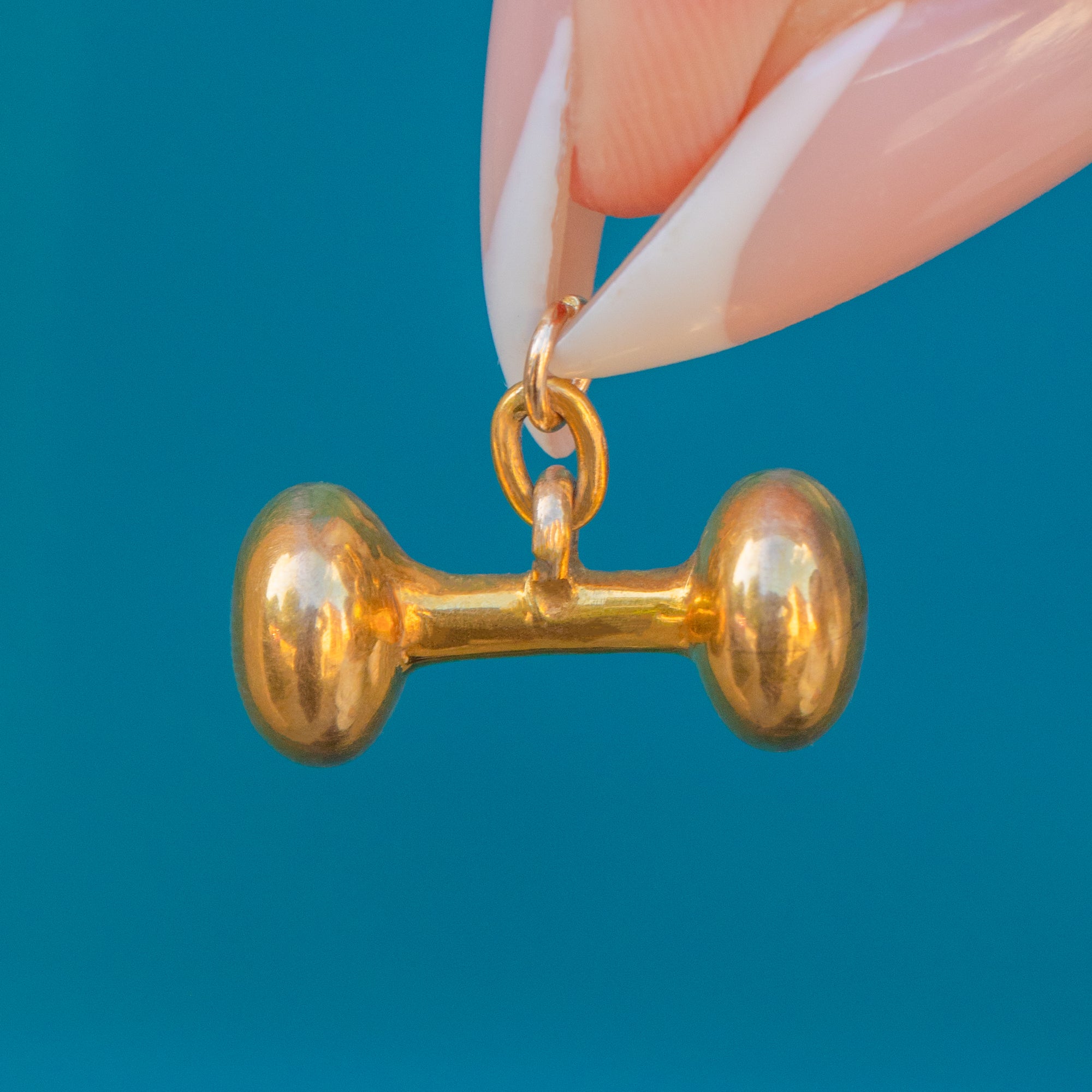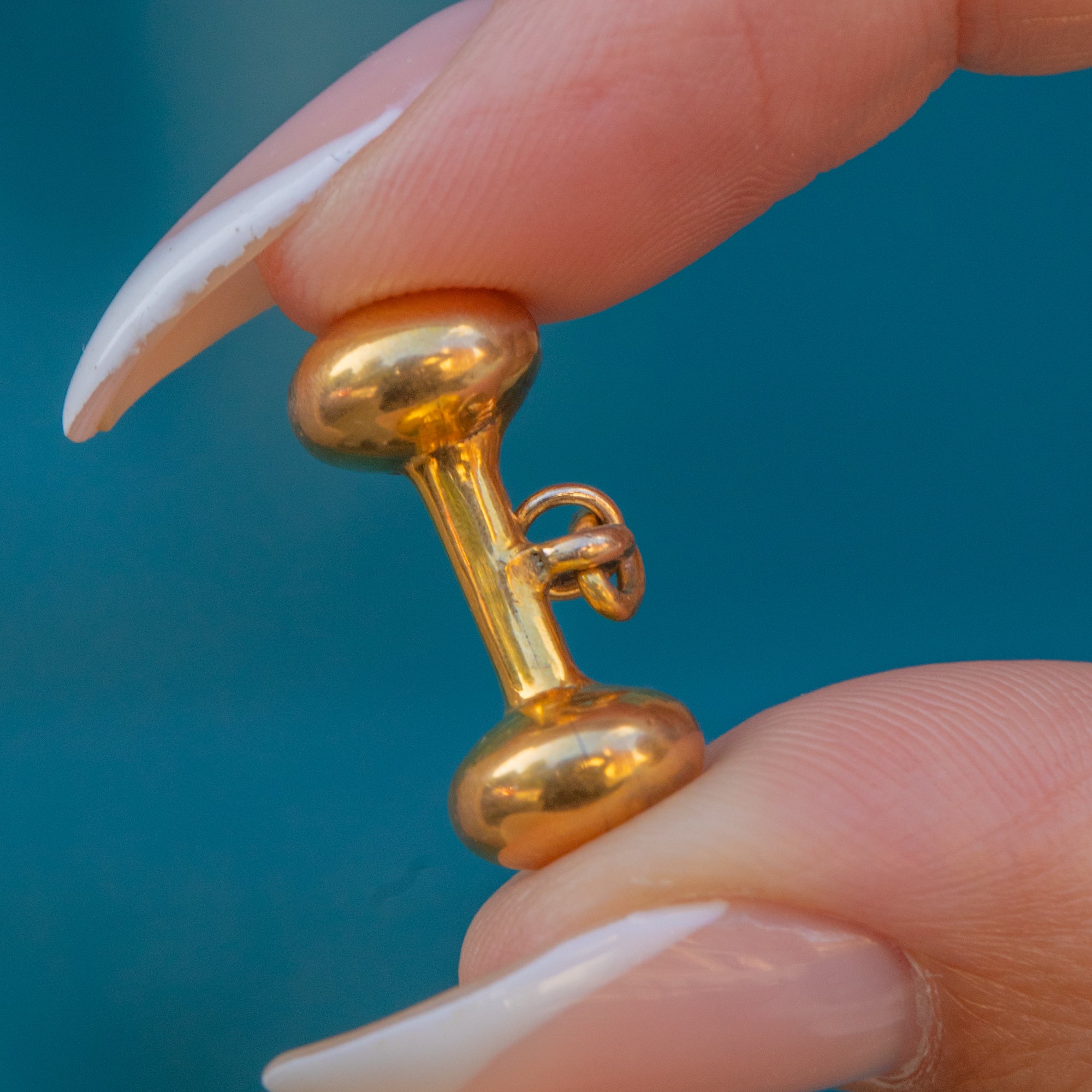 This antique Victorian T-bar charm has a wonderfully chubby, compact design. Crafted in 9ct Gold, the bar is slightly rounded, giving it a bold and tactile feel despite its petite size. Perfect for styling on a bracelet or charm necklace, this timeless design evokes the classic Victorian Albert chains it once accompanied.