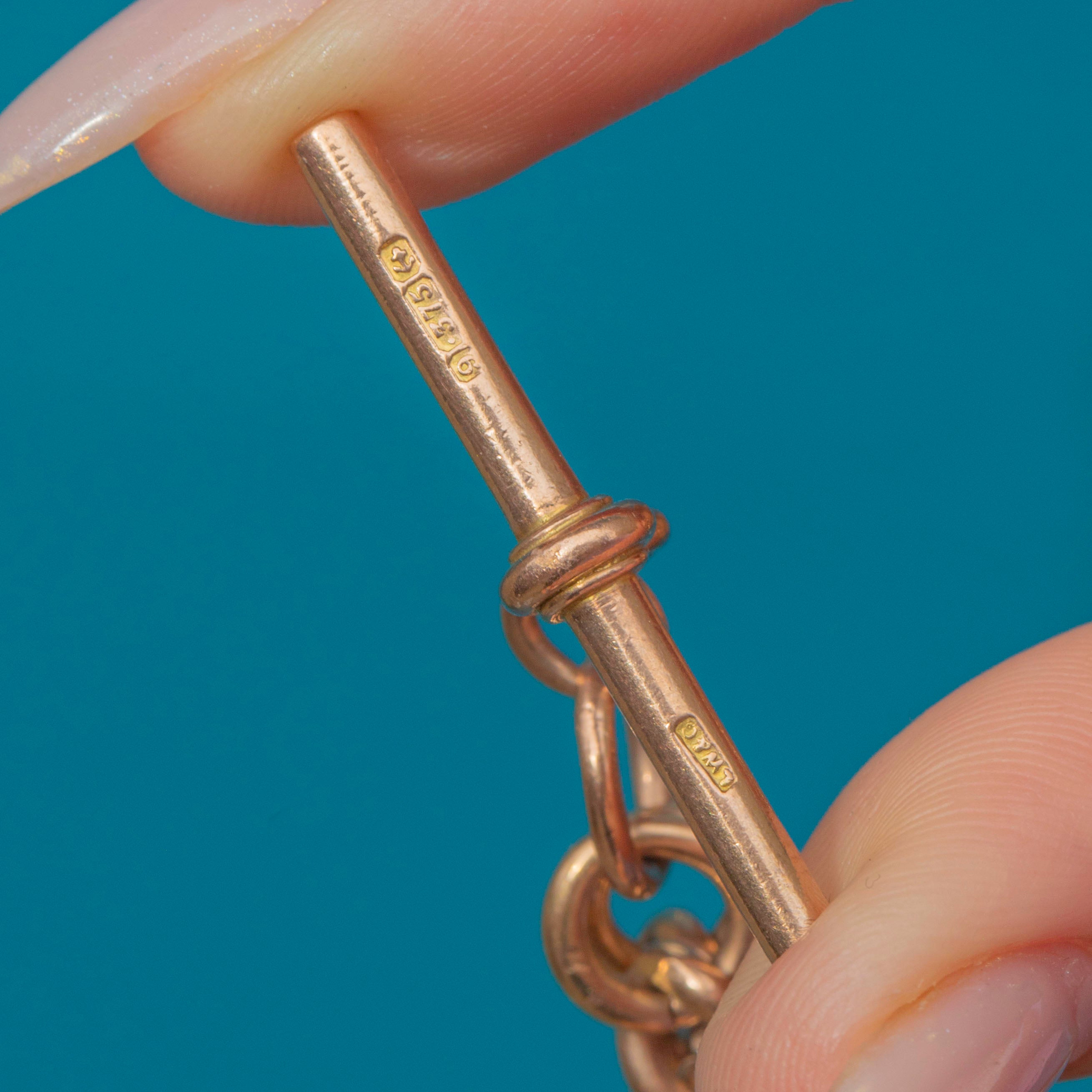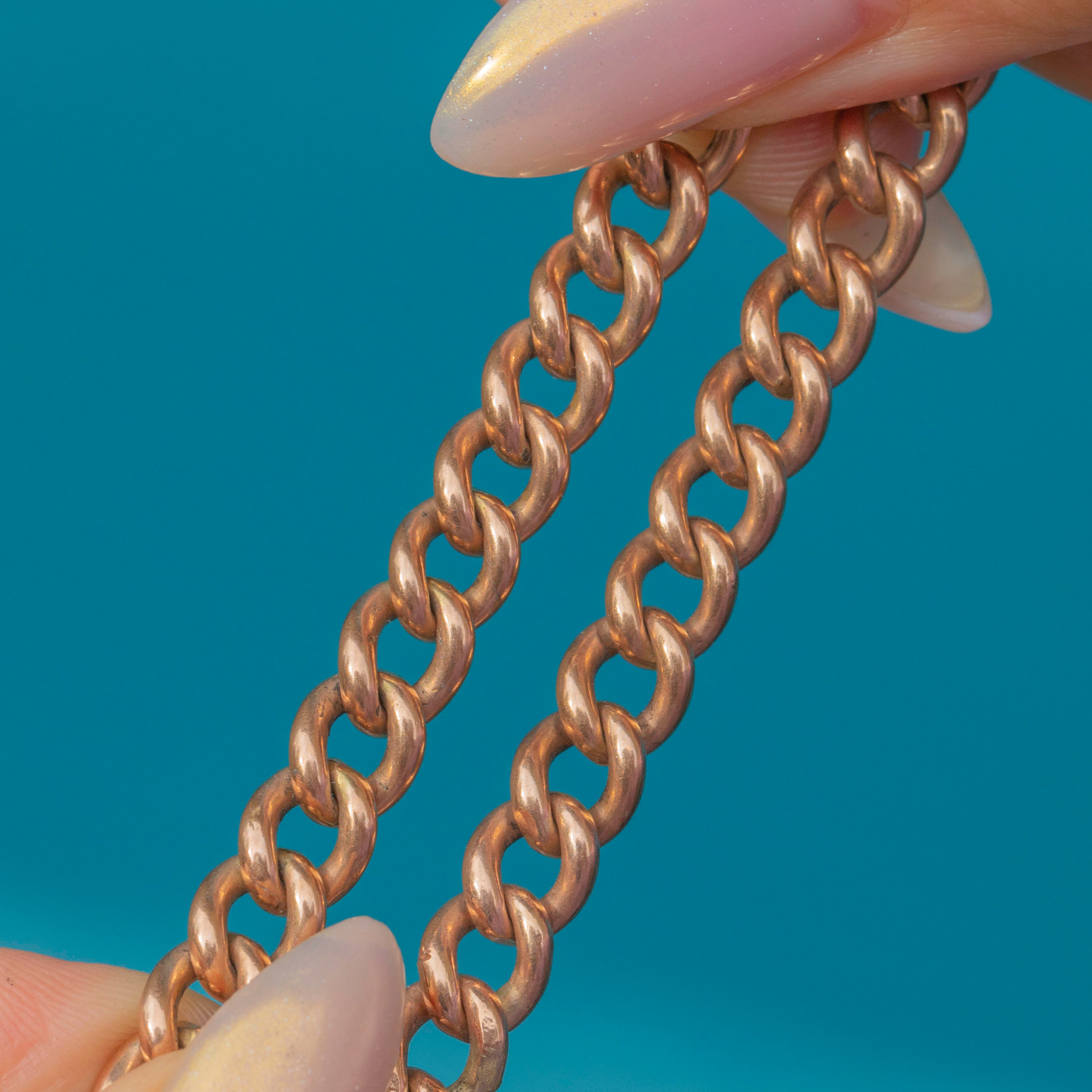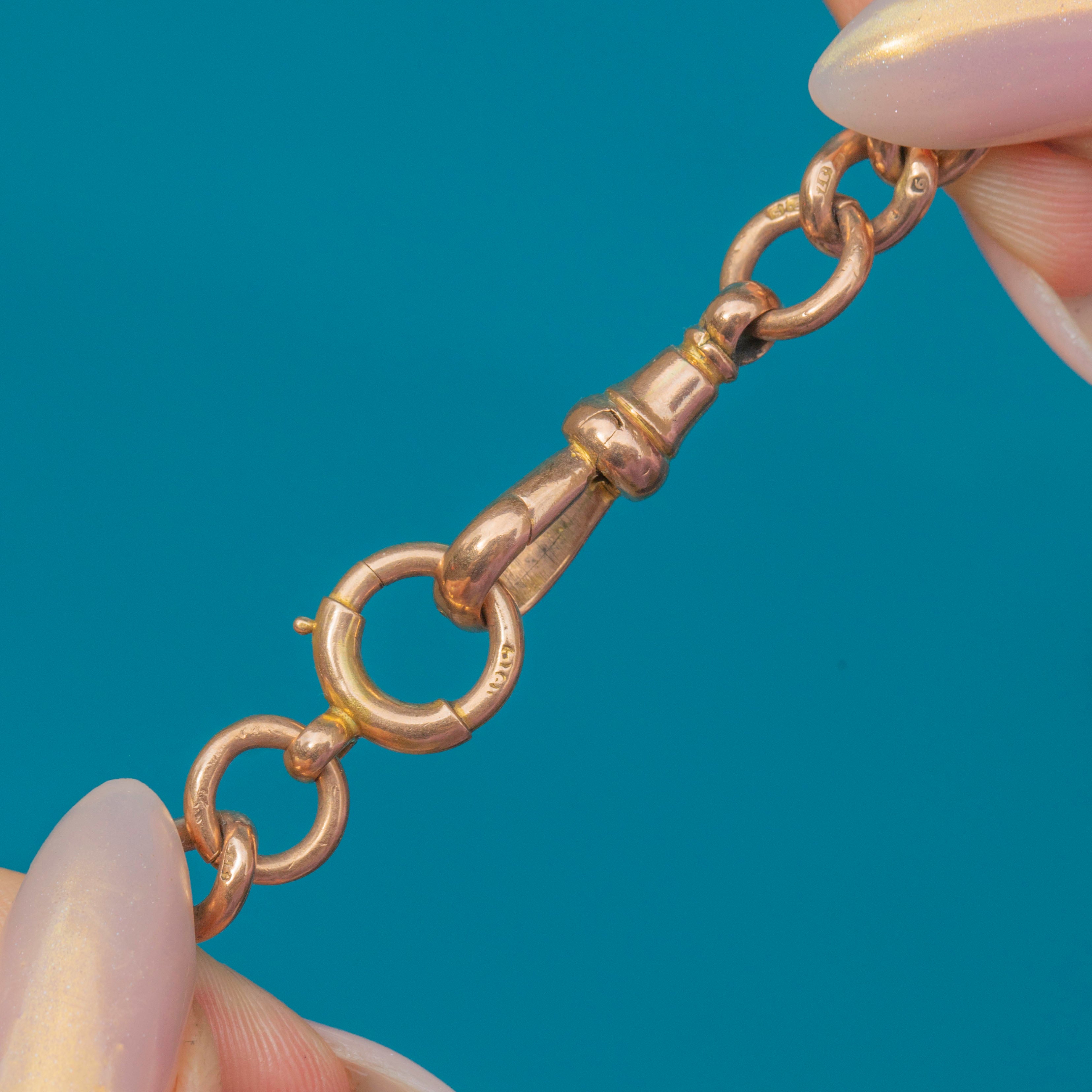 EXCELLENT: The links are strong and evenly shaped with no wear, thinning, or damage. Both the dog-clip and bolt ring work perfectly, and the Gold has retained a rich antique colour. A superb example of a Victorian Albert chain in outstanding condition.
