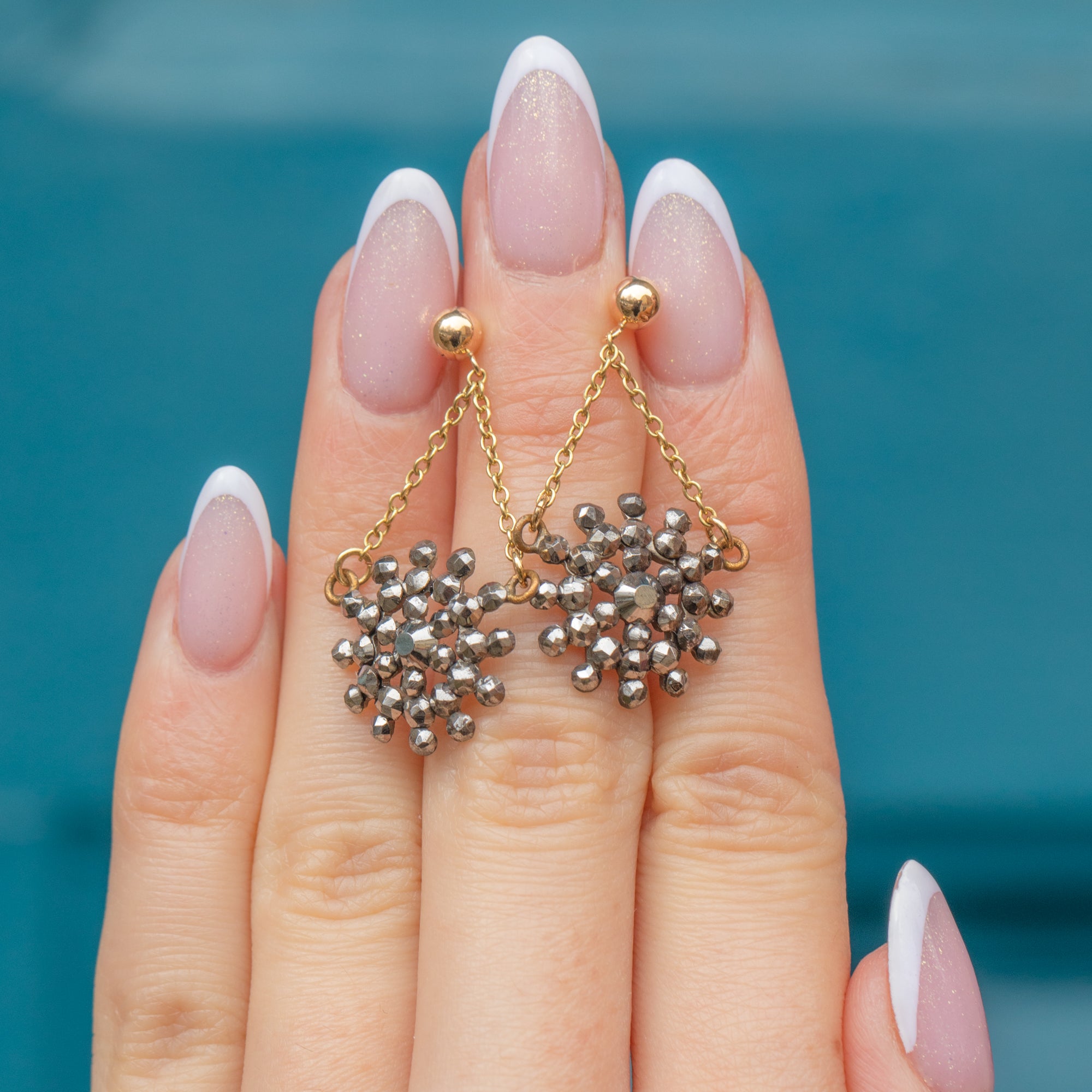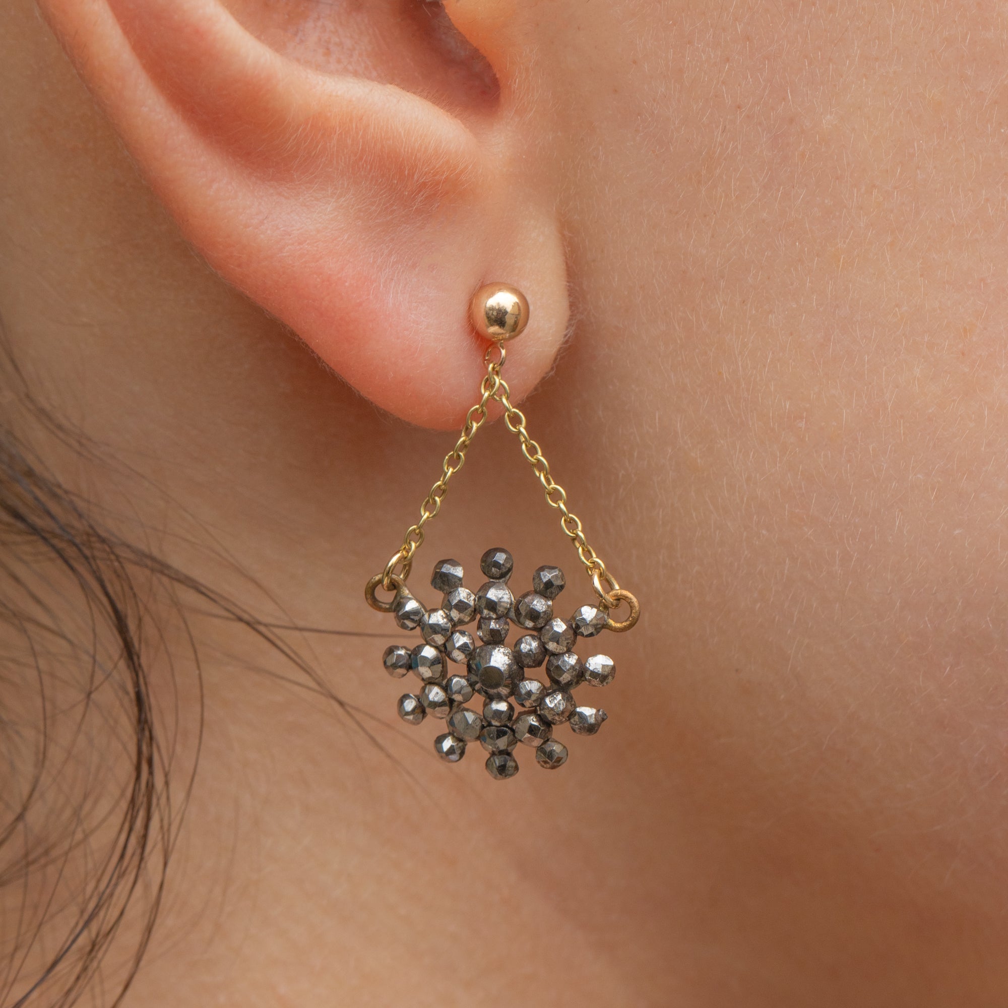 EXCELLENT: These antique 9ct Gold Cut Steel star earrings are in excellent condition. Each Cut Steel bead is present and has been beautifully preserved, with crisp facets that glint in the light. The later added chains and posts are in perfect condition allowing you to wear these standout celestial earrings with the utmost confidence!