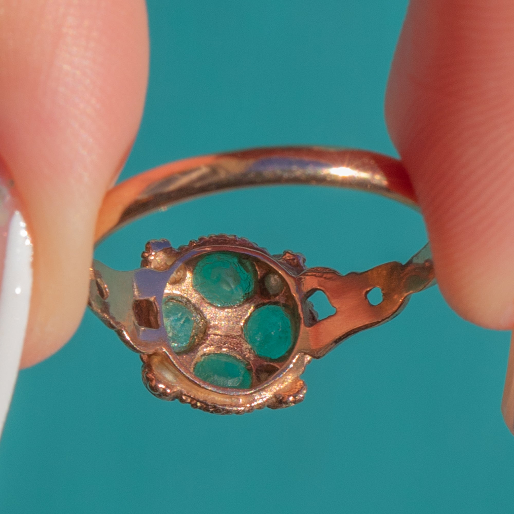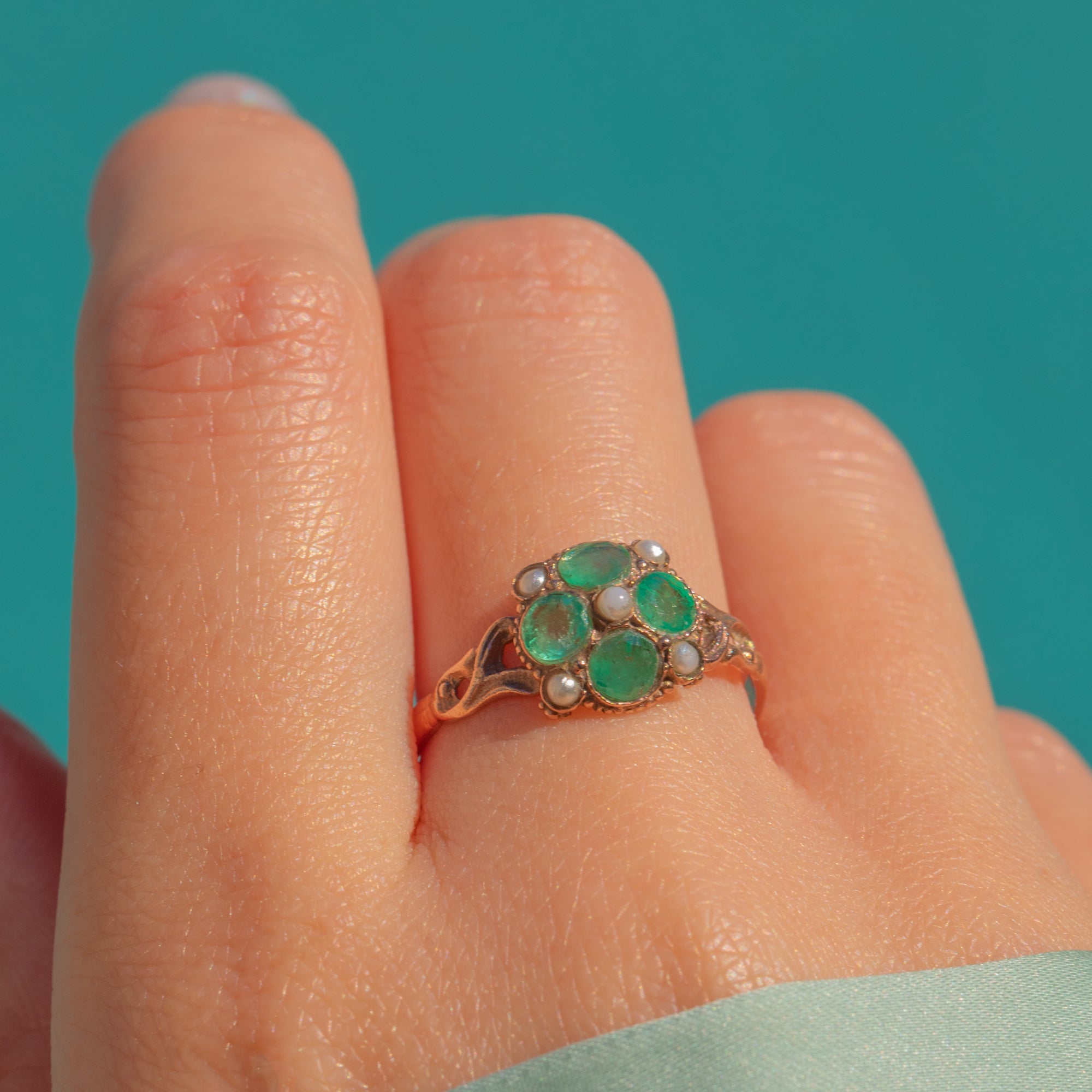 This charming Victorian Emerald and Pearl cluster ring is full of colour, character, and classic 19th-century elegance. Crafted in warm 9ct Gold, the rounded cluster is set with four vibrant green Emeralds accented by delicate Pearls, creating a soft and romantic antique glow.