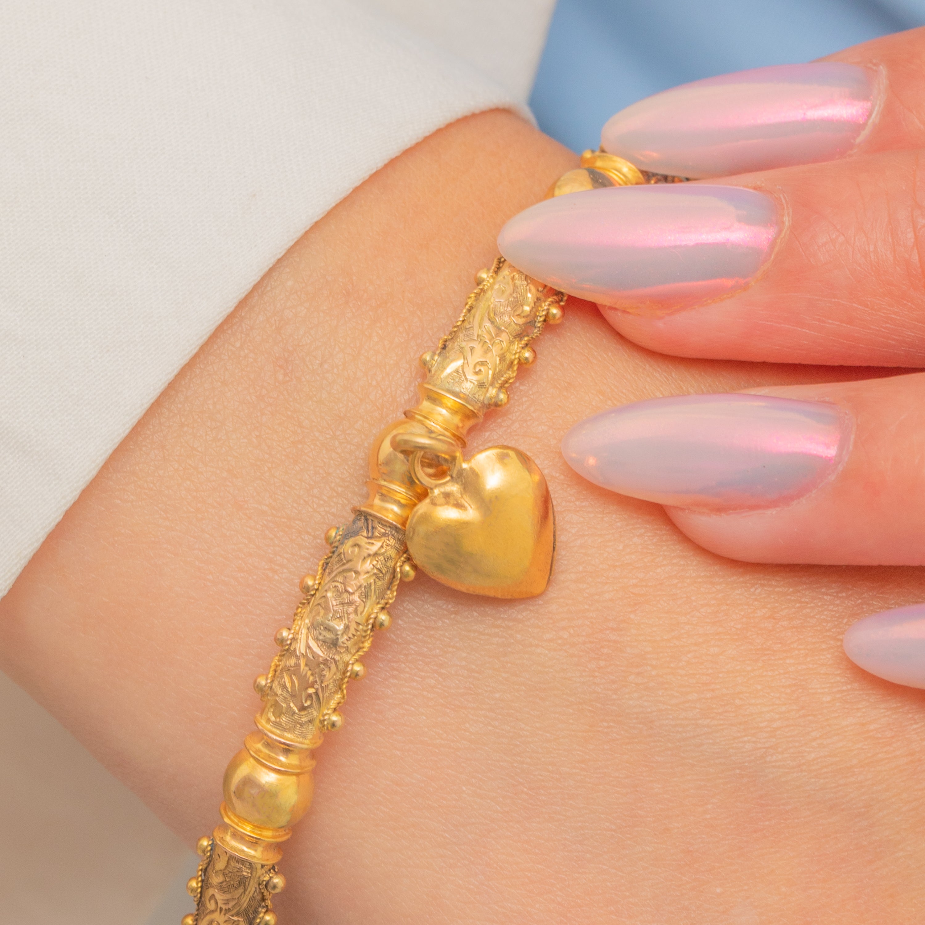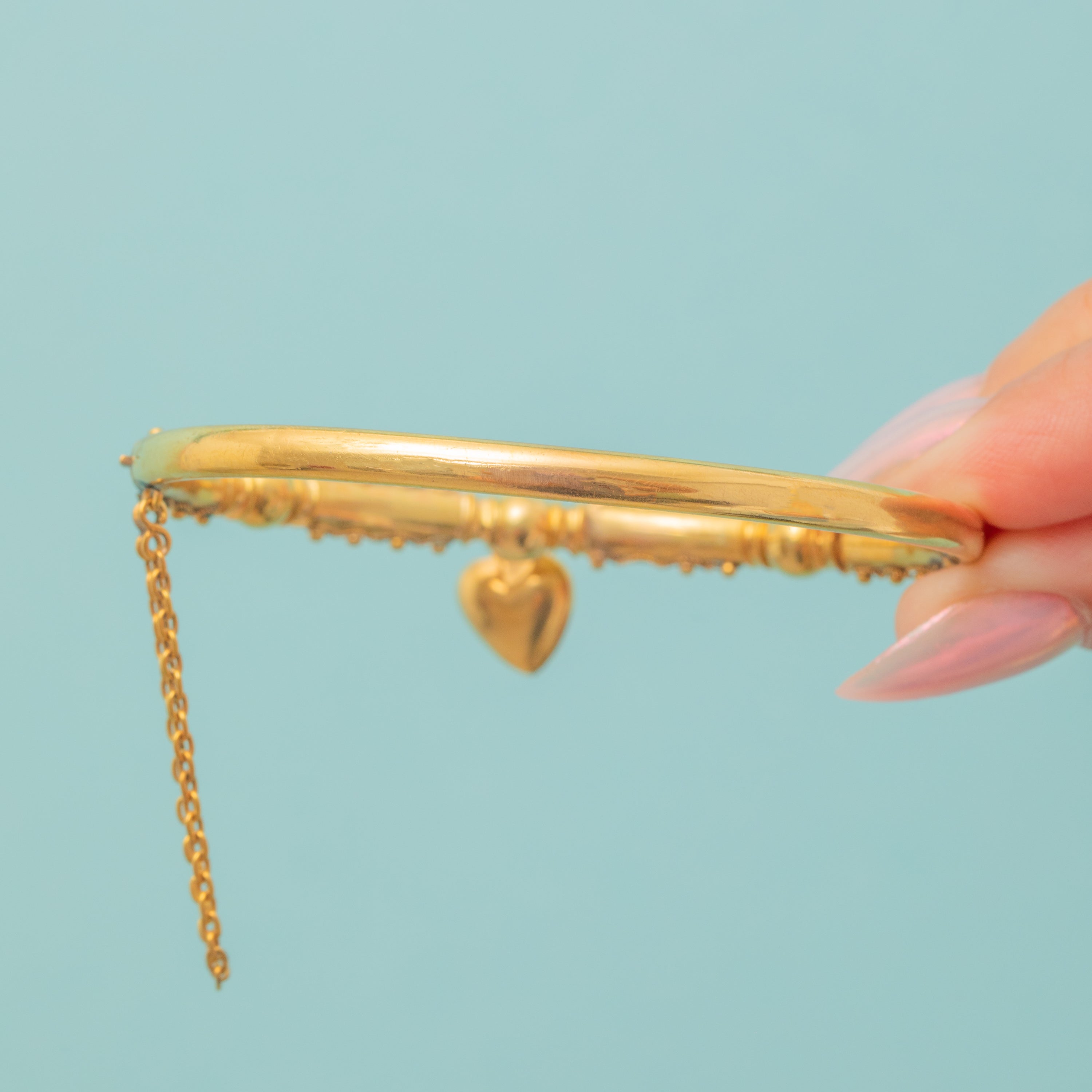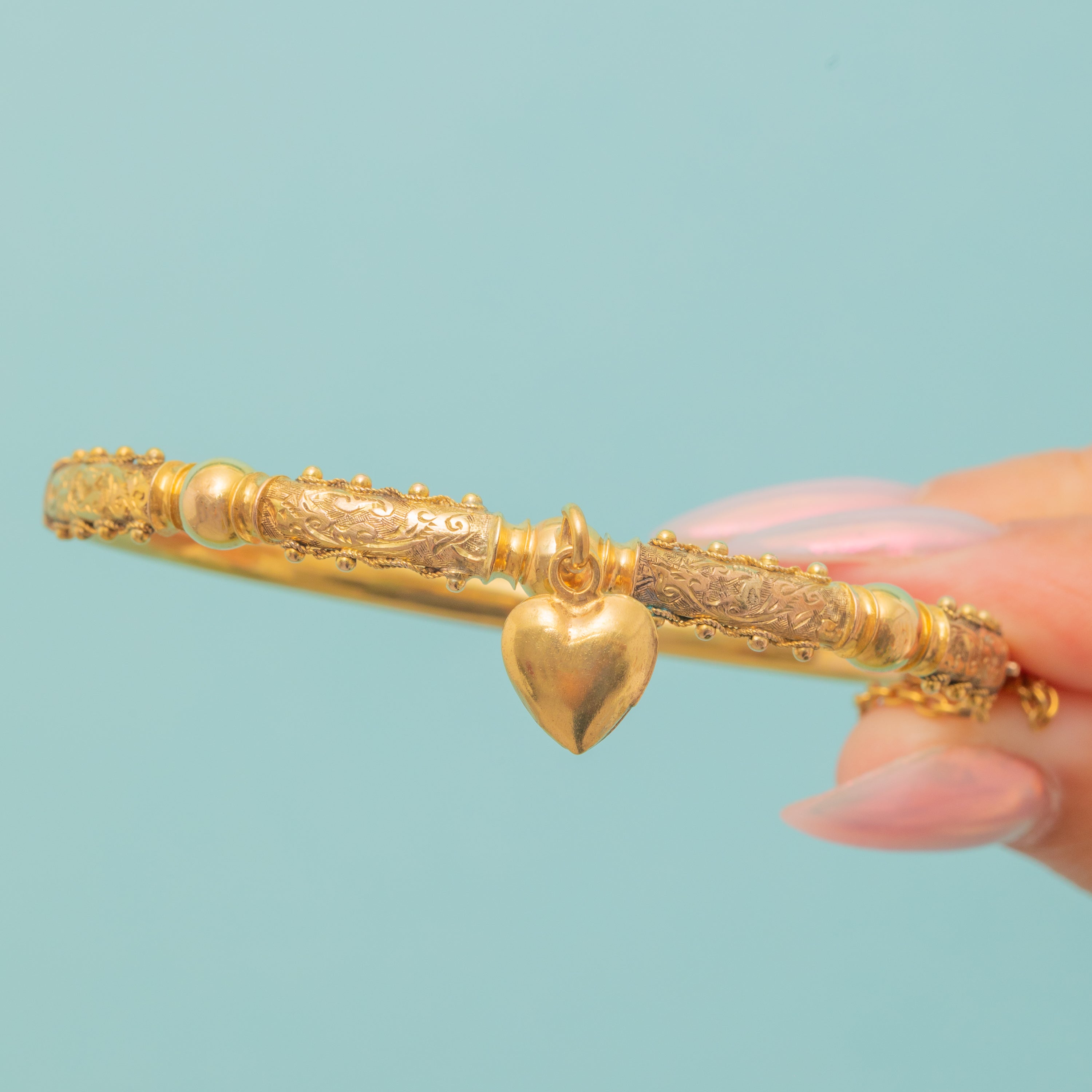 Antique 9ct Gold Engraved Bangle with Puffy Heart Charm