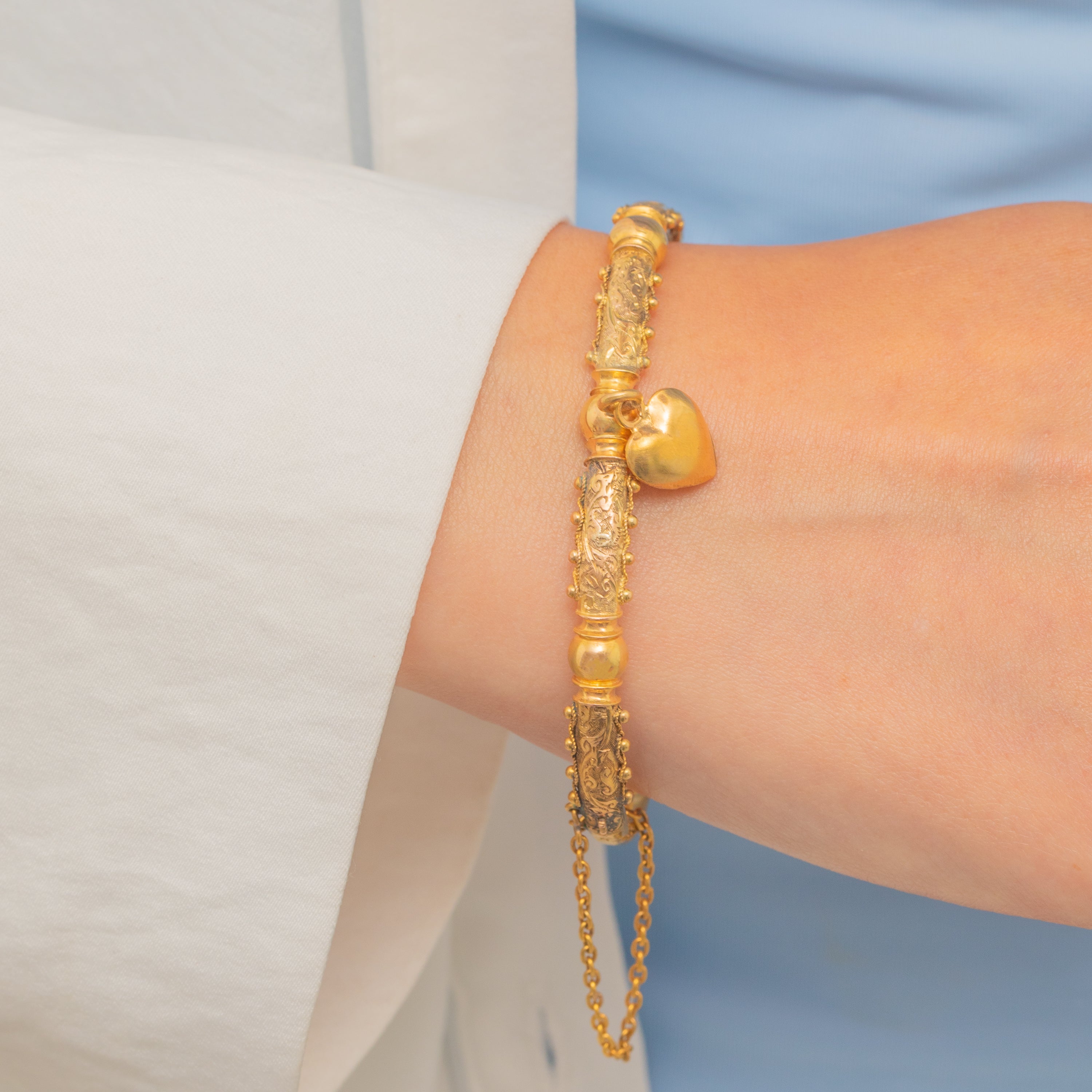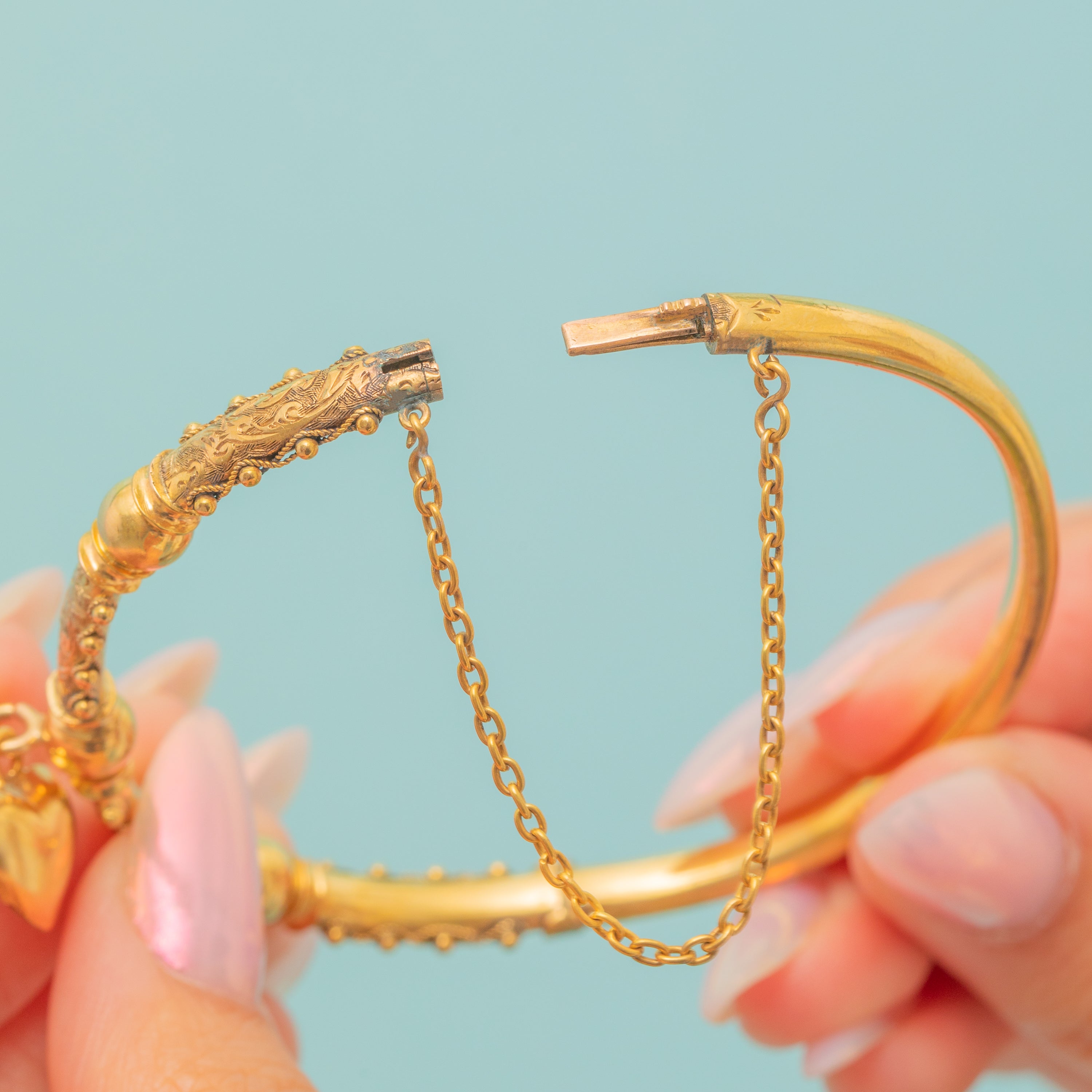 VERY GOOD-EXCELLENT: The Gold is bright and buttery and her engravings have remained crisp. There are some spots of discolouration and light surface wear to the Gold, particularly near the clasp, though this is not overtly evident during wear. With her heart charm securely soldered and complete with a safety chain, you can wear this engraved bangle with utmost confidence!