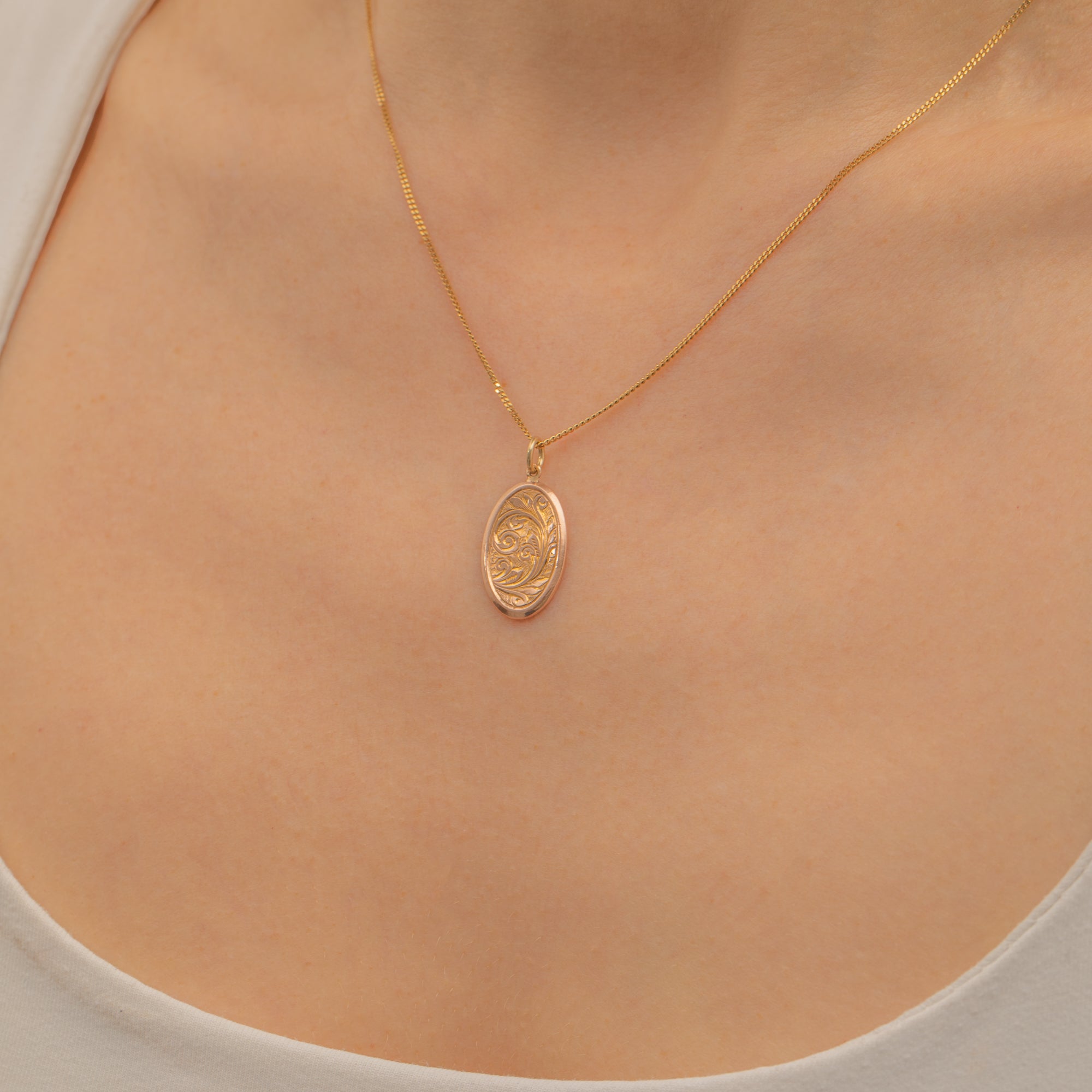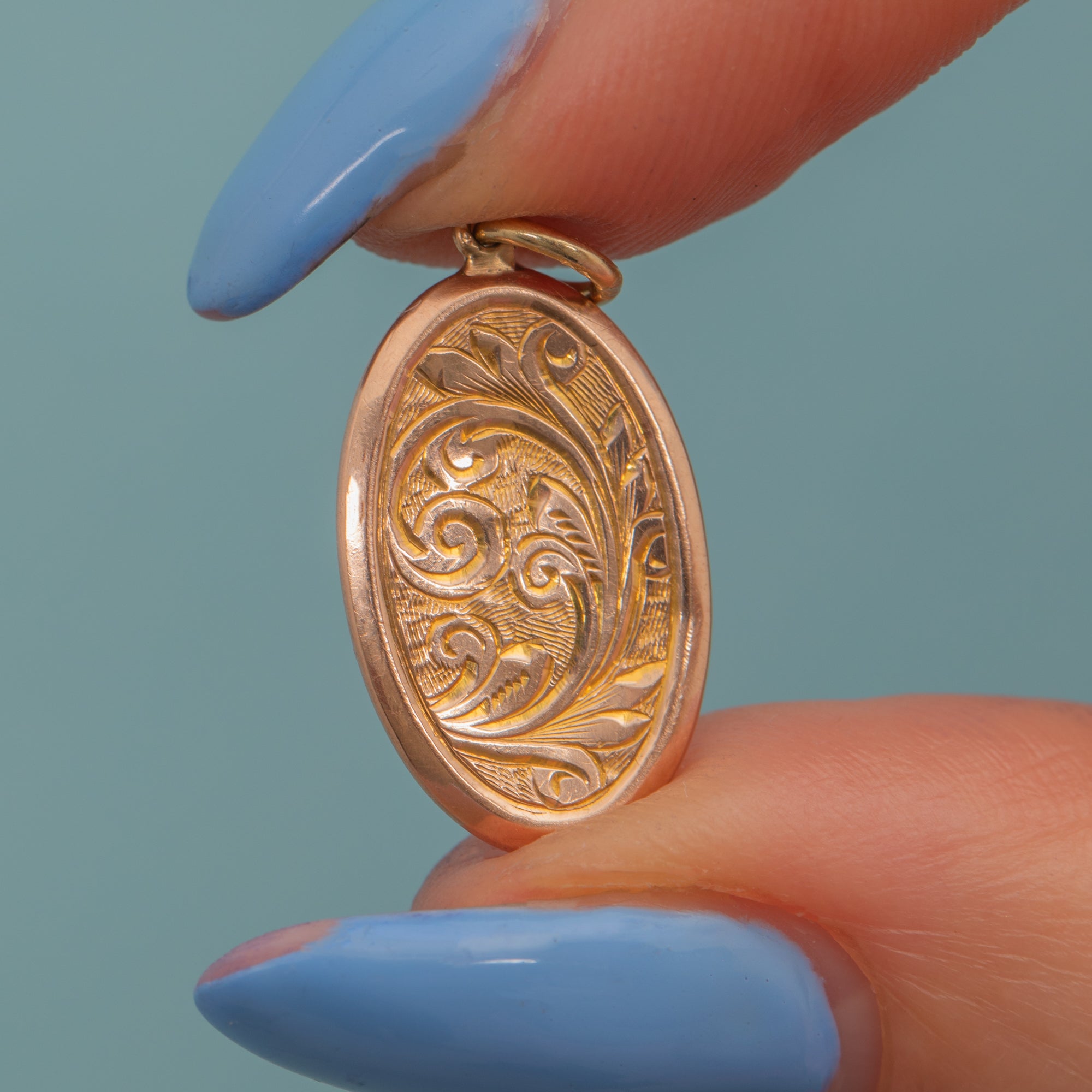 This gorgeously crafted antique 9ct Gold engraved disc pendant will make an enchanting addition to your everyday attire! Displaying ornate acanthus leaf details engraved into buttery 9ct Gold, this dainty treasure is the perfect piece to bring some antique luxury to your necklace stack.
