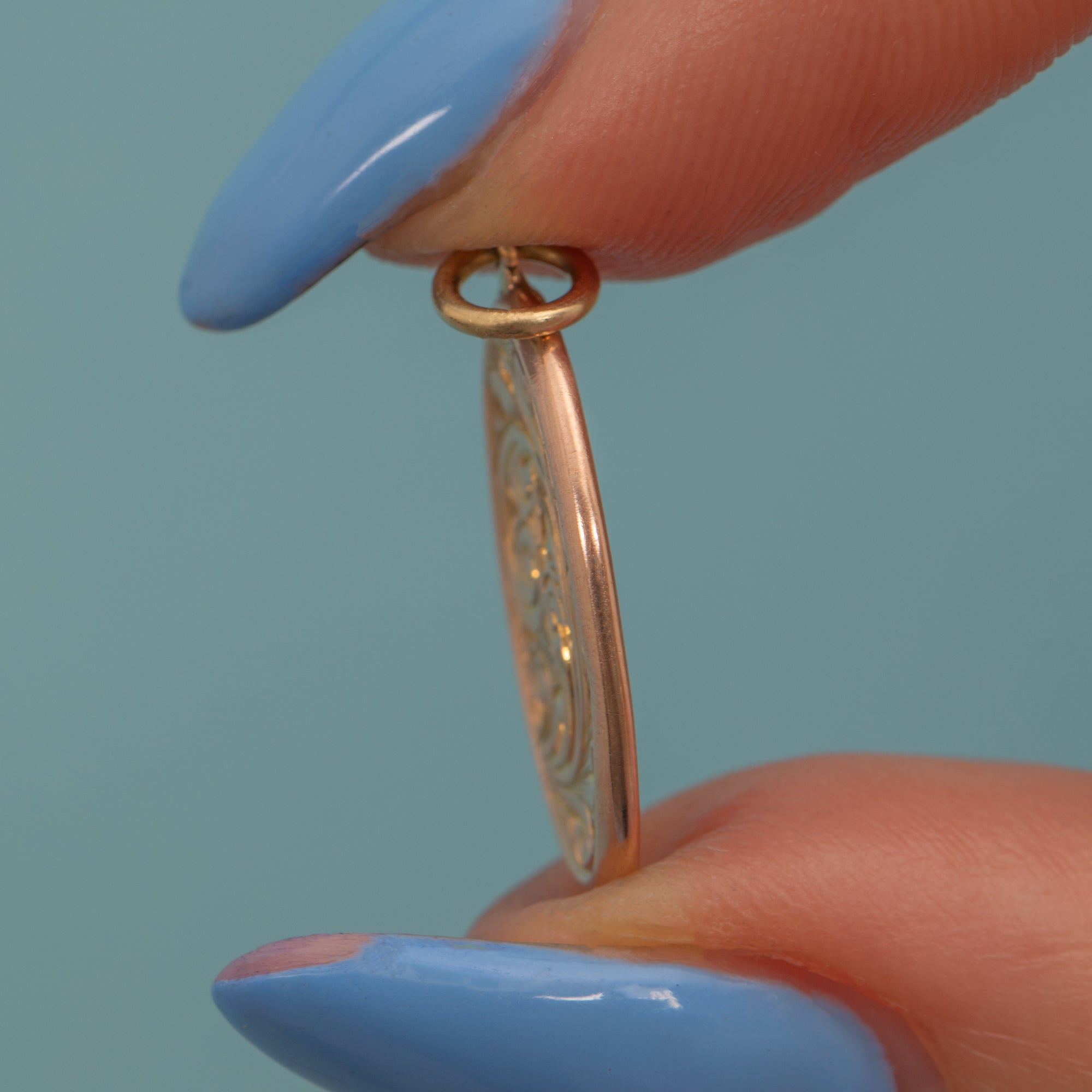 VERY GOOD. This antique 9ct Gold engraved disc pendant is in very good condition. The Gold is buttery and the engraved details have remained clear. Starting life as a cufflink, this pendant does have a ding and some wear on the back, but this is not noticeable from the front. With plenty of wear potential, don't hesitate to make this romantic piece of Victorian jewellery yours!