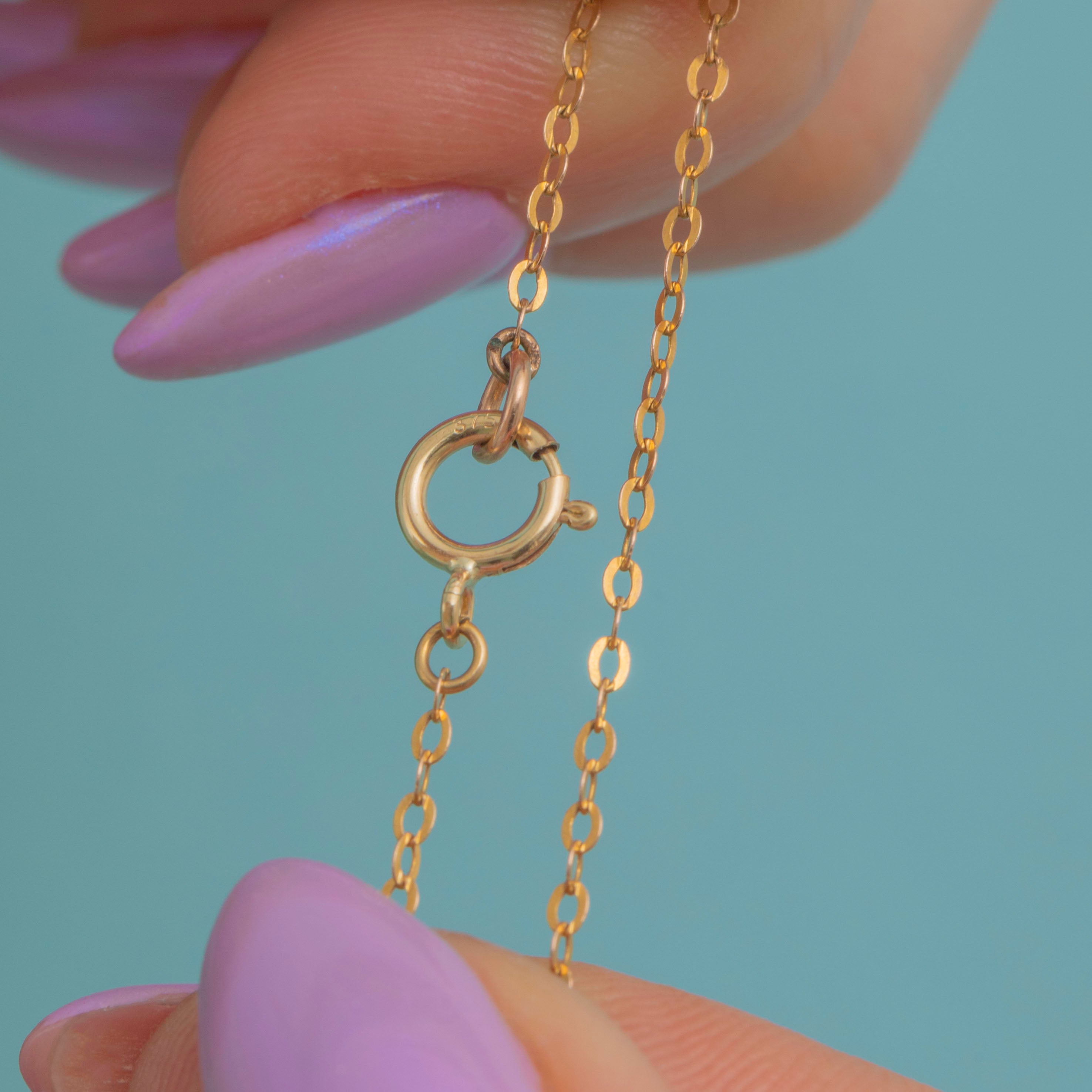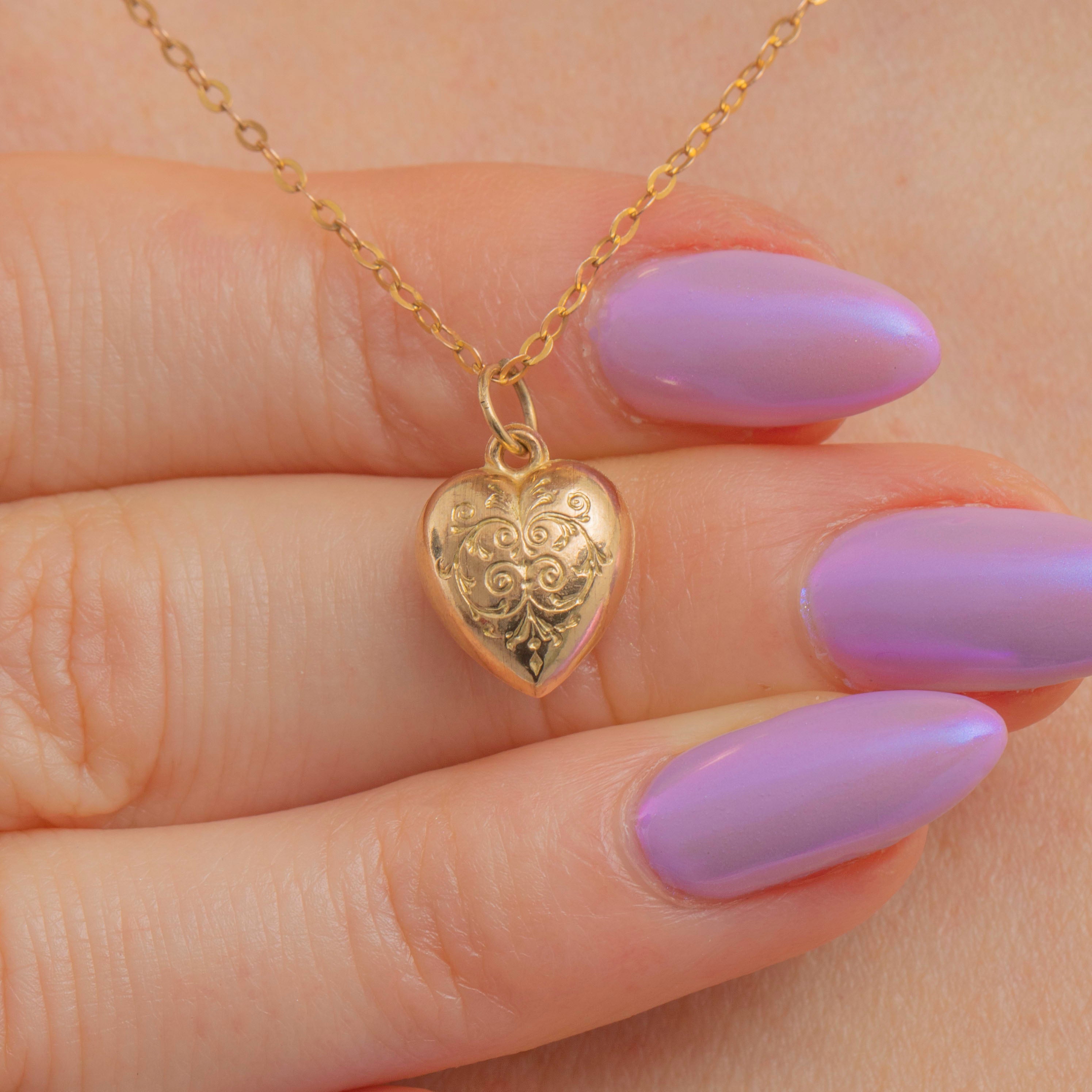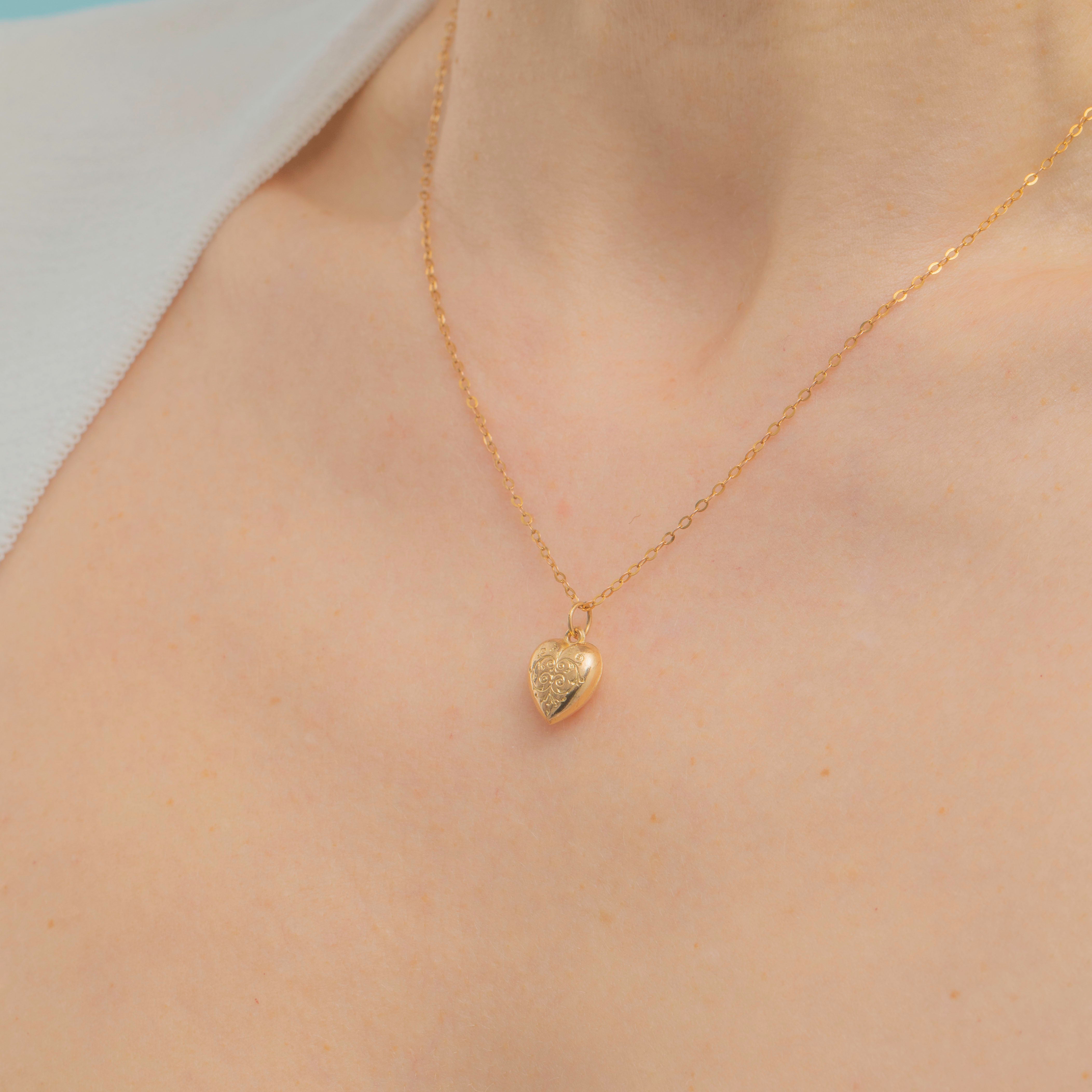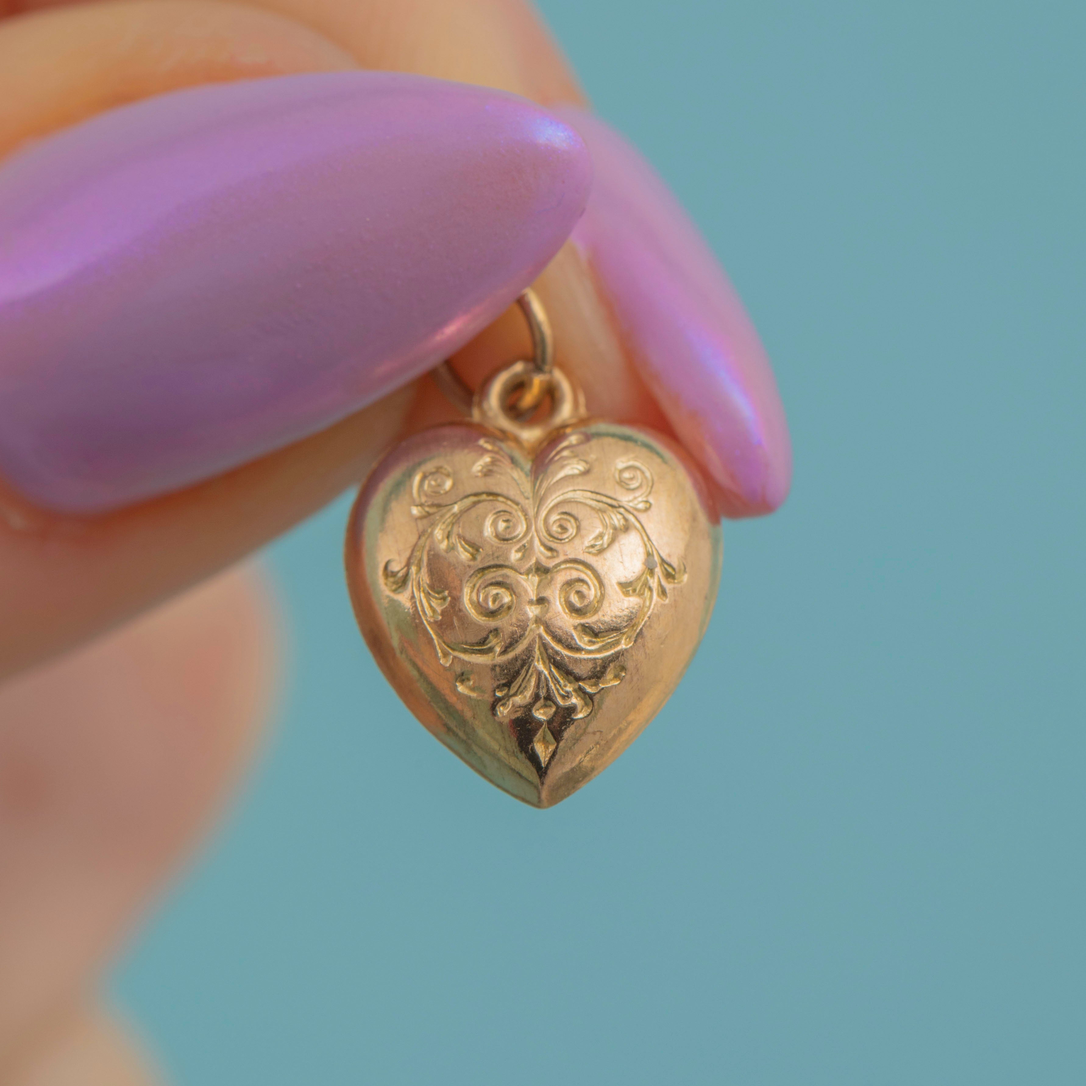 VERY GOOD. This antique engraved 9ct Gold heart charm is in very good condition. The heart is crafted from buttery 9ct Gold that radiates warmth from her puffy form. The engraved details are crisp and clear, despite being over 100 years old! Her gorgeous chain rests beautifully between your collarbones, while there some wear to the colour of the Gold next to the bolt ring, the rest of the chain is bright and saturated with minimal wear. Victorians are praised for their sentiment and symbolism within jewellery, and this heart charm is certainly no exception!