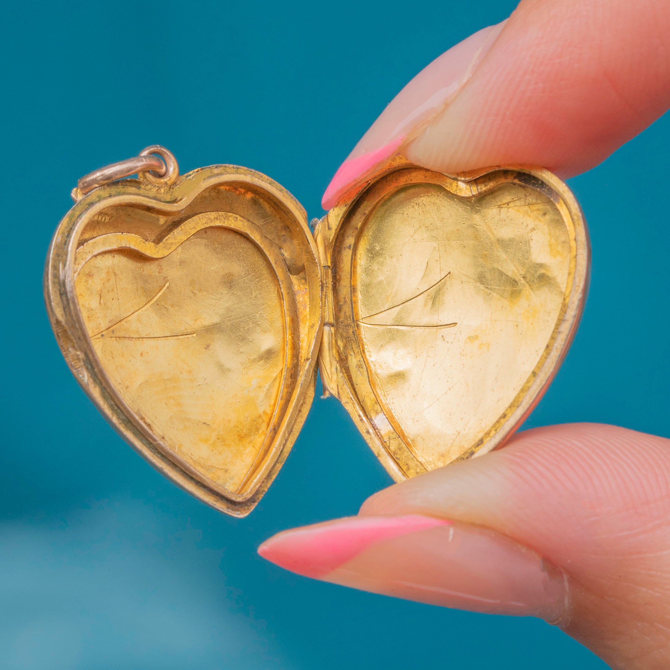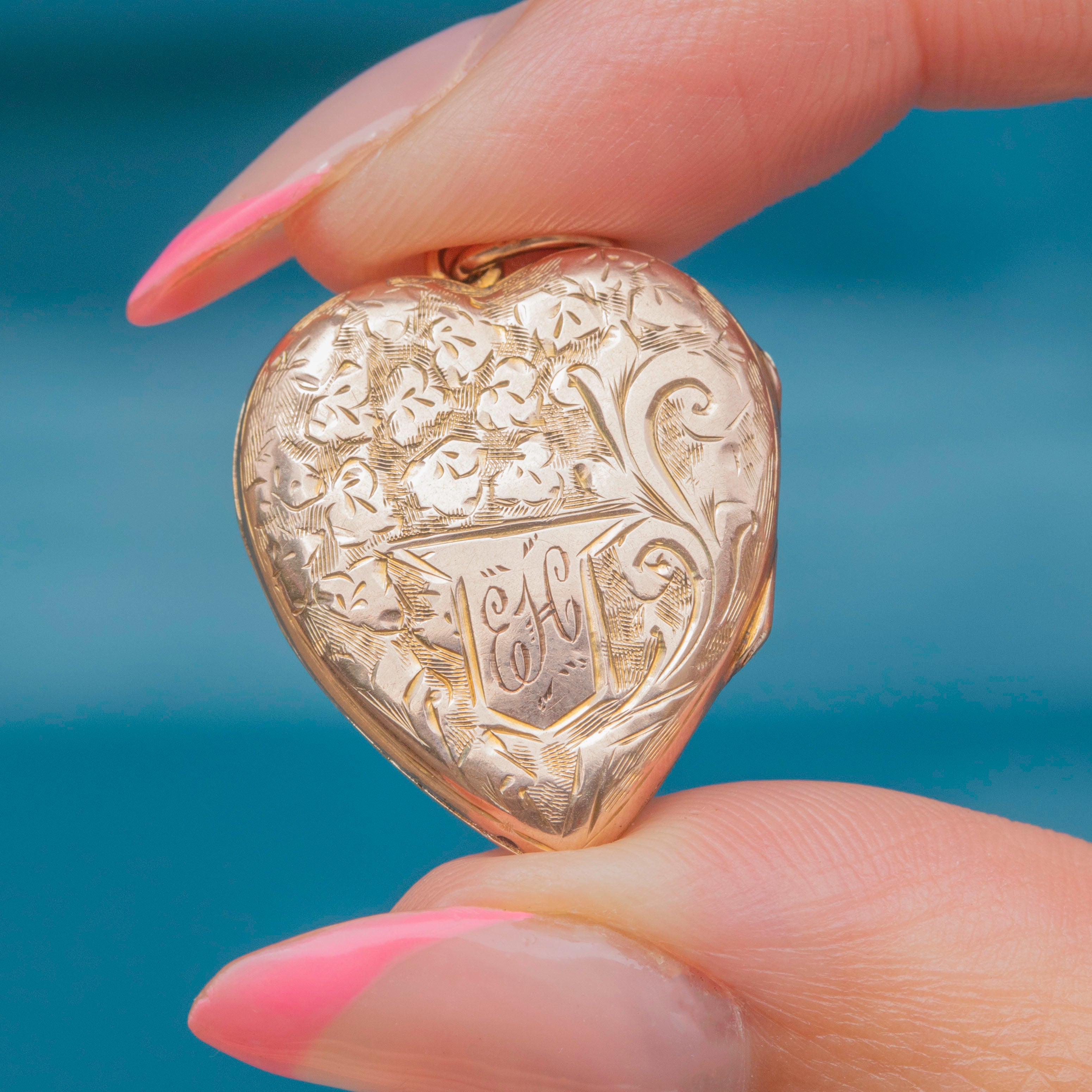 VERY GOOD-EXCELLENT: This Victorian 9ct Gold engraved heart locket is in great condition. The Gold is bright and buttery and her engravings have remained crisp. There are some small signs of wear inside the locket, though this is expected with age. With a securely soldered jump ring, she can be worn with utmost confidence!