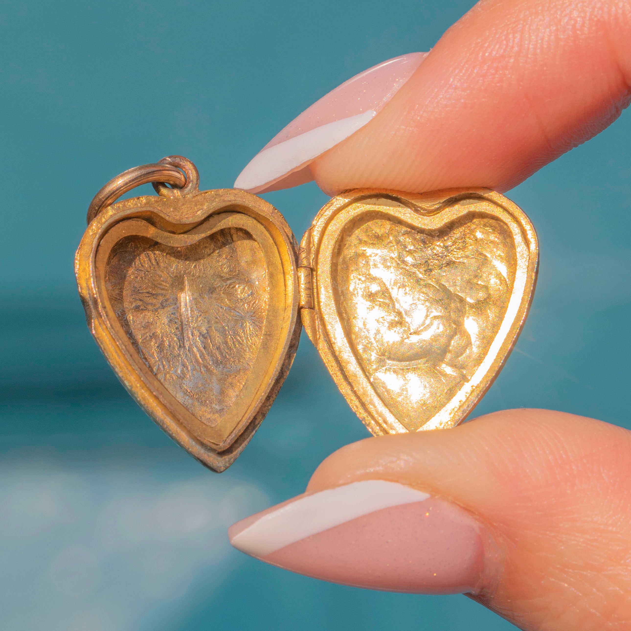 EXCELLENT: This antique 9ct Gold engraved ivy leaf heart locket is in tip-top condition. The engraved details are crisp and the Gold is bright. The locket opens easily and closes securely, allowing you to wear the locket with confidence. The original frames are intact inside, so you can easily add photographs of your beloved.