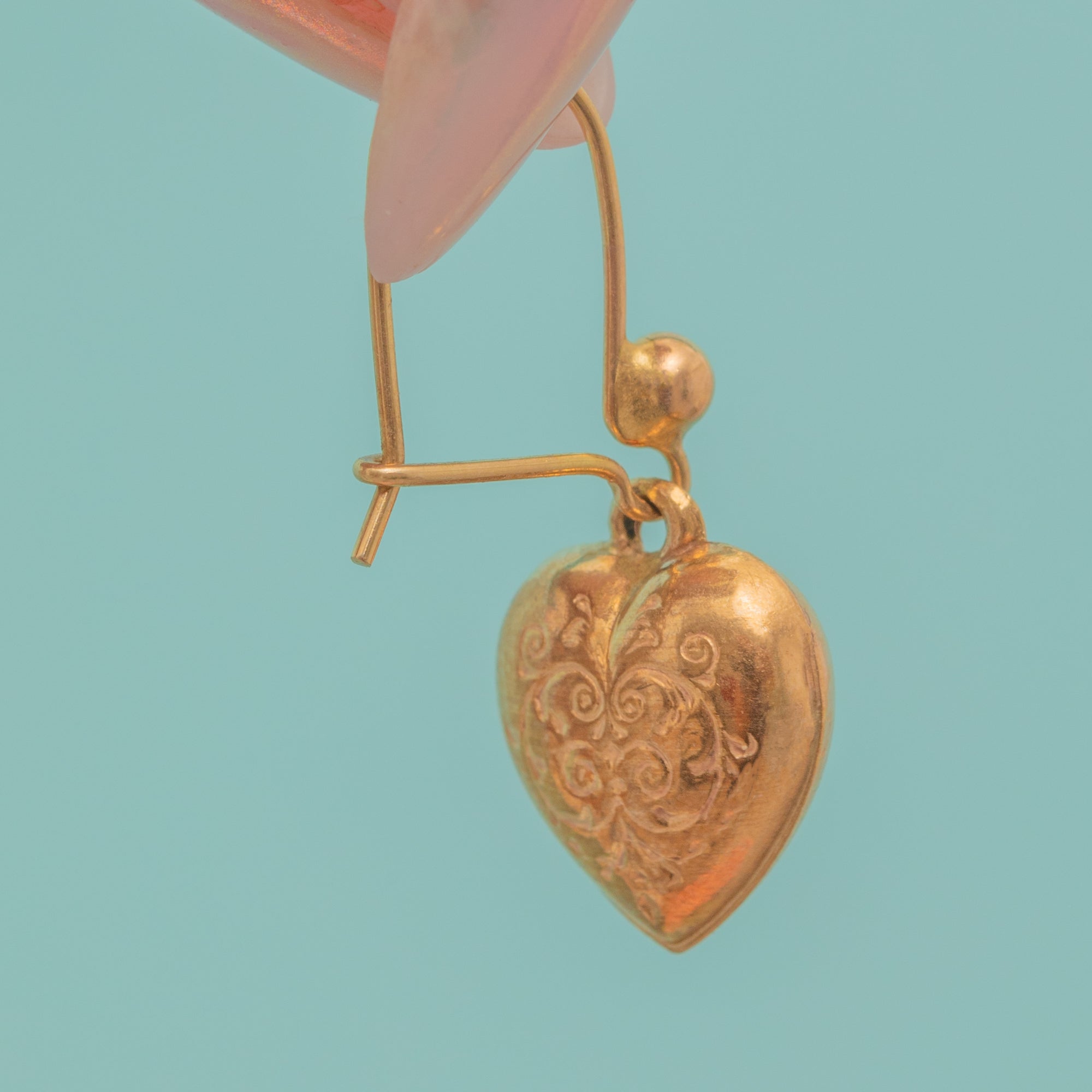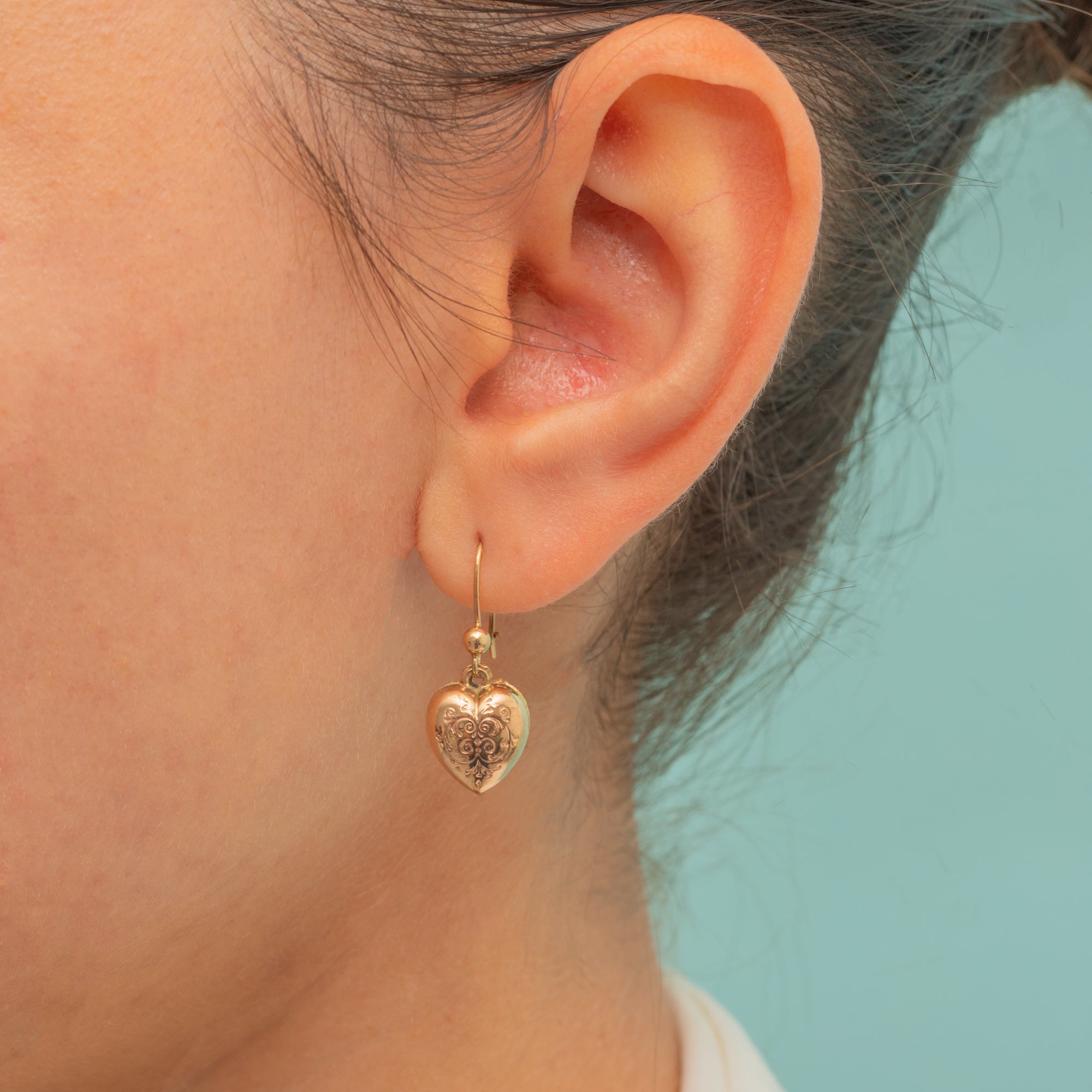 These antique 9ct Gold engraved puffy heart drop earrings are delicate delights! A cute staple pair perfect for everyday wear, each earring is engraved with gorgeous acanthus leaves and is crafted from buttery 9ct Gold that gleams exuberantly under sunlight.
