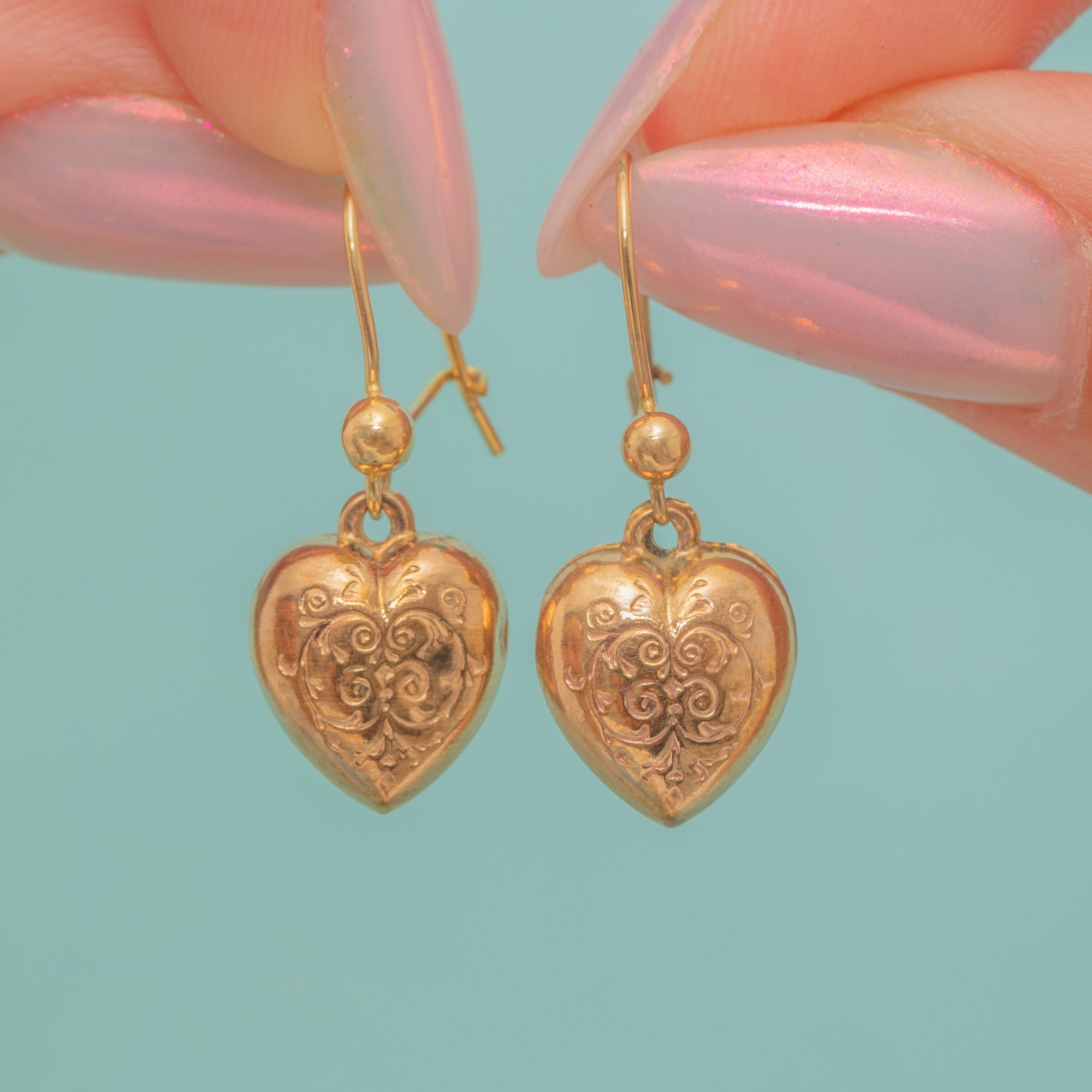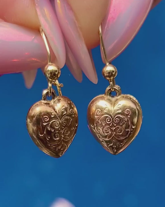 Antique 9ct Gold Engraved Puffy Heart Drop Earrings