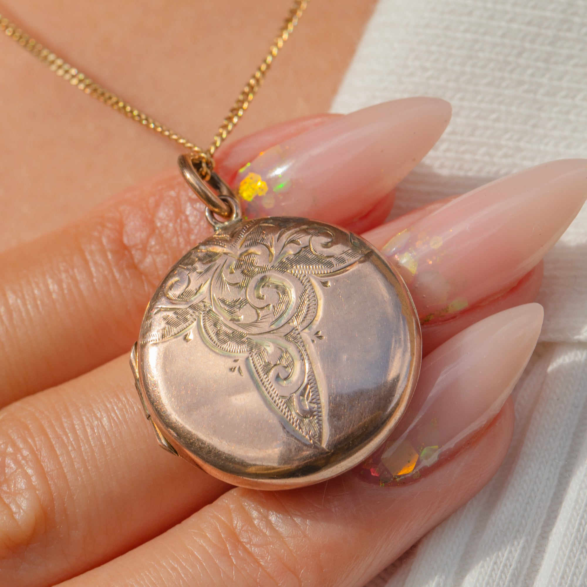 This charming Edwardian round locket is a classic, wearable keepsake in warm 9ct Gold, finished with elegant scrolling engravings across the front and back. It’s the kind of piece that feels instantly personal—perfect for a pair of tiny photographs or a little memento kept close to the heart.
