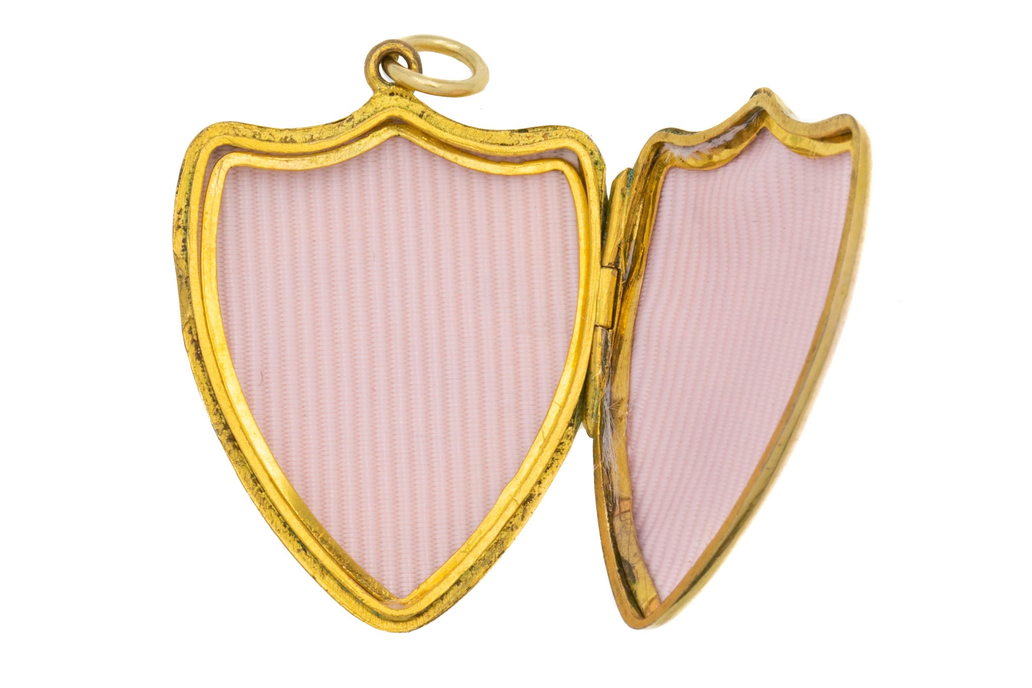 VERY GOOD. This antique Gold engraved shield locket is in very good condition. The Gold is bright and the body of the locket is free from any chips or dents to note. Inside there is some slight wear, commensurate with age but this does not detract from her overall beauty. She comes complete with two frames, perfectly matching her shield shape, allowing two photos to be safely kept inside. The doors do close but due to her grand age can sometimes open slightly, she is still functional but needs to be handled with care. We feel she would make a great addition to your antique jewellery collection!