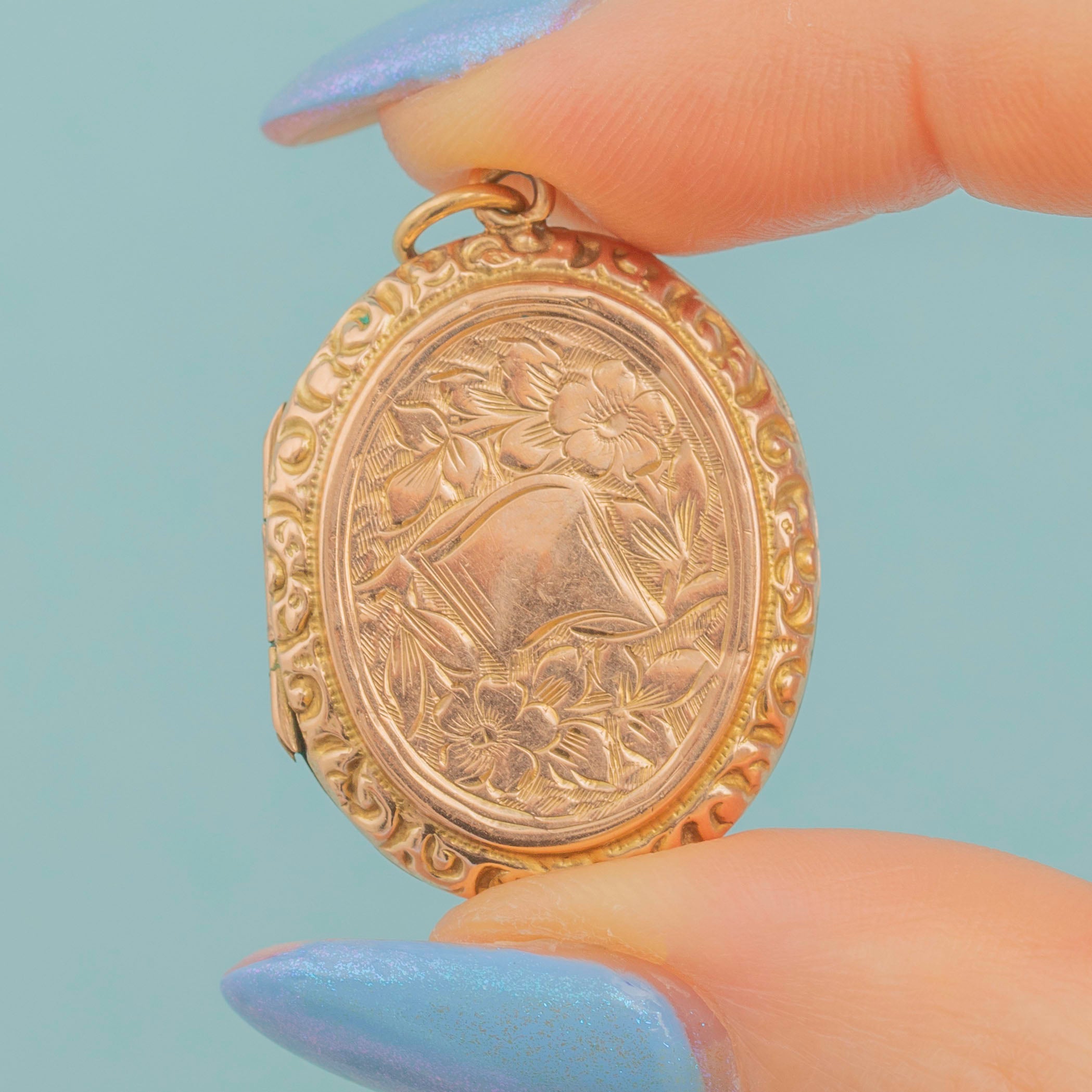 Antique 9ct Gold Forget-Me-Not Engraved Oval Locket