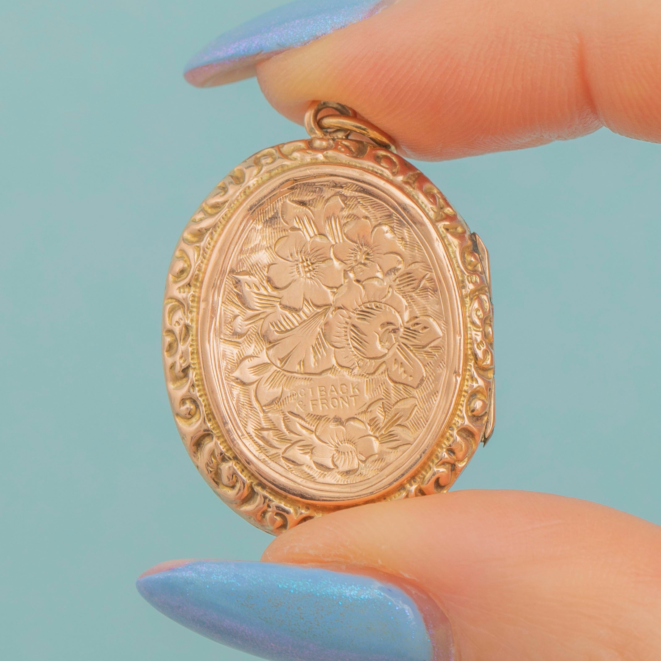 Bursting with romantic sentiment, this antique 9ct Gold forget-me-not engraved oval locket would make a lovely gift! Symbolising everlasting love, the finely engraved forget-me-nots span both sides of the locket with a blank cartouche on one side, to which you could add a personal engraving, framed by an embossed border for a decorative finish.