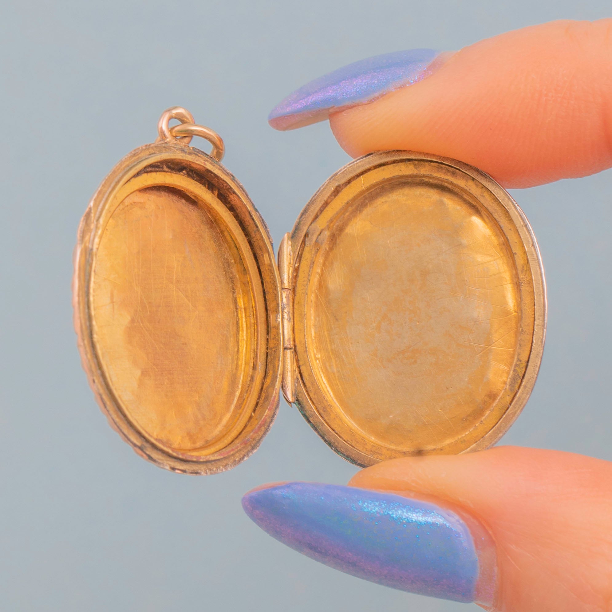 VERY GOOD. This antique 9ct Gold forget-me-not engraved oval locket is in very good condition. The Gold has an even buttery hue and the engraved details have remained crisp. The body of the locket has a few minor dings, but these are mainly visible on the inside and do not affect the integrity of the piece. Both original frames are still present and although the locket requires a firm push to open, it will keep two photographs securely in place.