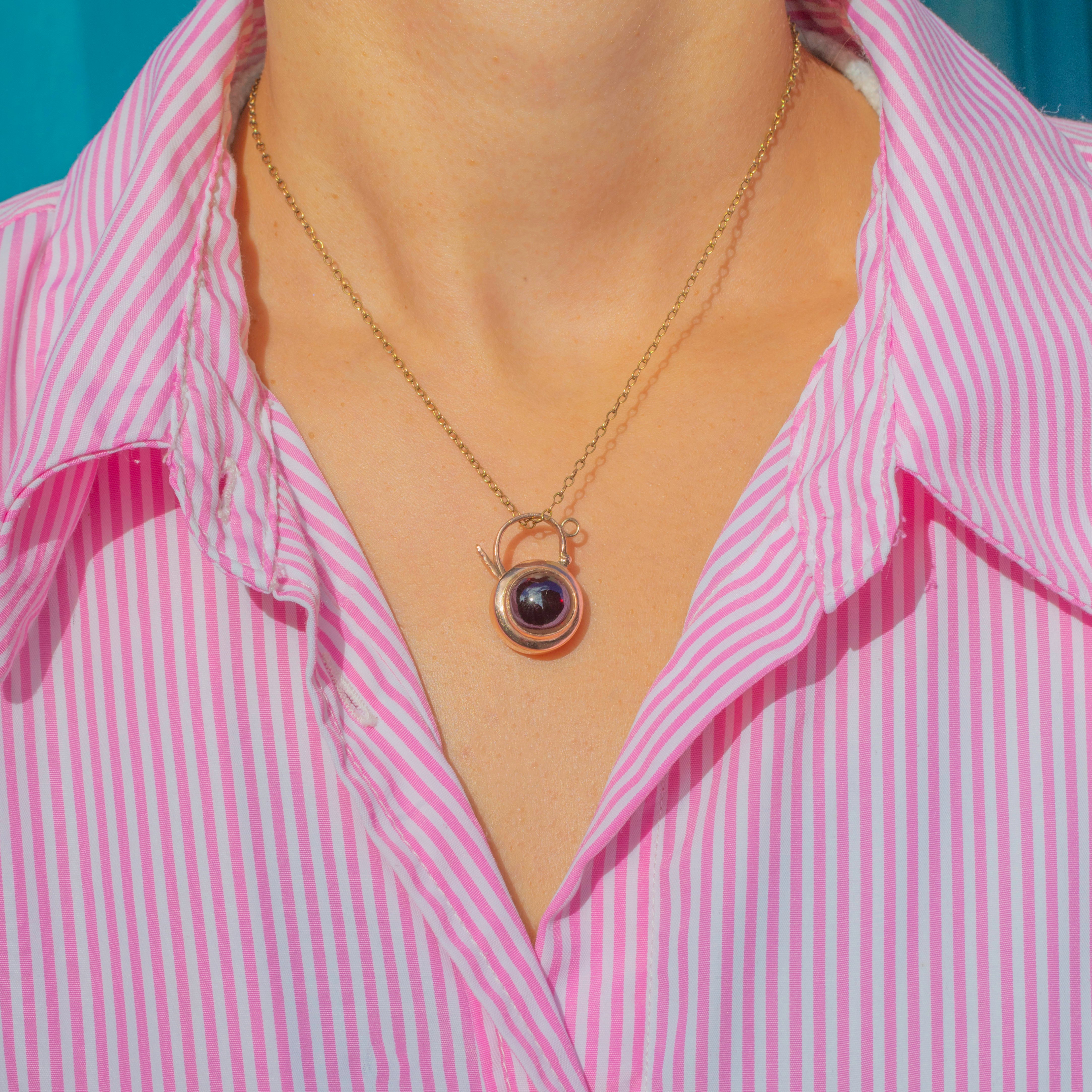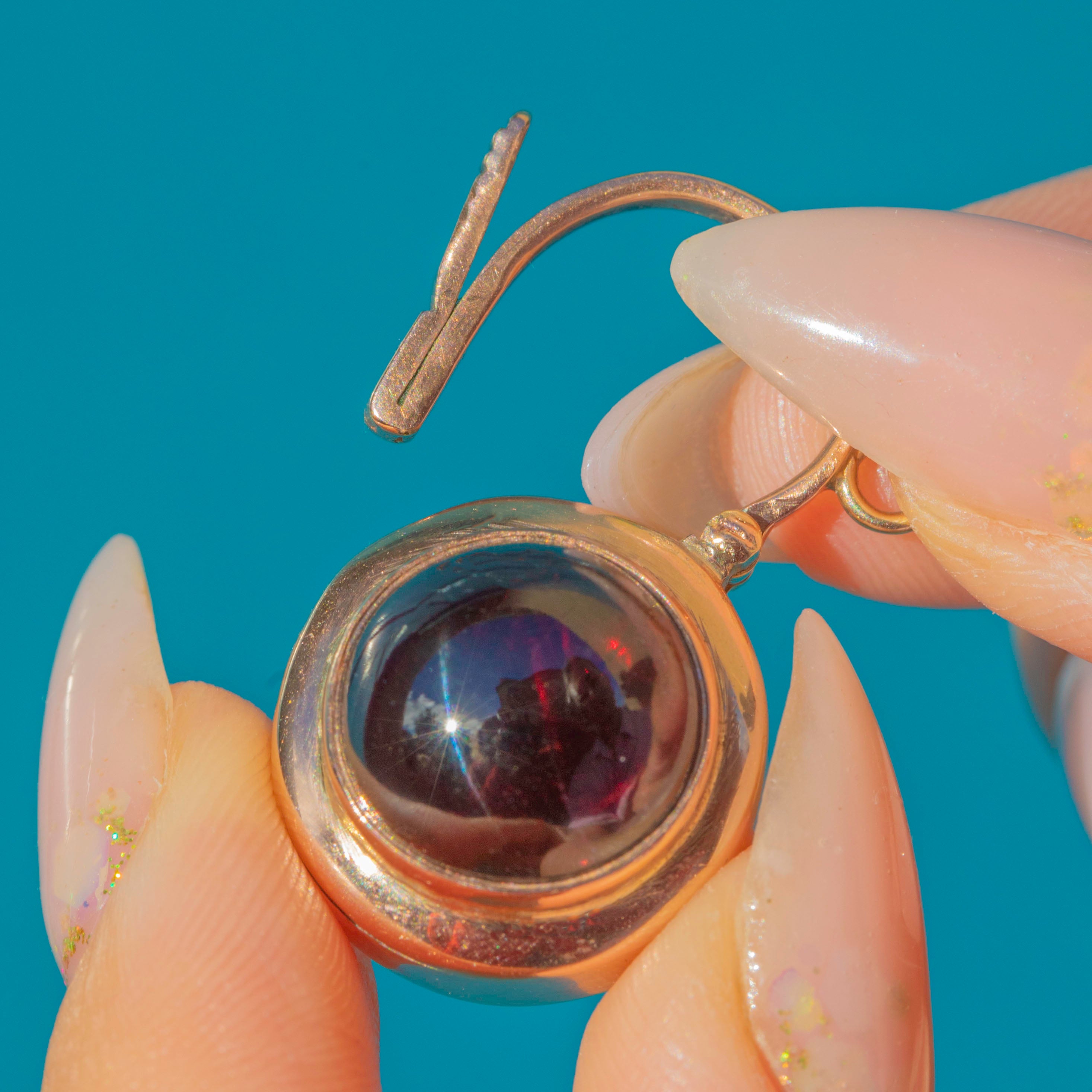 This antique padlock charm is a striking late Victorian treasure, crafted in 9ct rosy Gold and set with a large, glossy cabochon Garnet. The deep crimson gemstone glows beautifully, its domed cut giving it wonderful depth and presence.