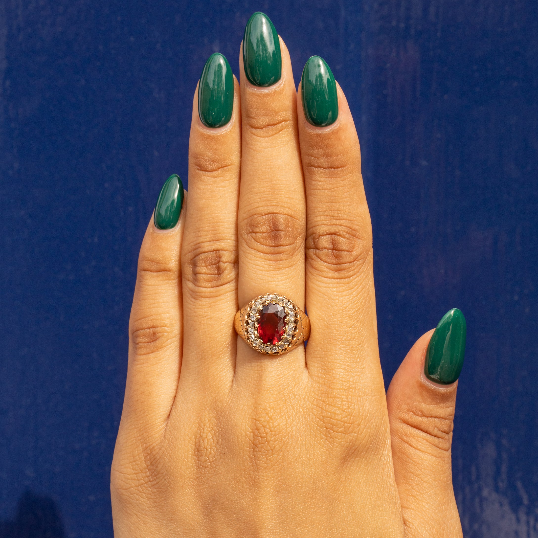 Adorned with a total of 0.55cts of charming, glittery rose-cut Diamonds that accompany a jammy faceted Garnet at its centre, this piece is both feminine and moody. Her 9ct Gold band sits comfortably on the finger, making for the perfect everyday statement!