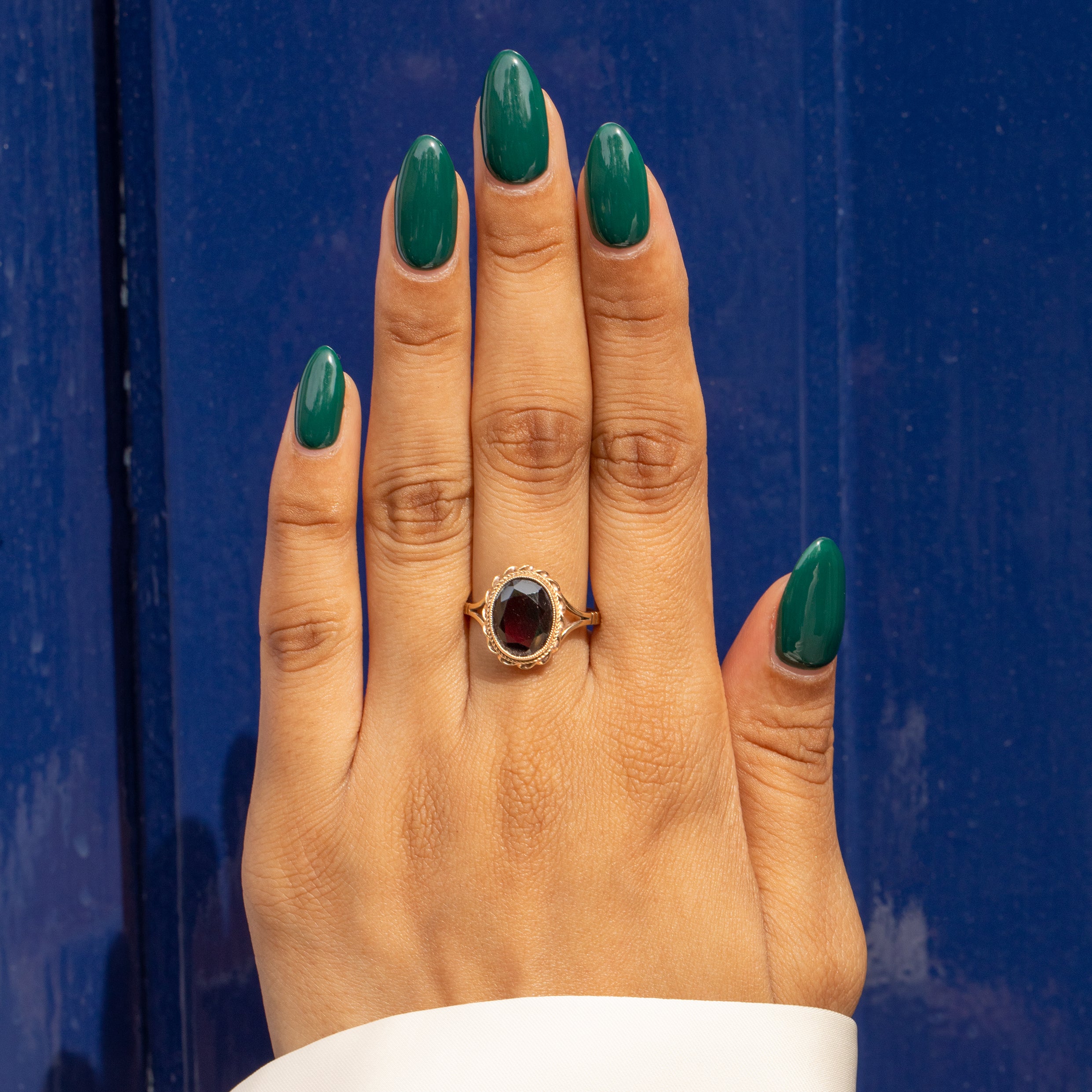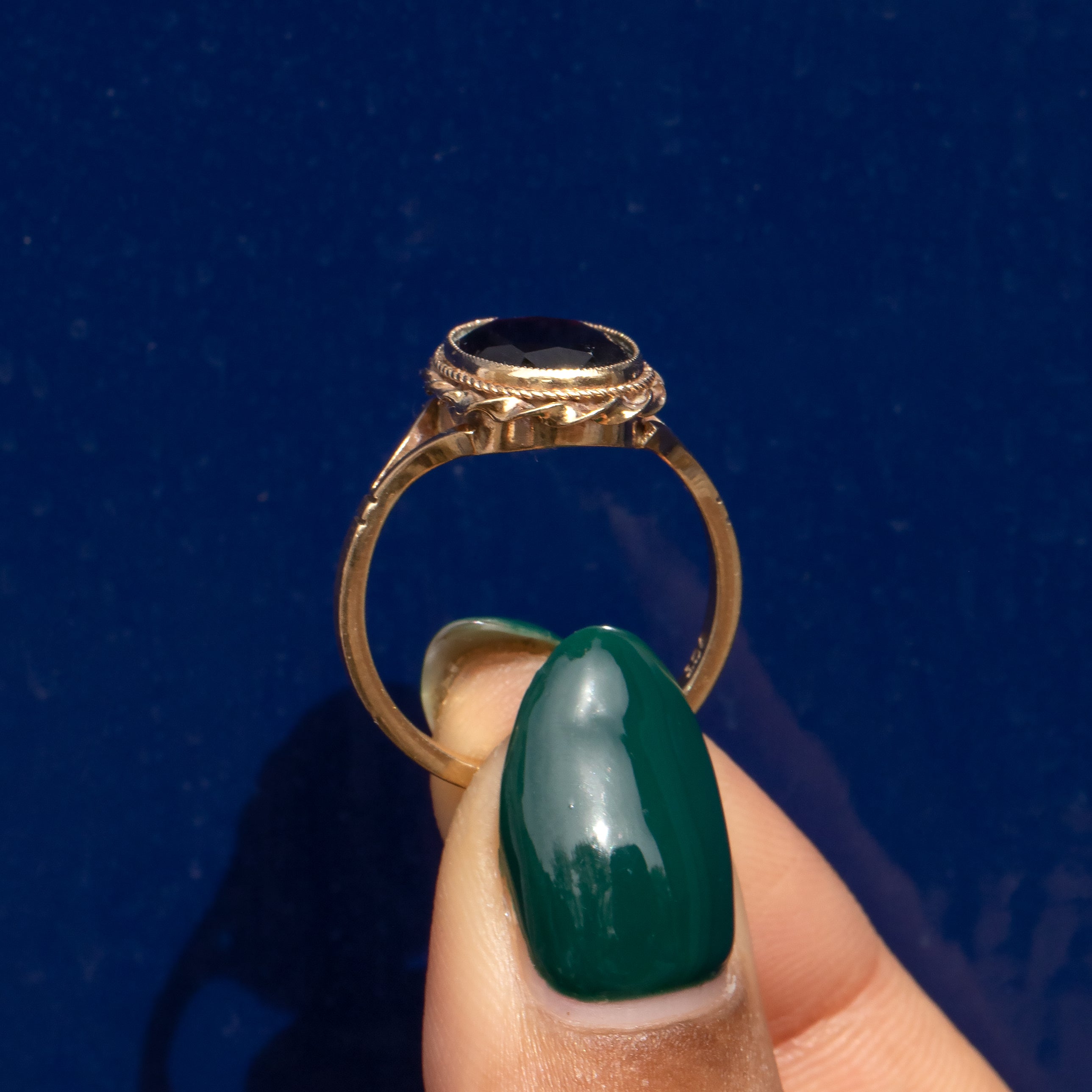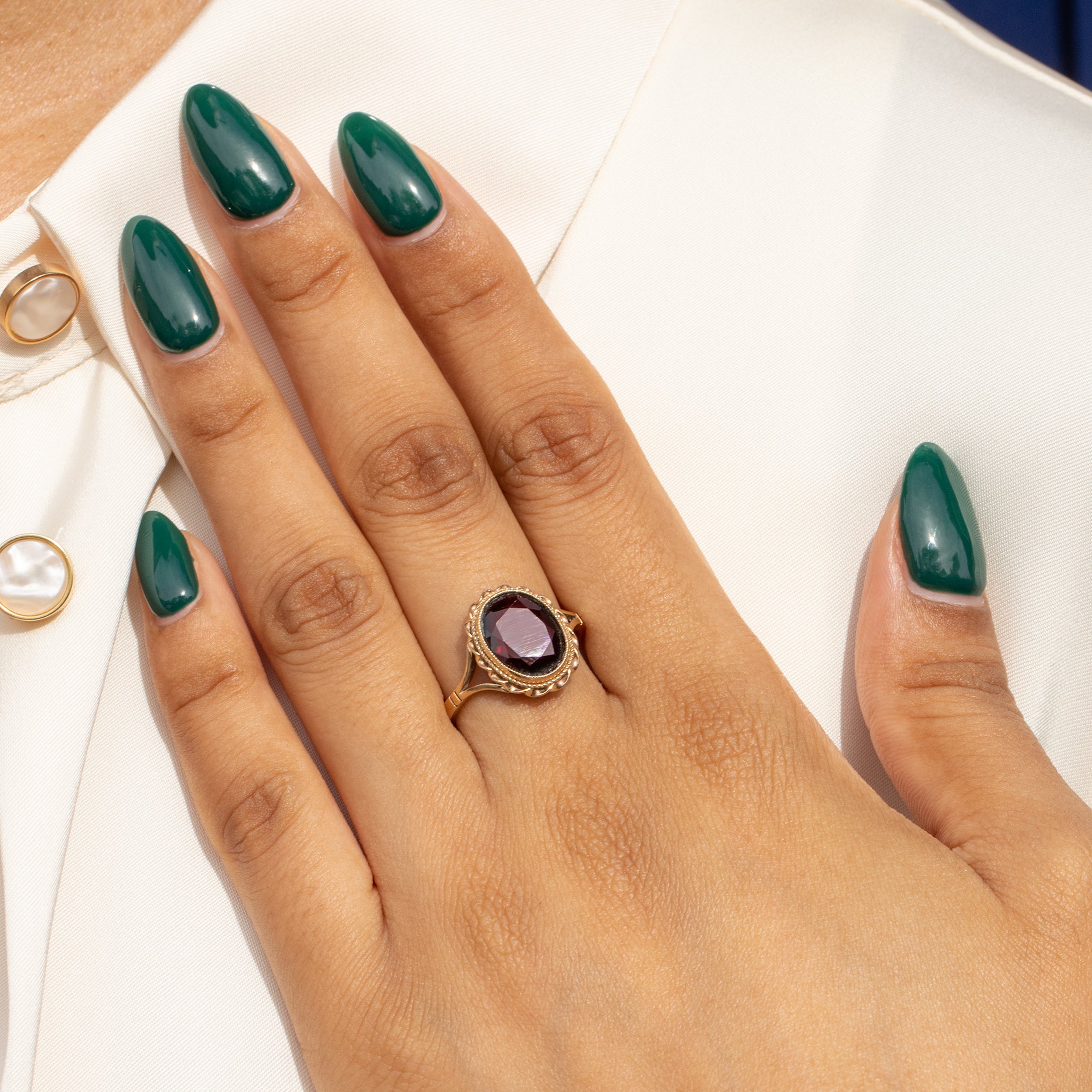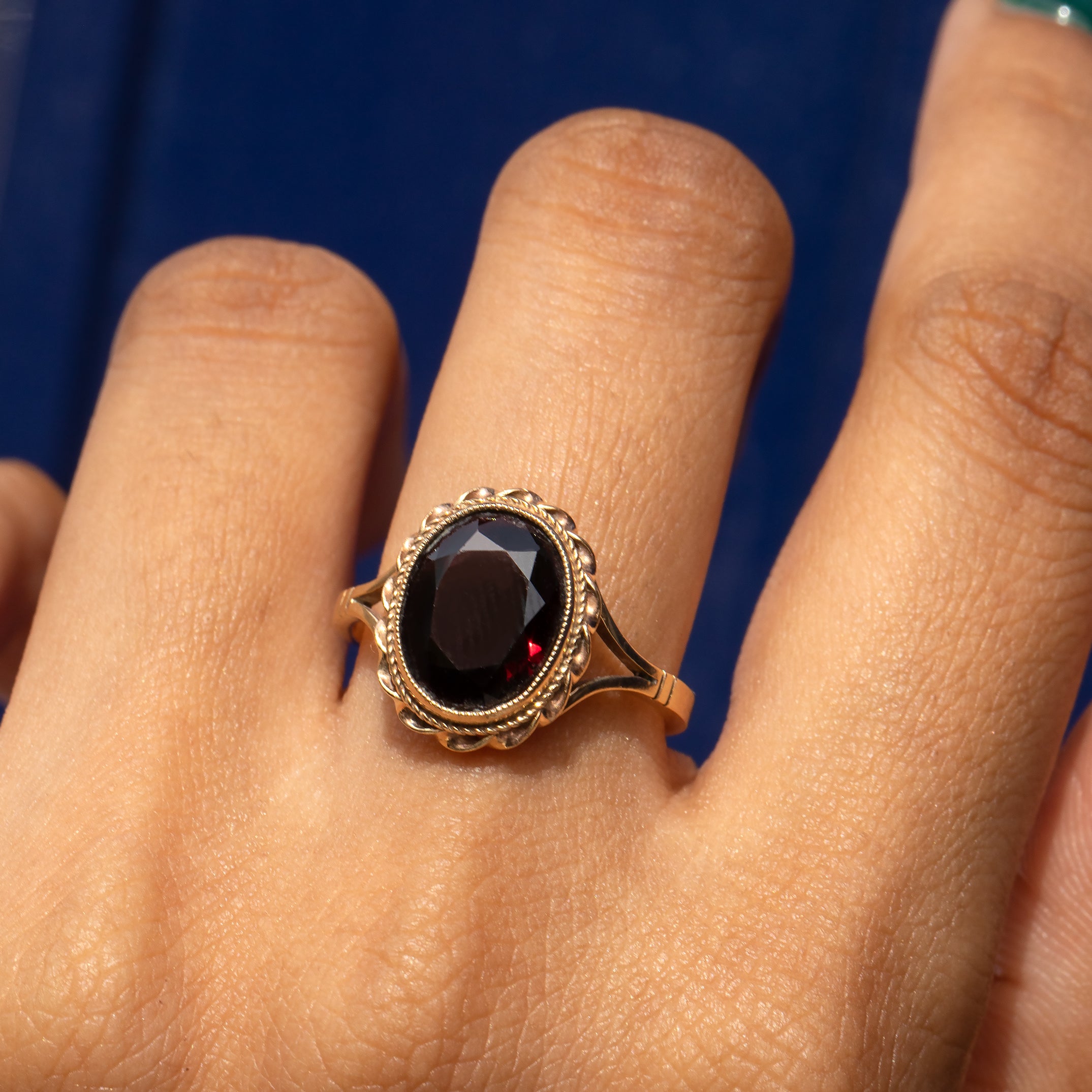 A decorative rope border frames the Garnet, and combined with split shoulders this ring will make an elegant addition to your collection! When the light hits just right, it's a magical thing that seems to glow from within.