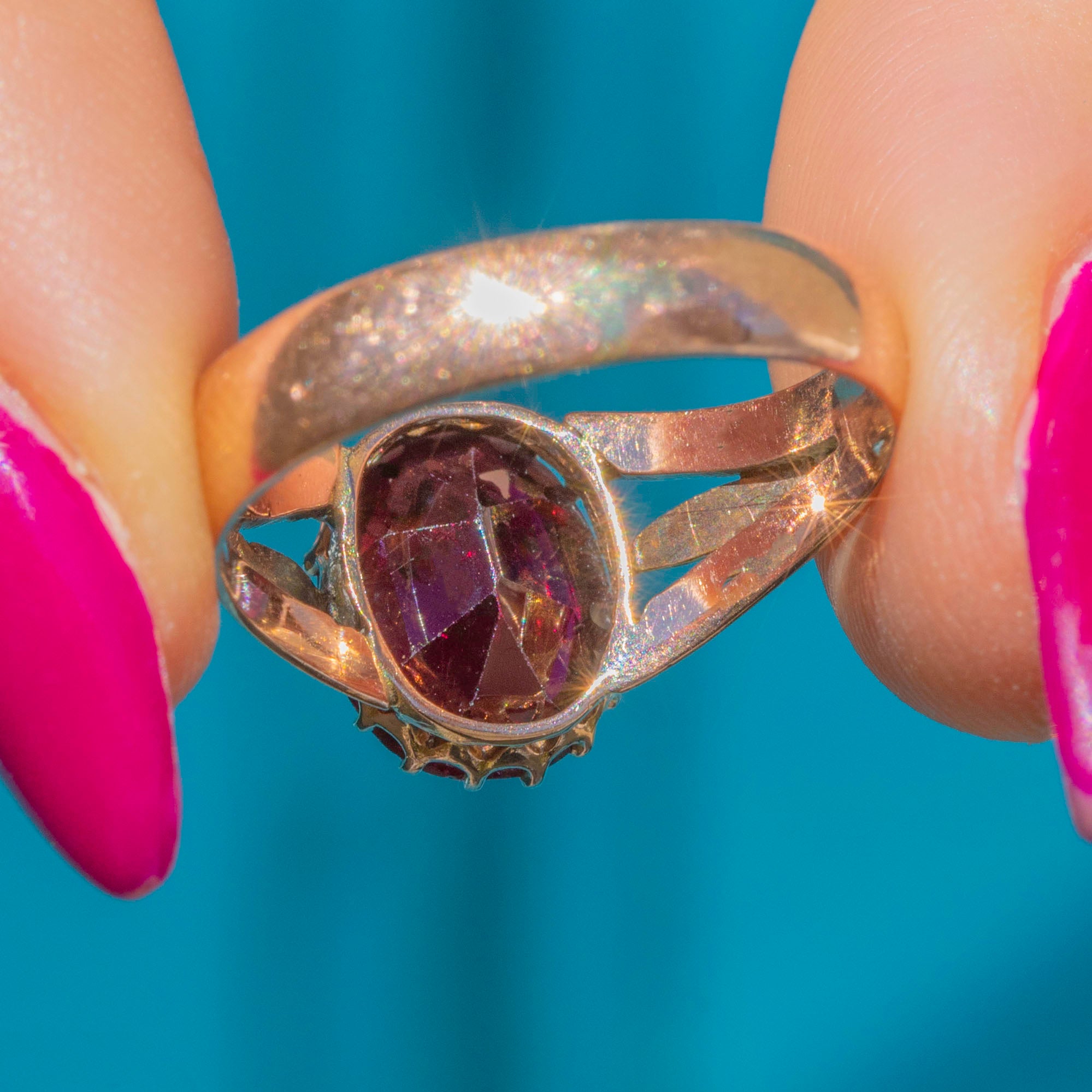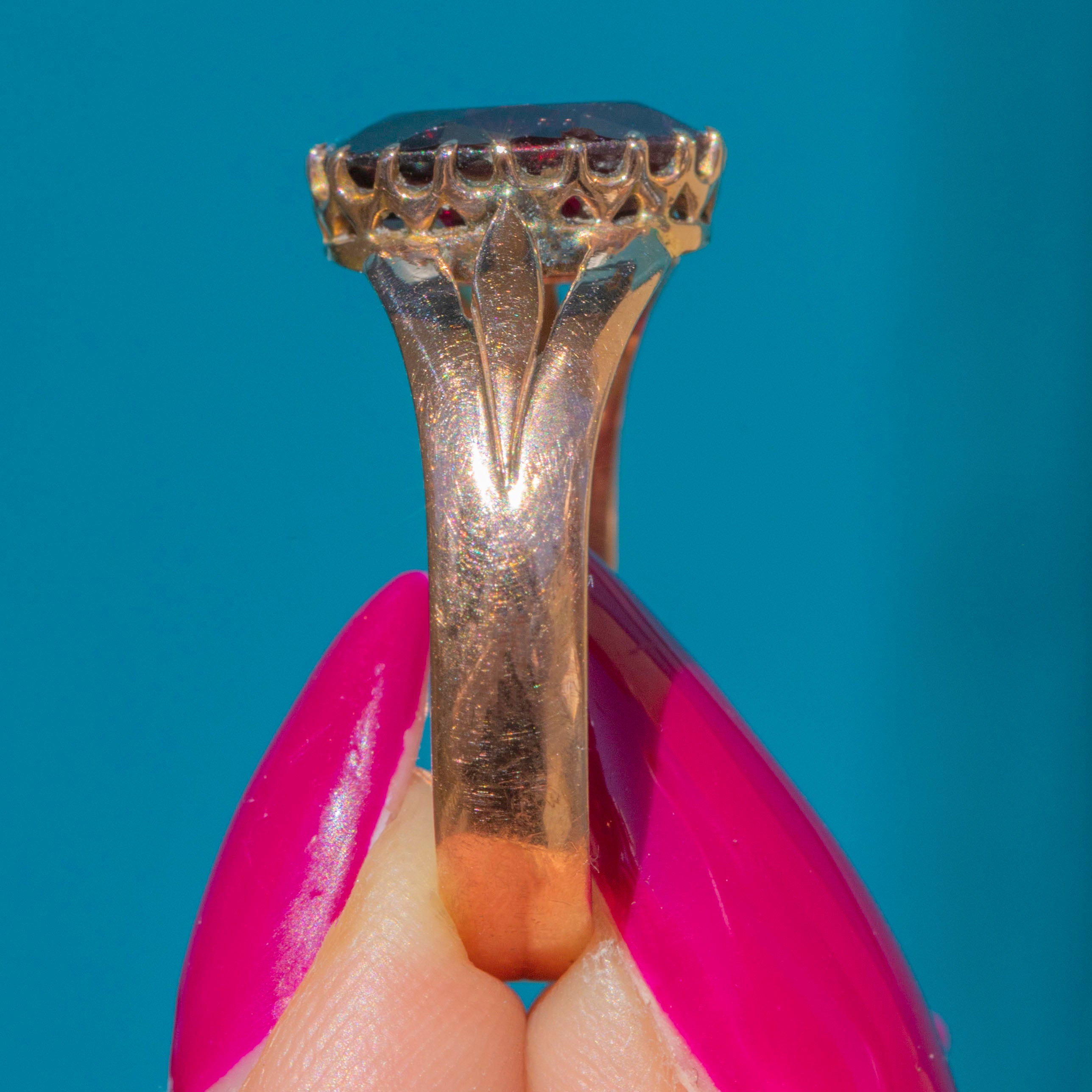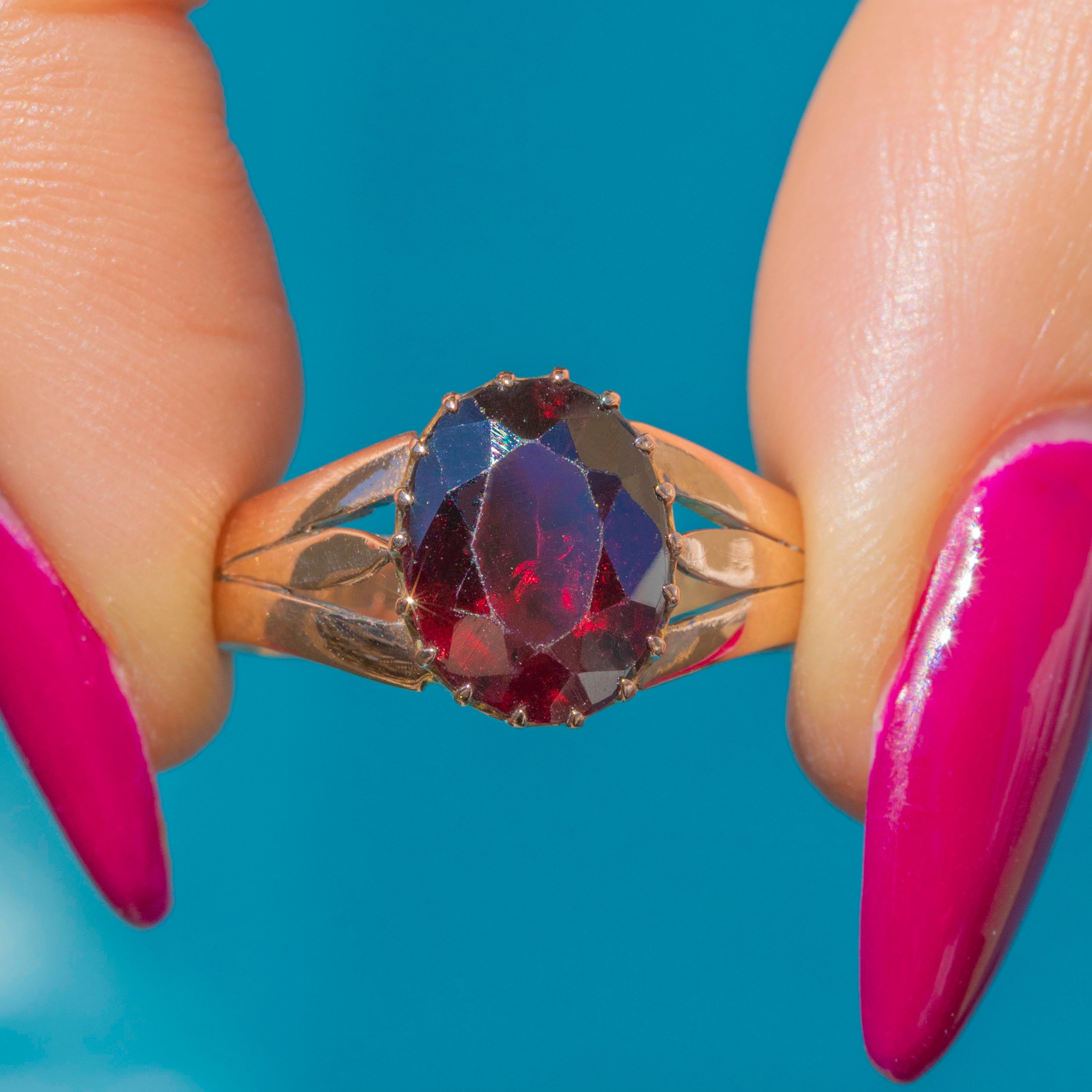 This antique solid 9ct Garnet solitaire ring is a dramatic piece from the early 20th century- hallmarked to 1918. Crafted from solid 9ct Gold, she boasts a richly hued 1.45ct Garnet, projecting flashes of crimson from its geometric facets as they catch the light.