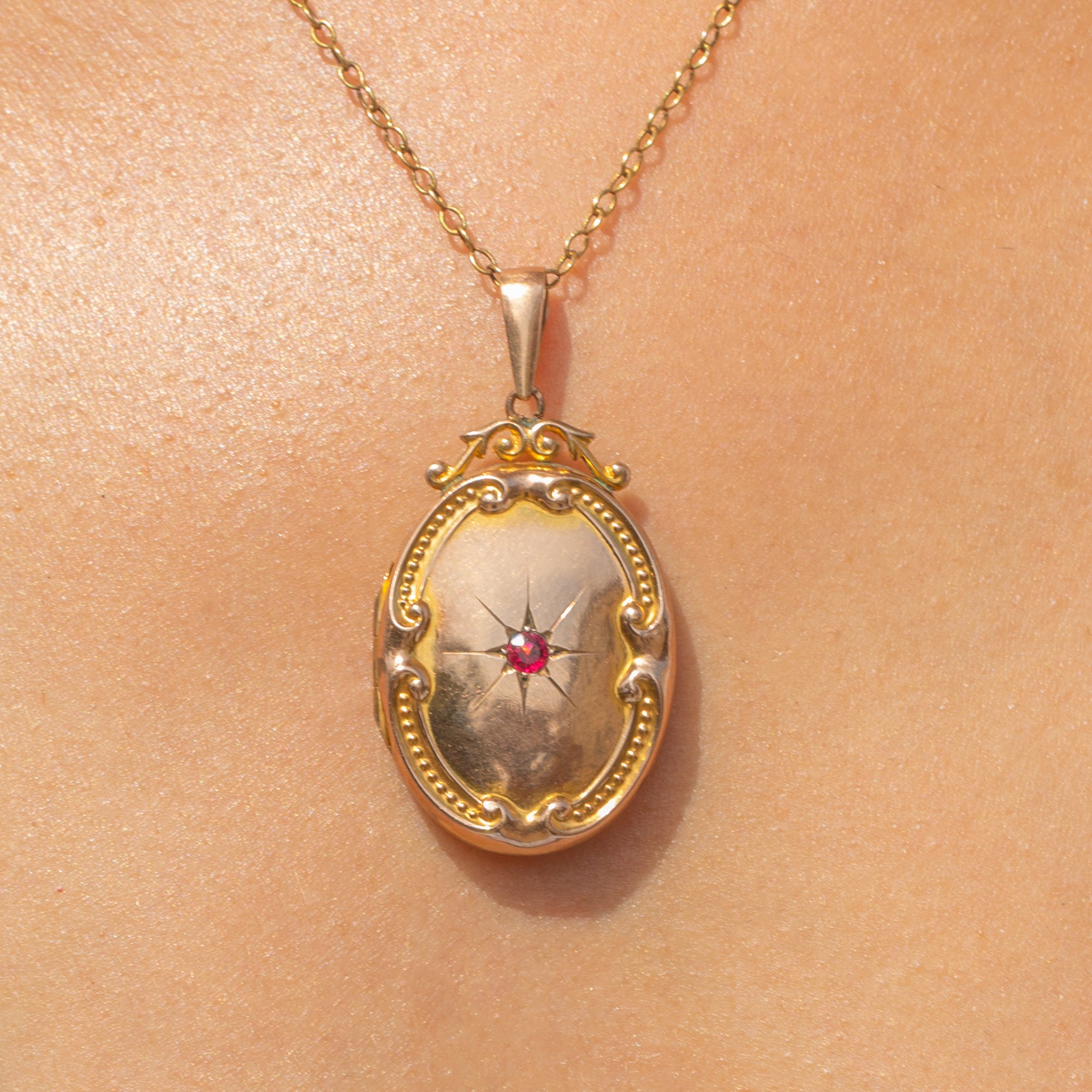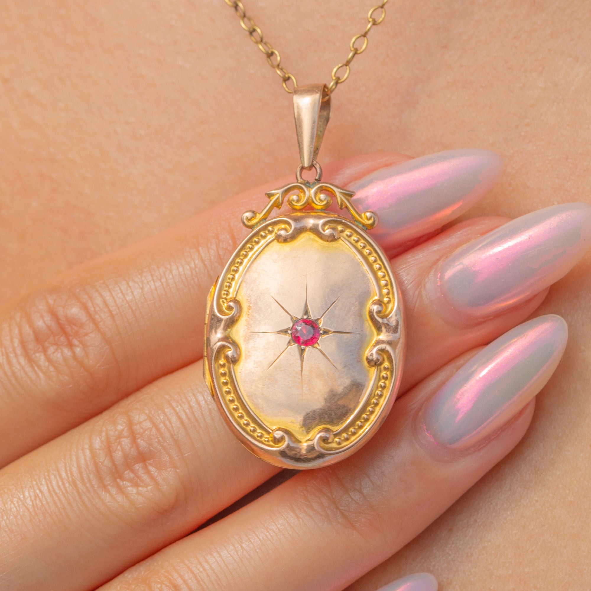Antique 9ct Gold Garnet Star Set Oval Locket