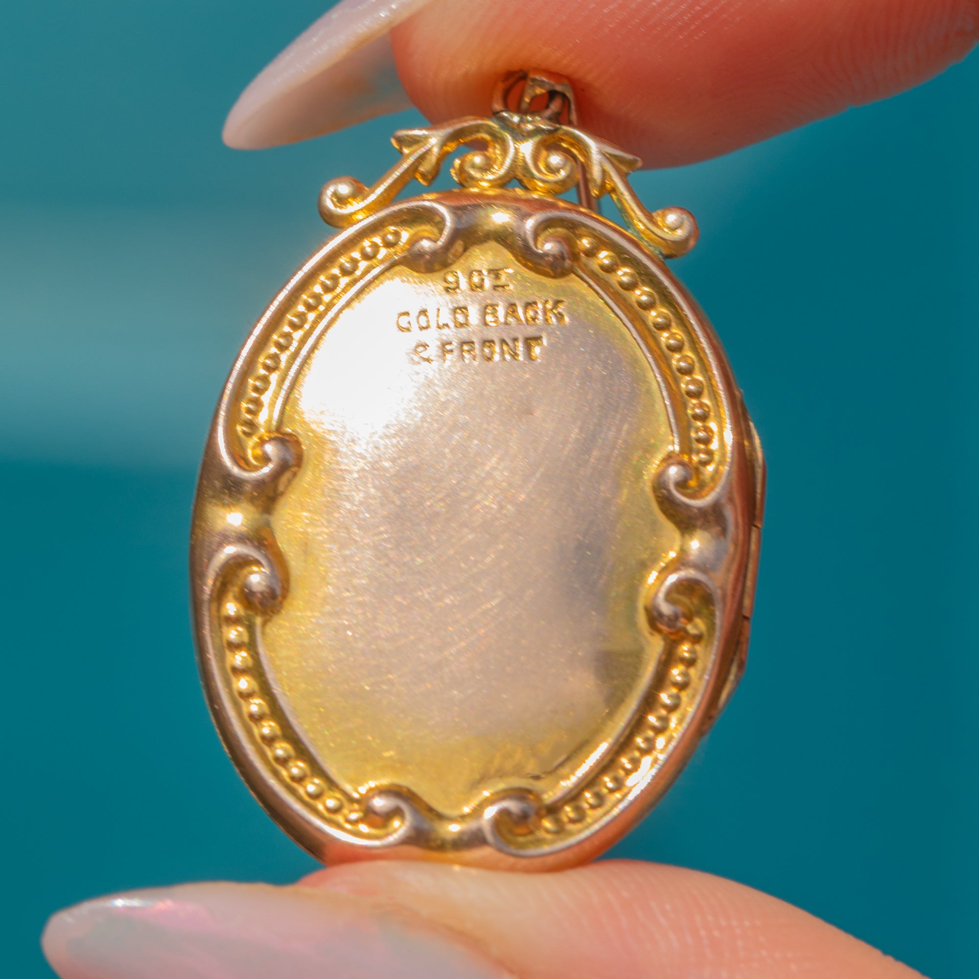 This charming Victorian oval locket is crafted from sumptuous 9ct Gold, adorned with baroque-style engravings and an ornately decorated bale.