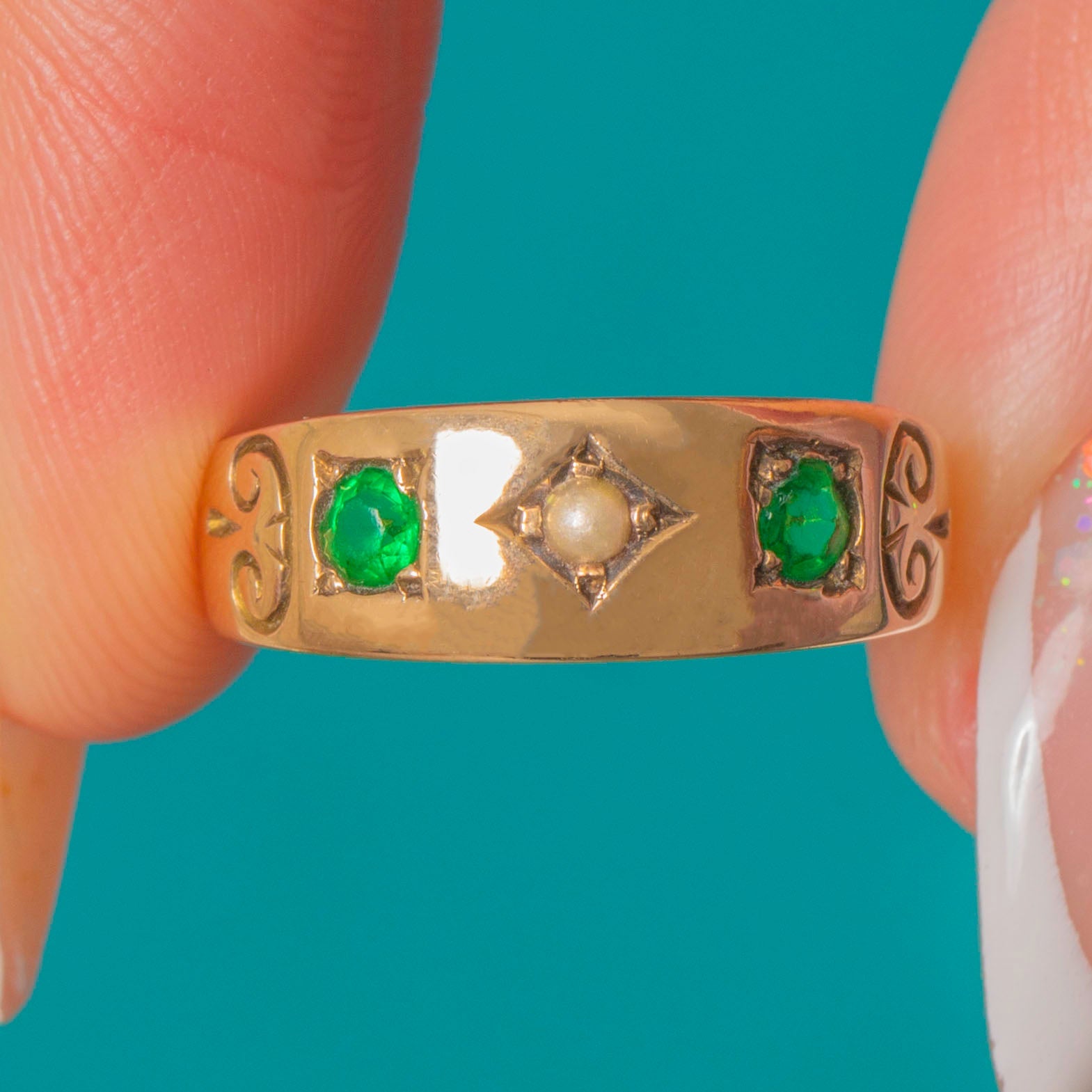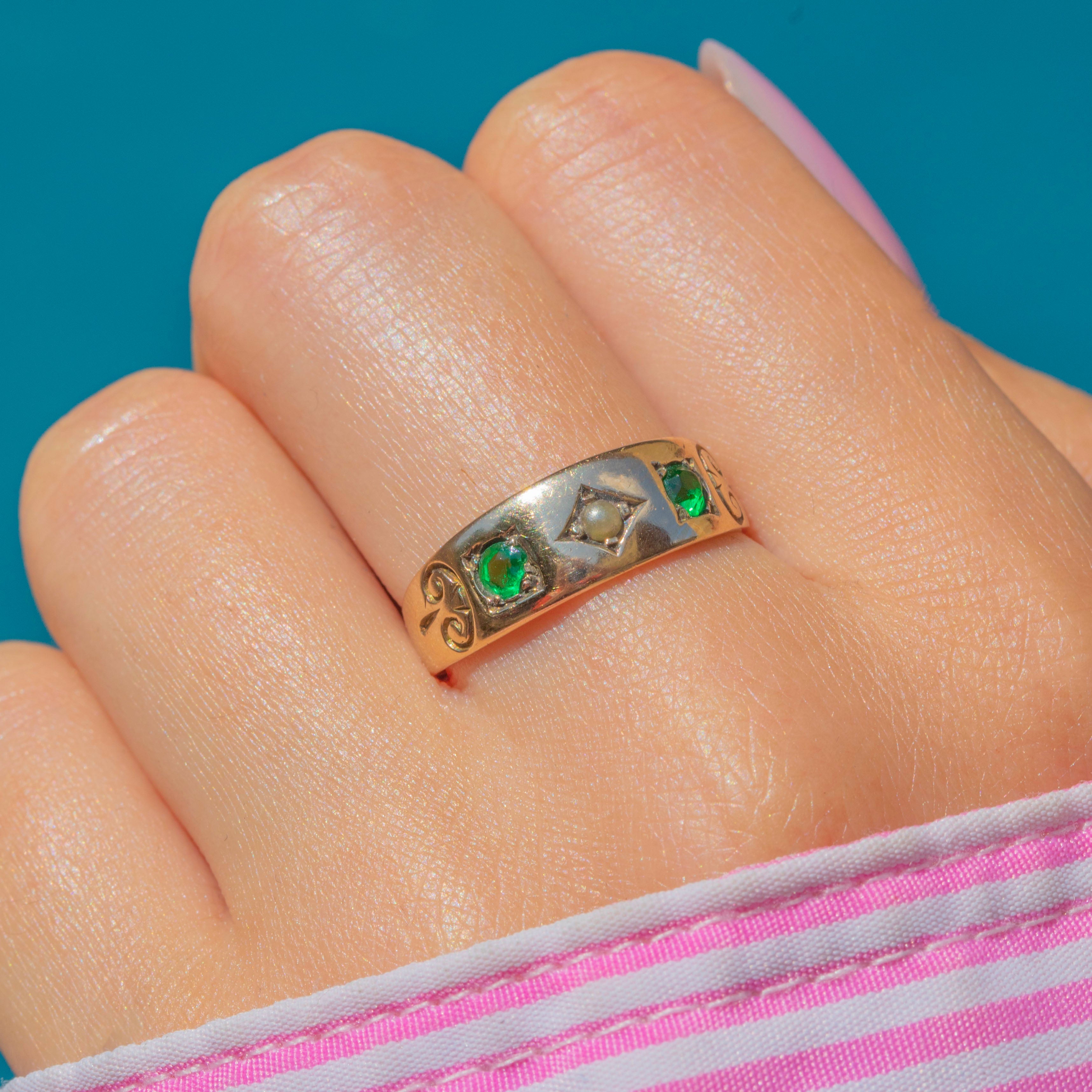 This gorgeous Victorian Gold gypsy ring, inlaid with a dainty Seed Pearl flanked by vibrant green Paste, will bring a fresh pop of colour to your curated ring stack!