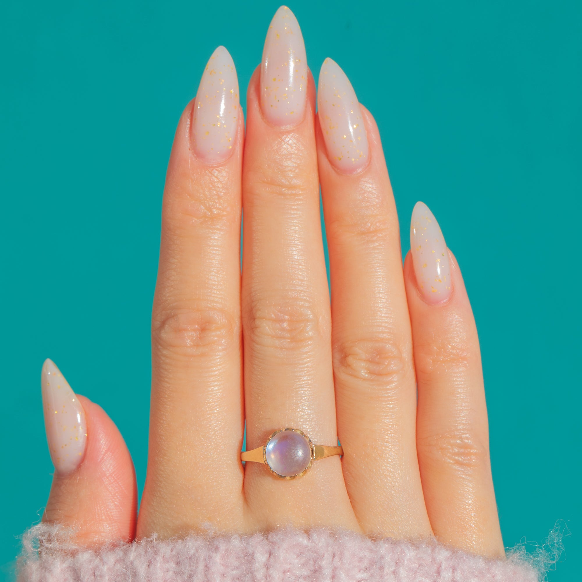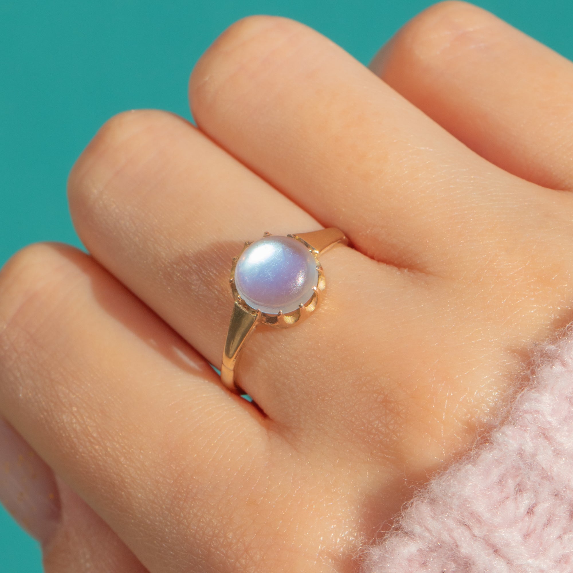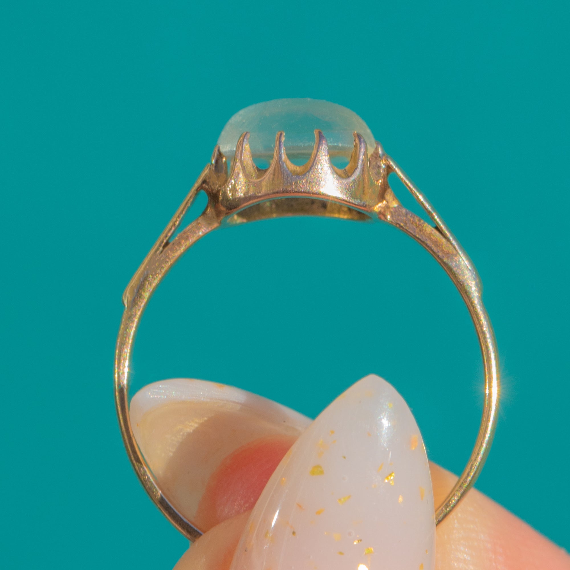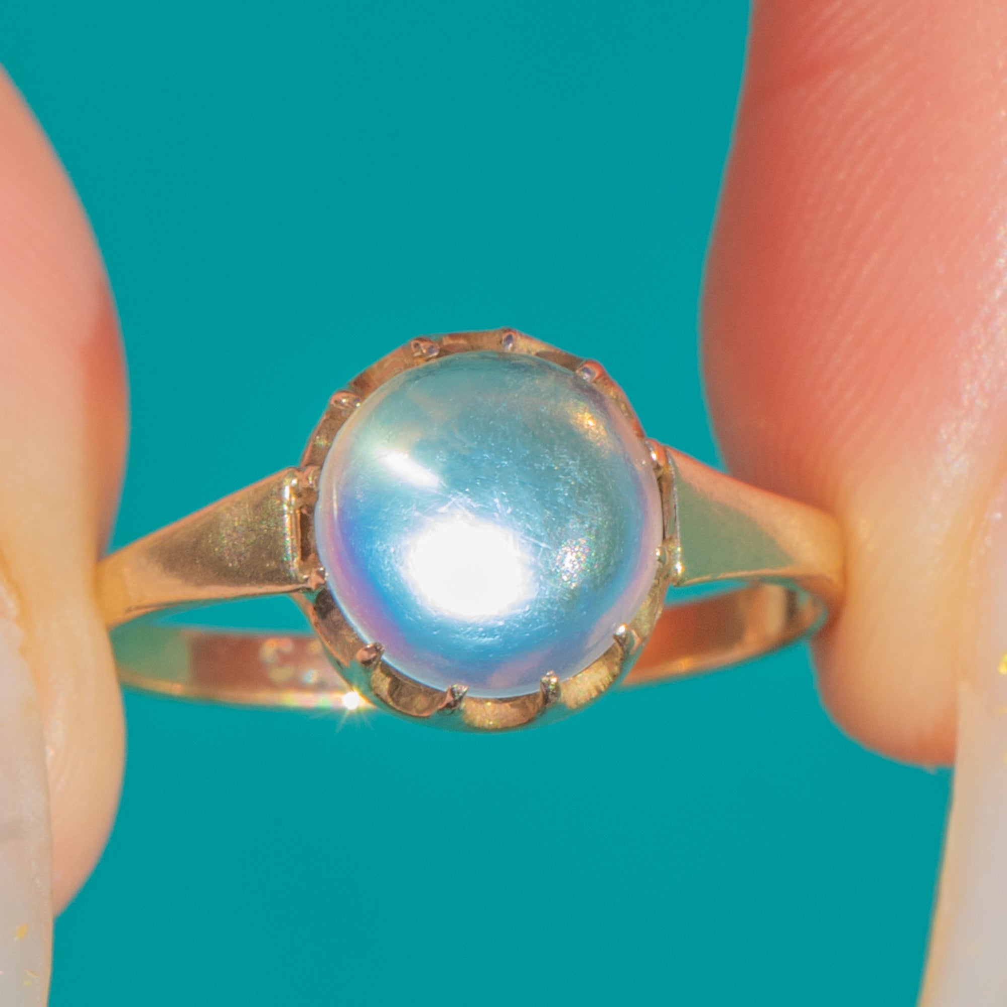 Glowing with that unmistakable blue-white “moon‑glow”, this antique Victorian Moonstone solitaire is a study in quiet elegance. The high-domed cabochon is cradled in a scalloped coronet (buttercup) crown above a beautifully open gallery, allowing light to flood the stone and amplify its ethereal sheen.