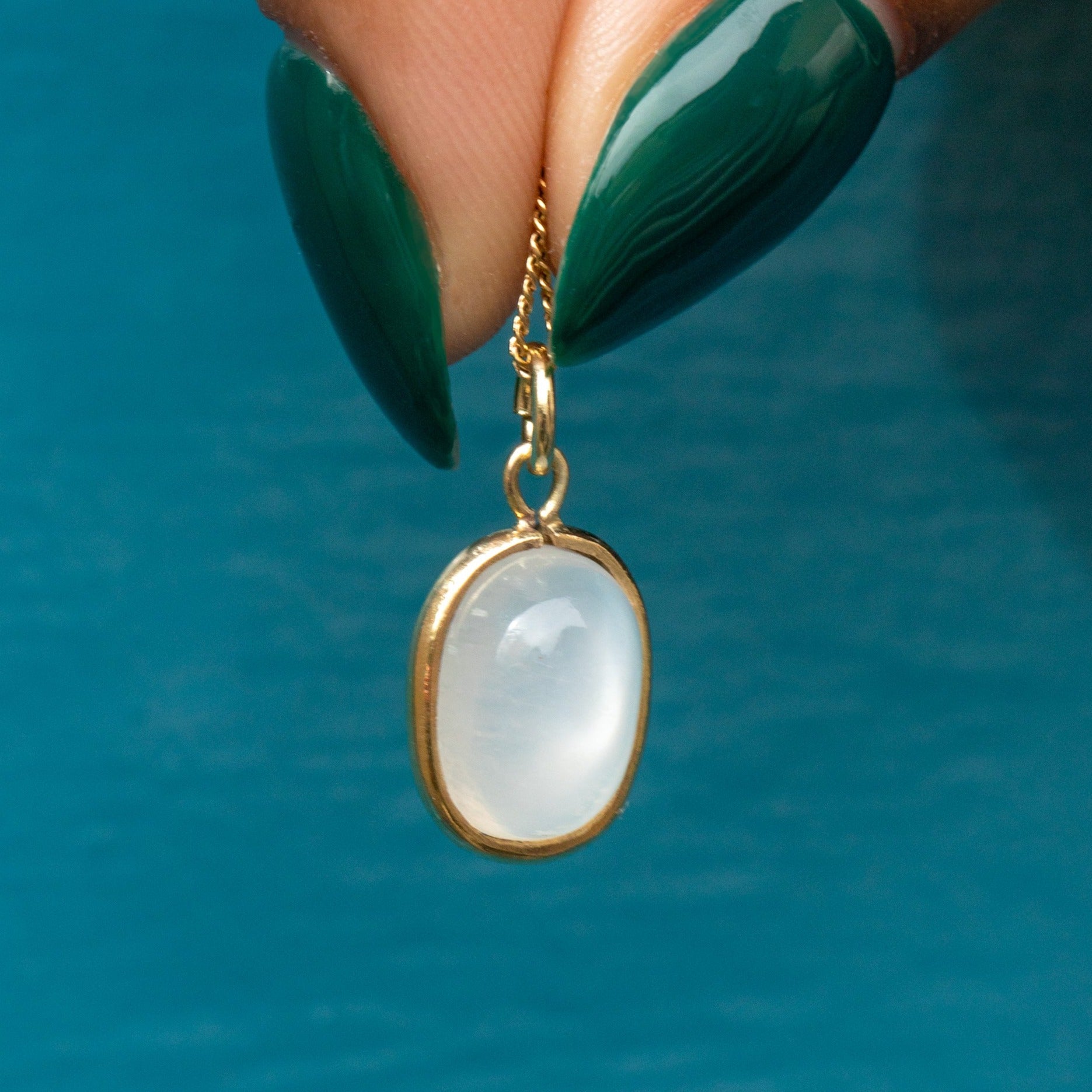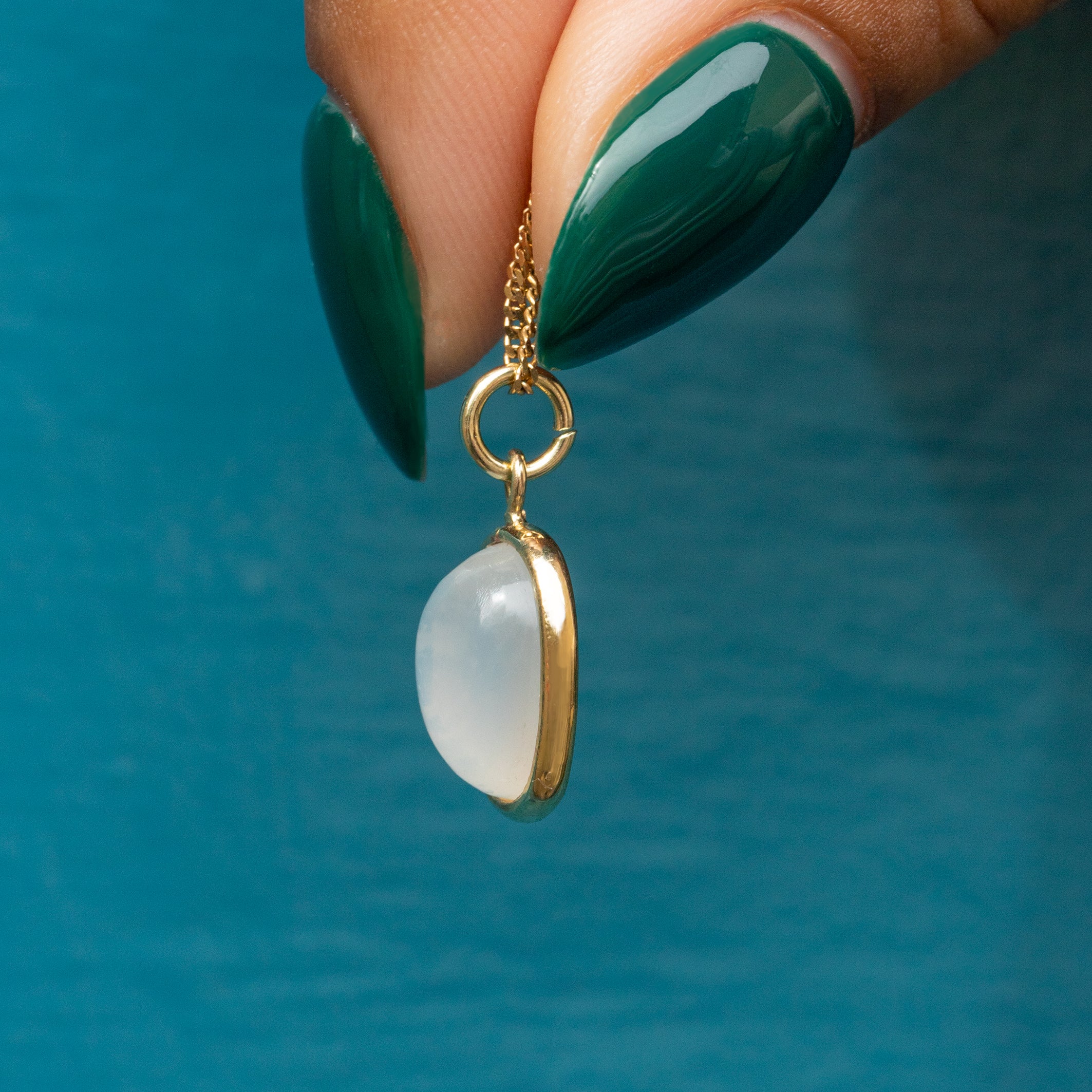 Buttery 9ct Gold forms her smooth bezel setting that hugs the Moonstone tightly, creating quite the opulent duo! Every millimetre of this Moonstone charm packs a punch and would look heavenly suspended from an antique dog clip or bolt ring!