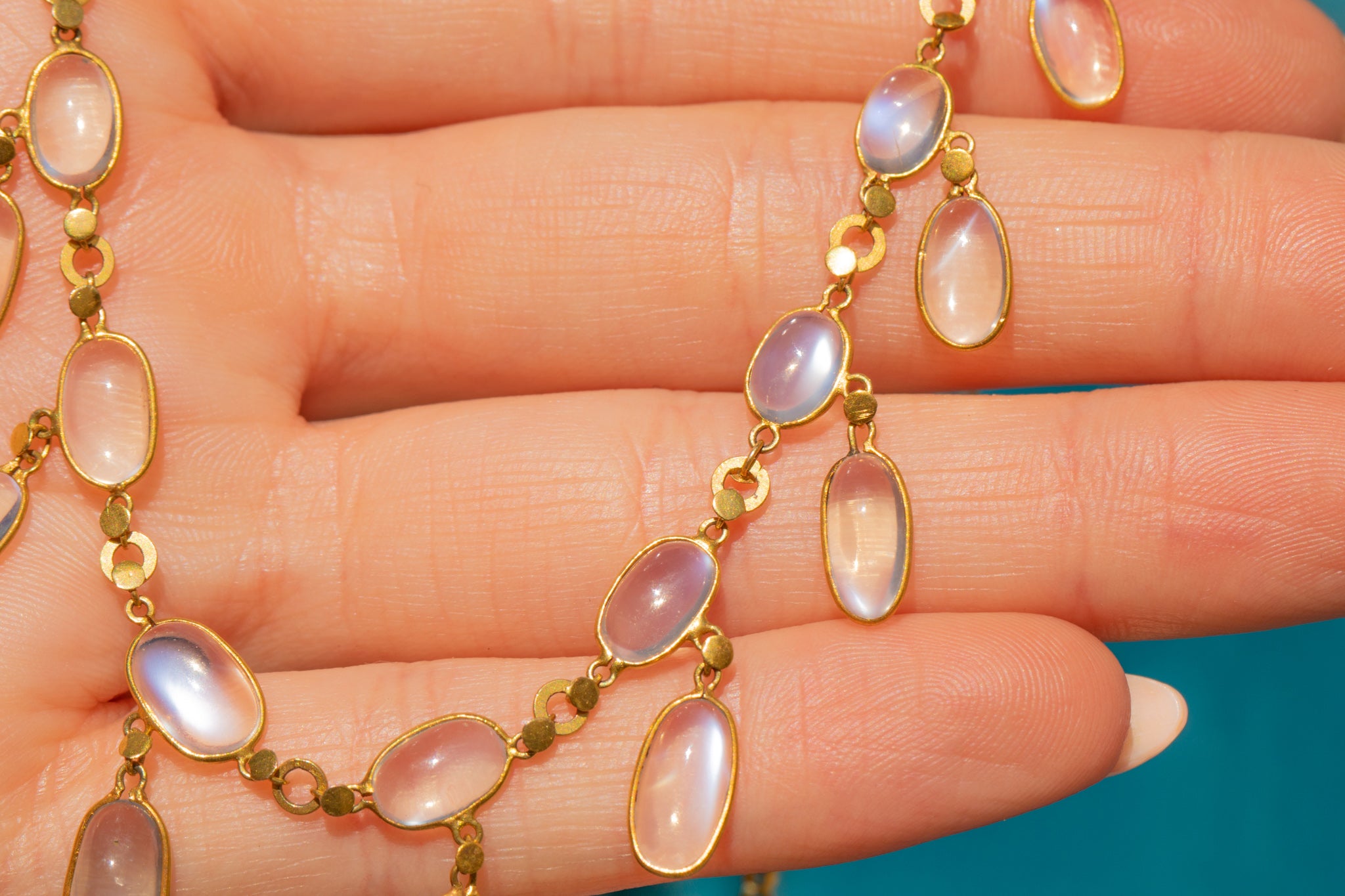 We adore how this antique fringe necklace looks around the neck, providing a beautiful statement! Each Moonstone has an ethereal glow coming from within; this piece is steeped in Victorian elegance, a true reflection of the era itself.