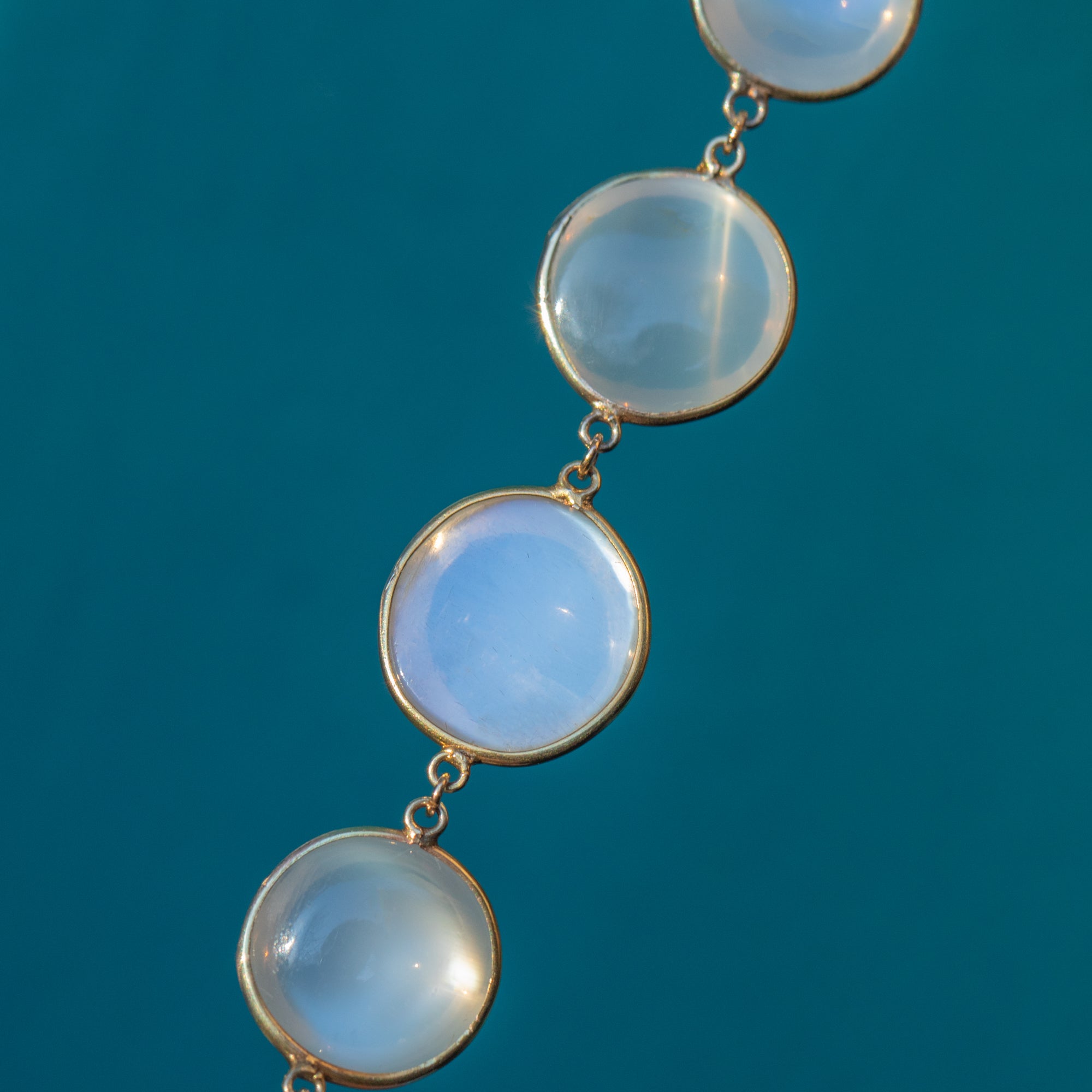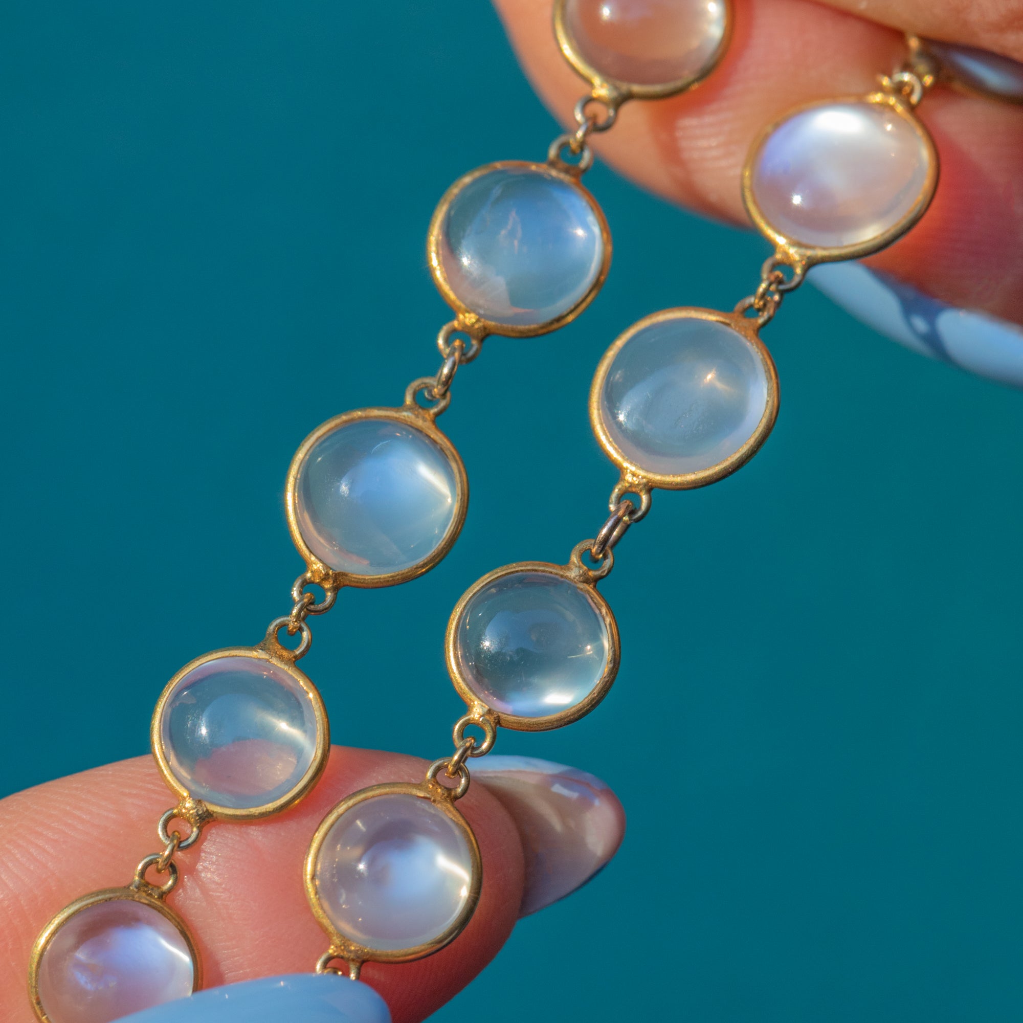 Boasting a whopping 47.9ct, each individually cut Moonstone cabochons each possess a radiant schiller, oscillating between ethereal high domes and smooth button shapes. Each antique Moonstone is complimented wonderfully by the warmth of her 9ct Gold bezel settings, achieving a sophisticated and subtle glamour.