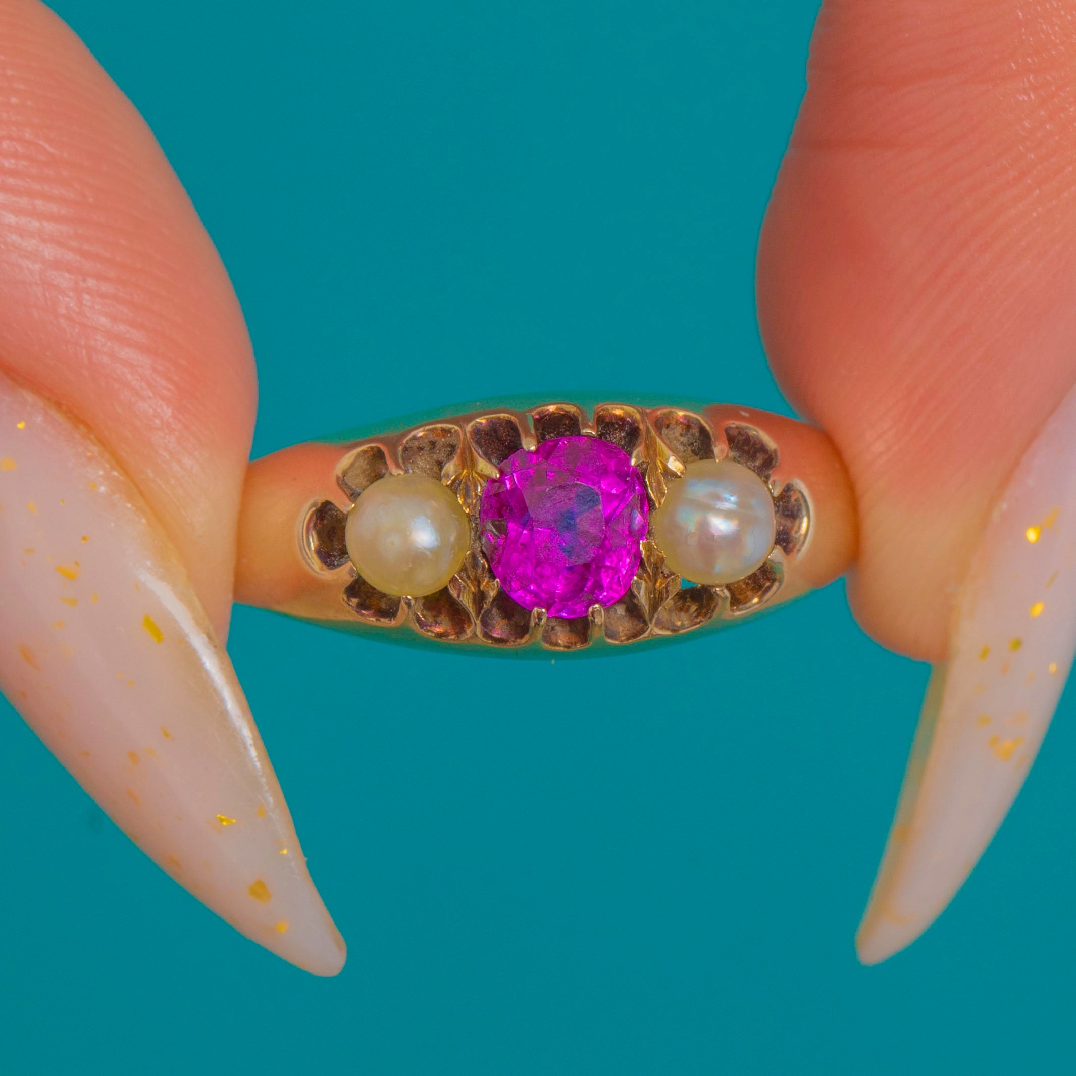 Low-profile and dainty, this romantic three-stone design offers effortless wear while its soft patina tells a century-old story. A timeless Victorian favourite, the Ruby and Pearl pairing brings elegance and a whisper of sentiment to everyday.