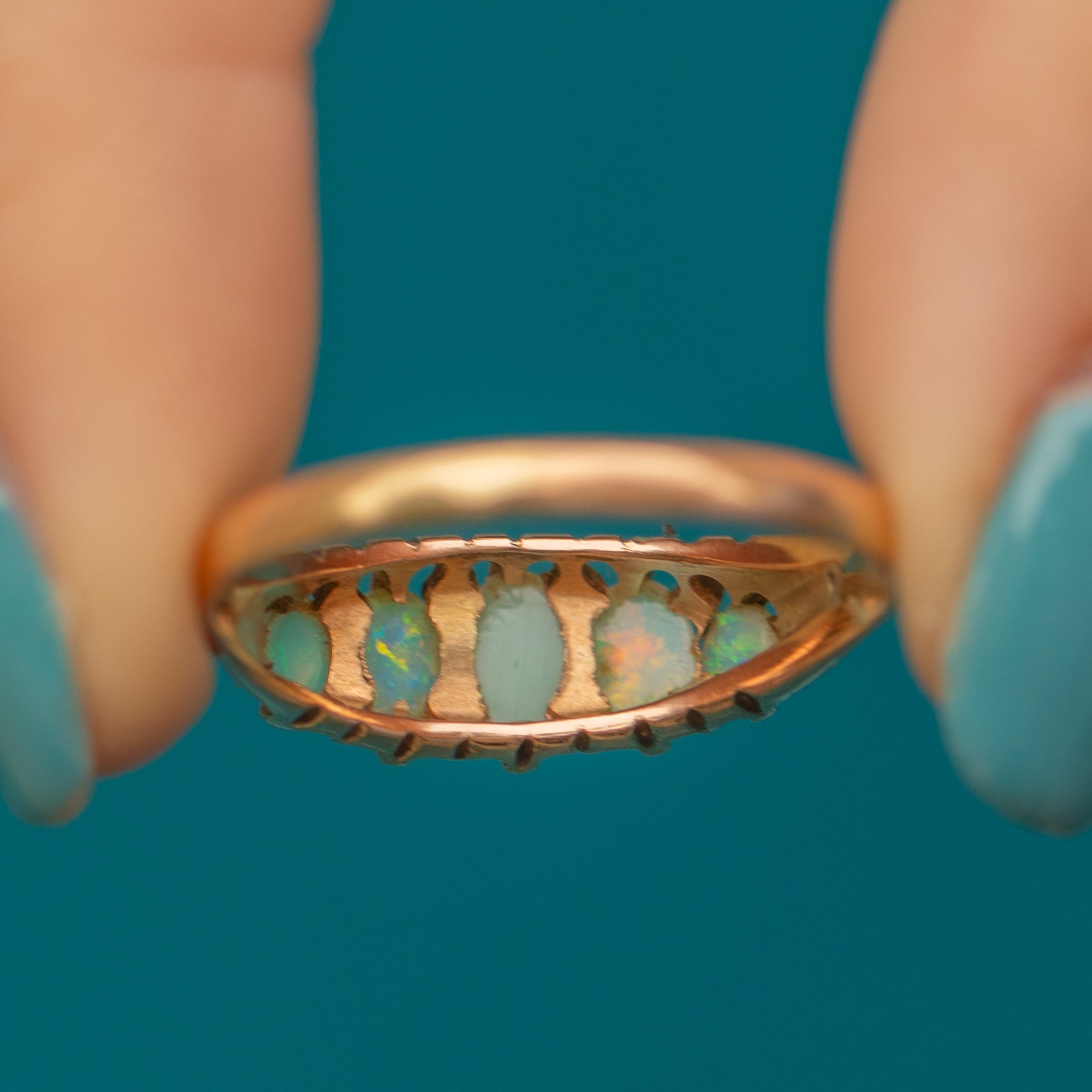 Introducing a timeless treasure, this Victorian 9ct Gold Opal Five Stone Ring, with a combined carat weight of 0.71ct will make a luxurious addition to your ring stack! The Opals boast a firework display of colours, from mesmerising blues to lush greens and vibrant oranges.