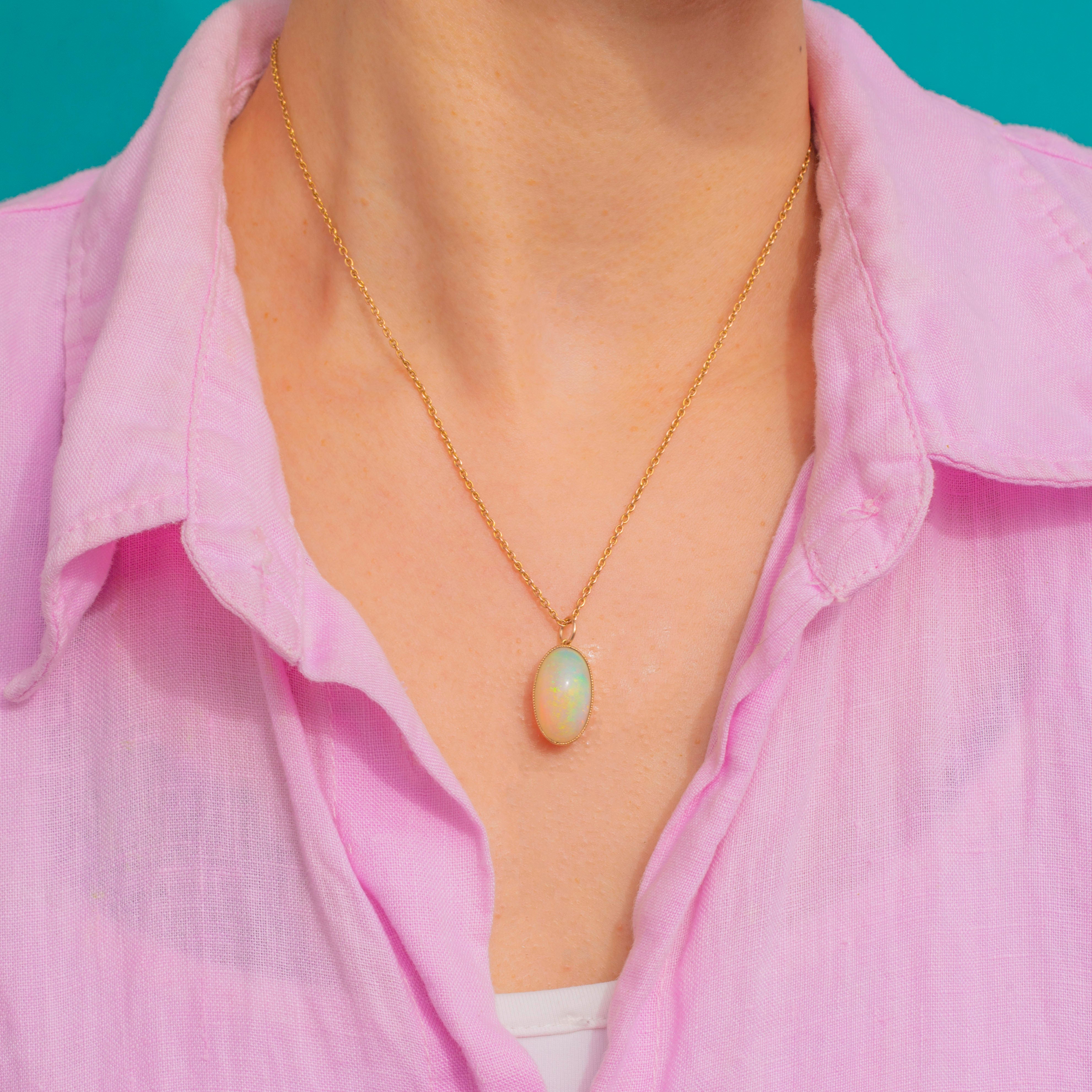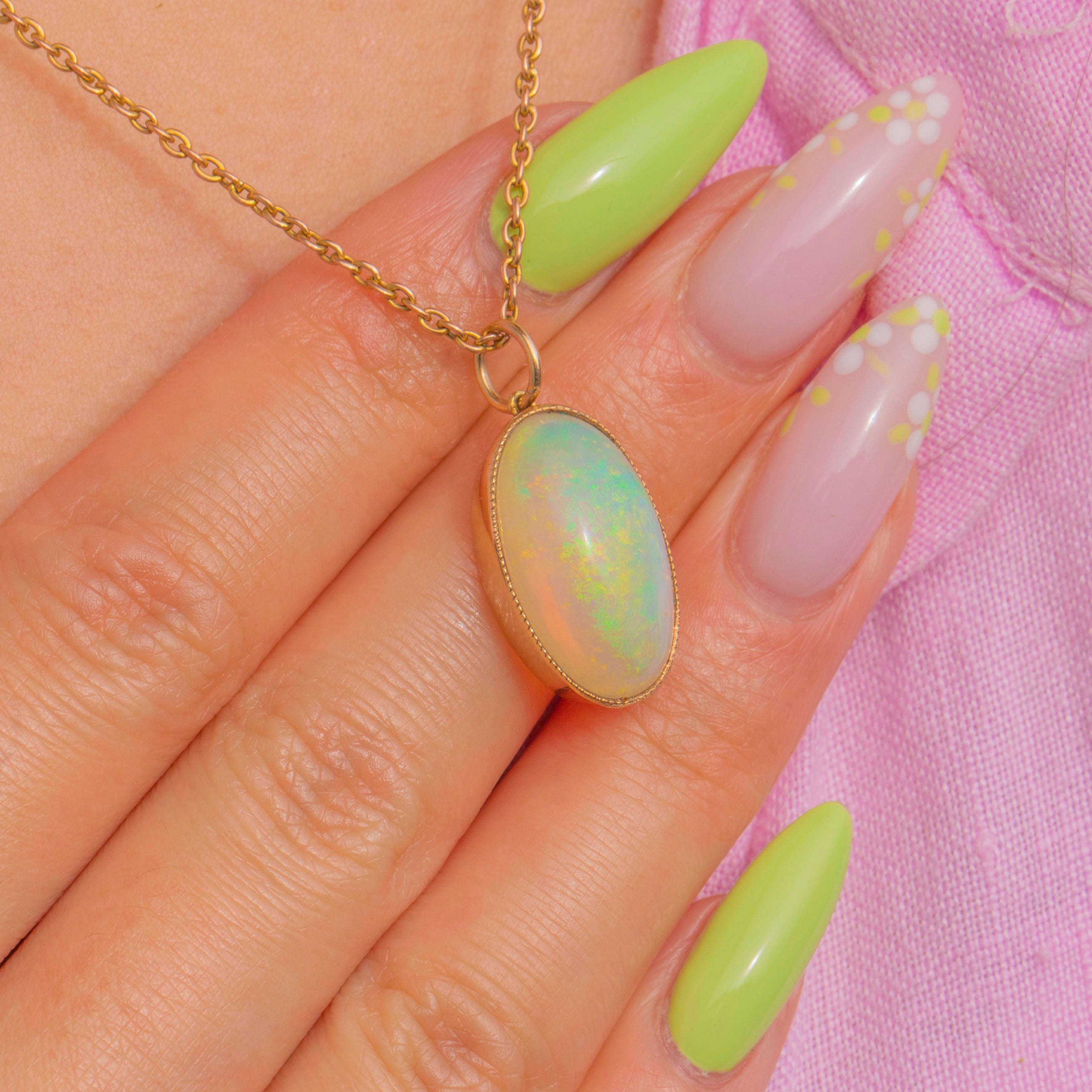 A luminous Victorian treasure, this 9ct Gold pendant centres a substantial 7.00ct solid Opal cabochon ablaze with play-of-colour. Flashes of green, yellow and blue ripple across its high dome, creating a mesmerising, ever-changing display with every movement.