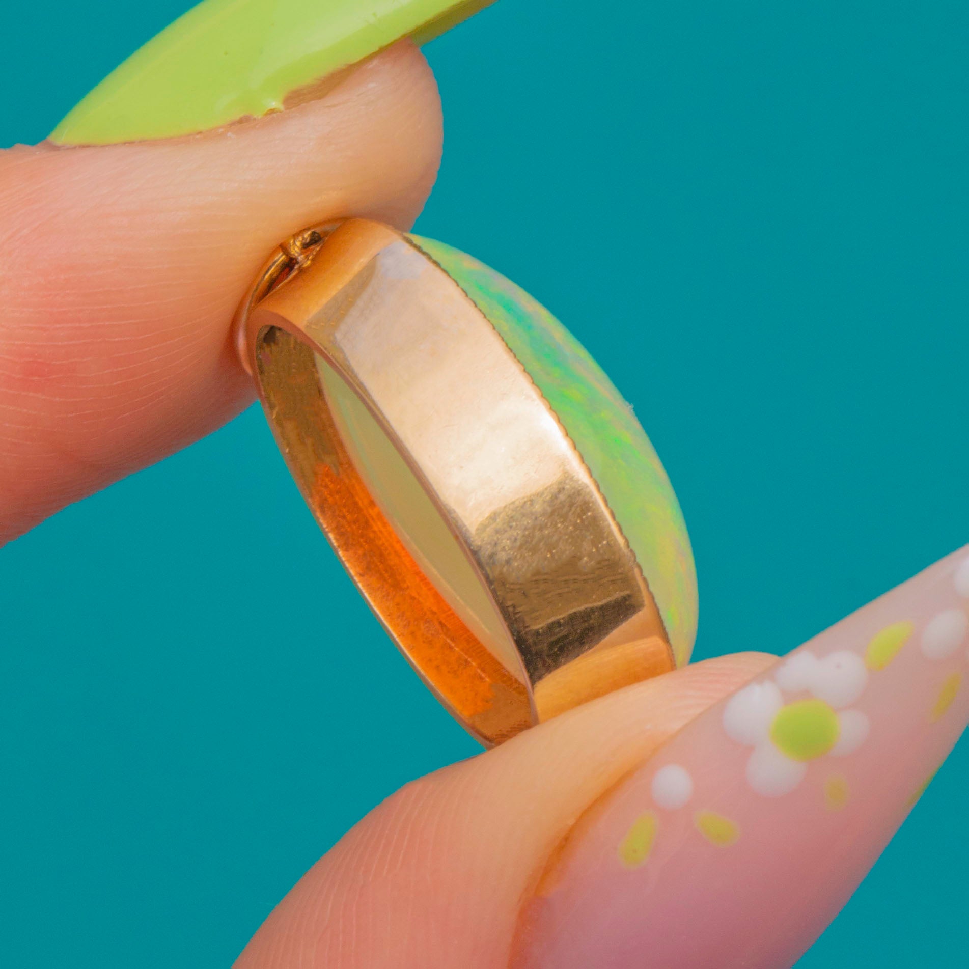EXCELLENT: The Opal presents beautifully with vibrant play-of-colour and only minimal surface wear commensurate with age. The 9ct Gold bezel and jump ring are secure and show light natural surface marks from gentle wear. Overall, the piece has been well cared for and is ready to wear and enjoy.
