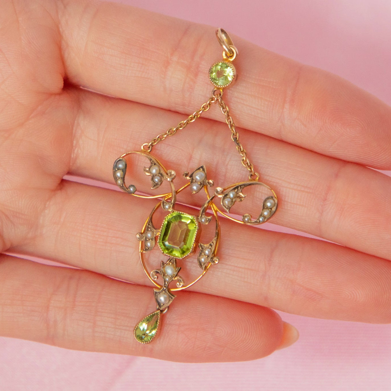 We adore this antique 9ct Peridot Pearl pendant! This treasure is Art Nouveau royalty, epitomising all that the era is adored for, with her fine swooping lines, pretty Pearls and zingy Peridot gems.