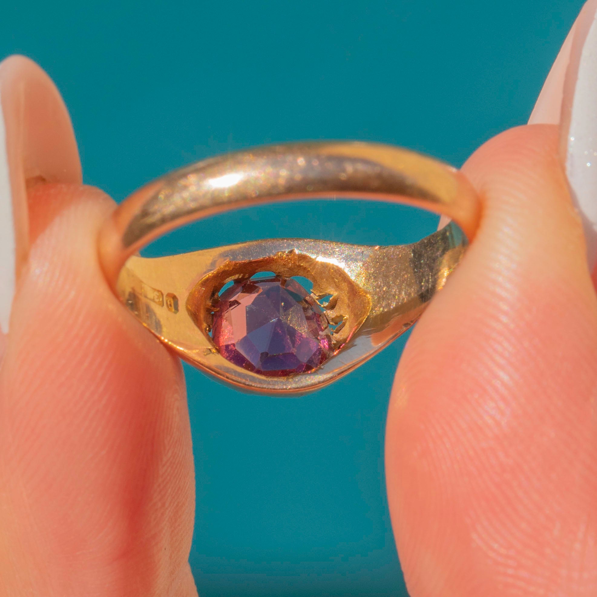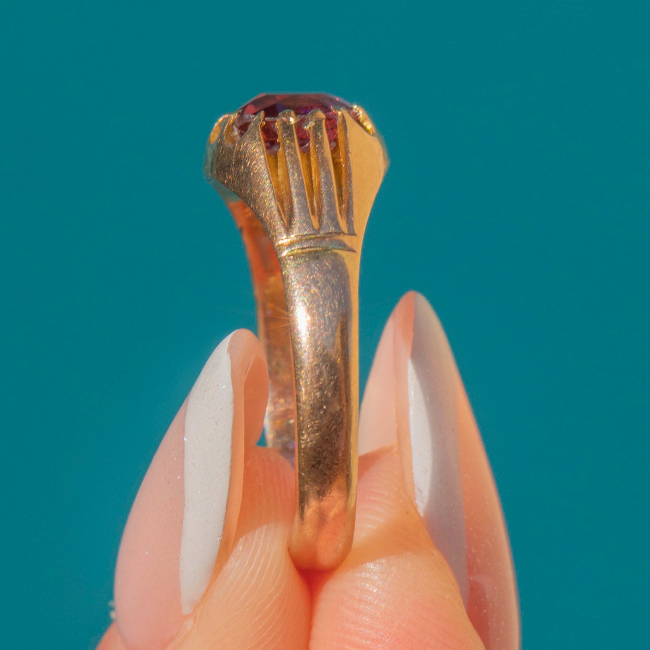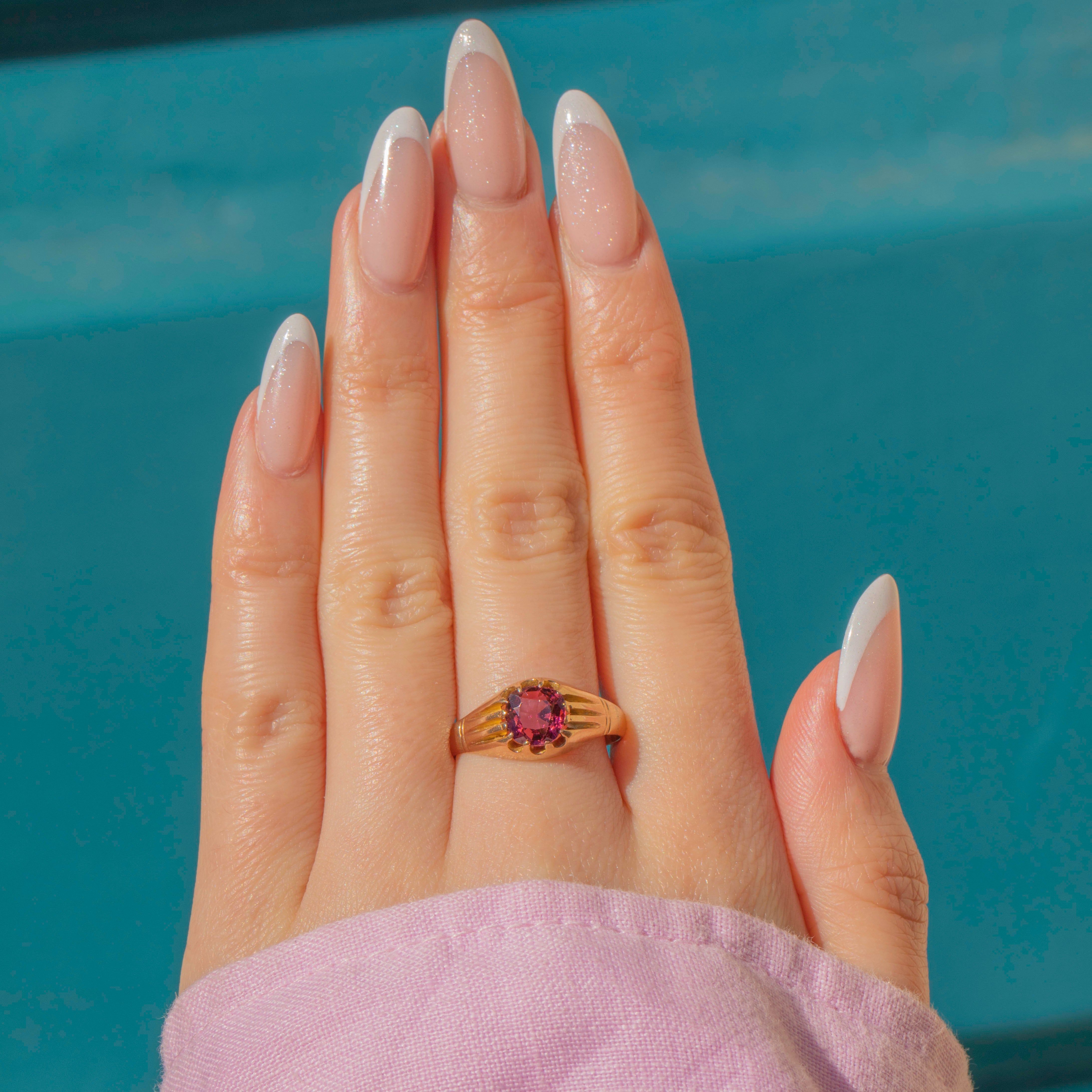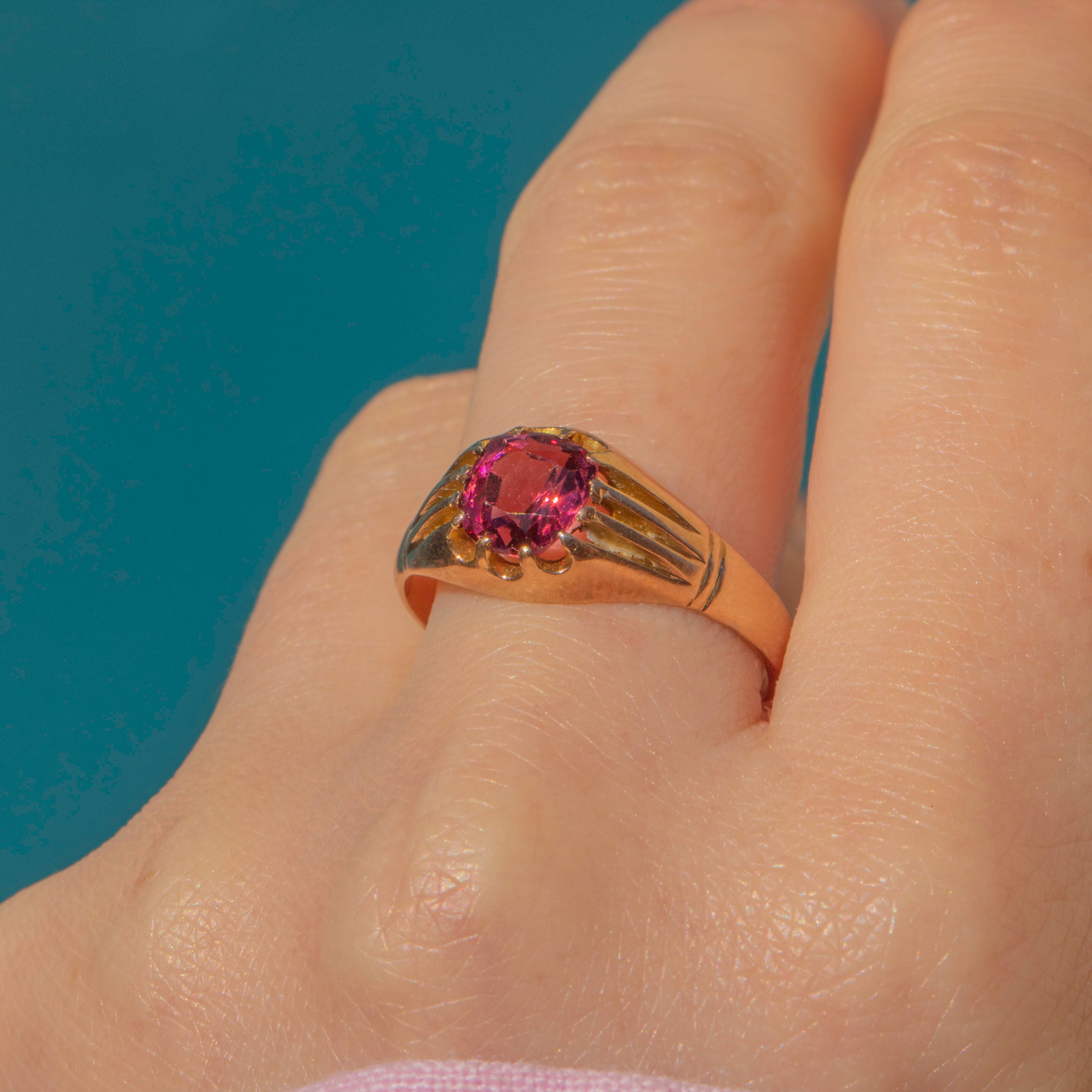 This antique 9ct Gold Pink Tourmaline buttercup set ring is a must-have for your collection! The chunky Gold band is undeniably luxurious and comes complete with a full set of English hallmarks dating to 1908.