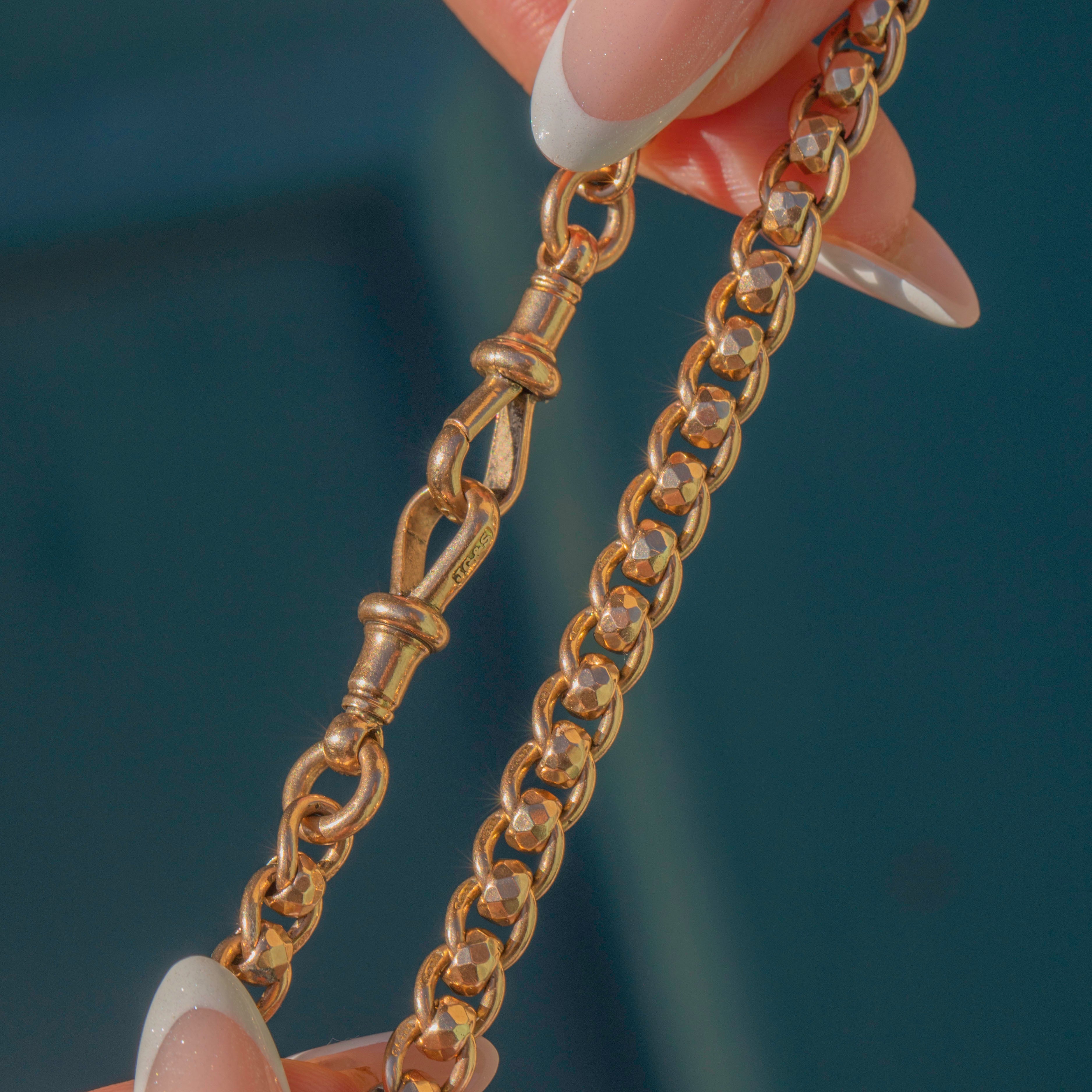 A gorgeous antique 9ct Gold rollerball Albert chain, complete with matching dog-clips. This wonderfully handcrafted Albert chain features faceted rollerball links, two matching dog-clips, a bolt-ring, and a removable travelling T-bar!
