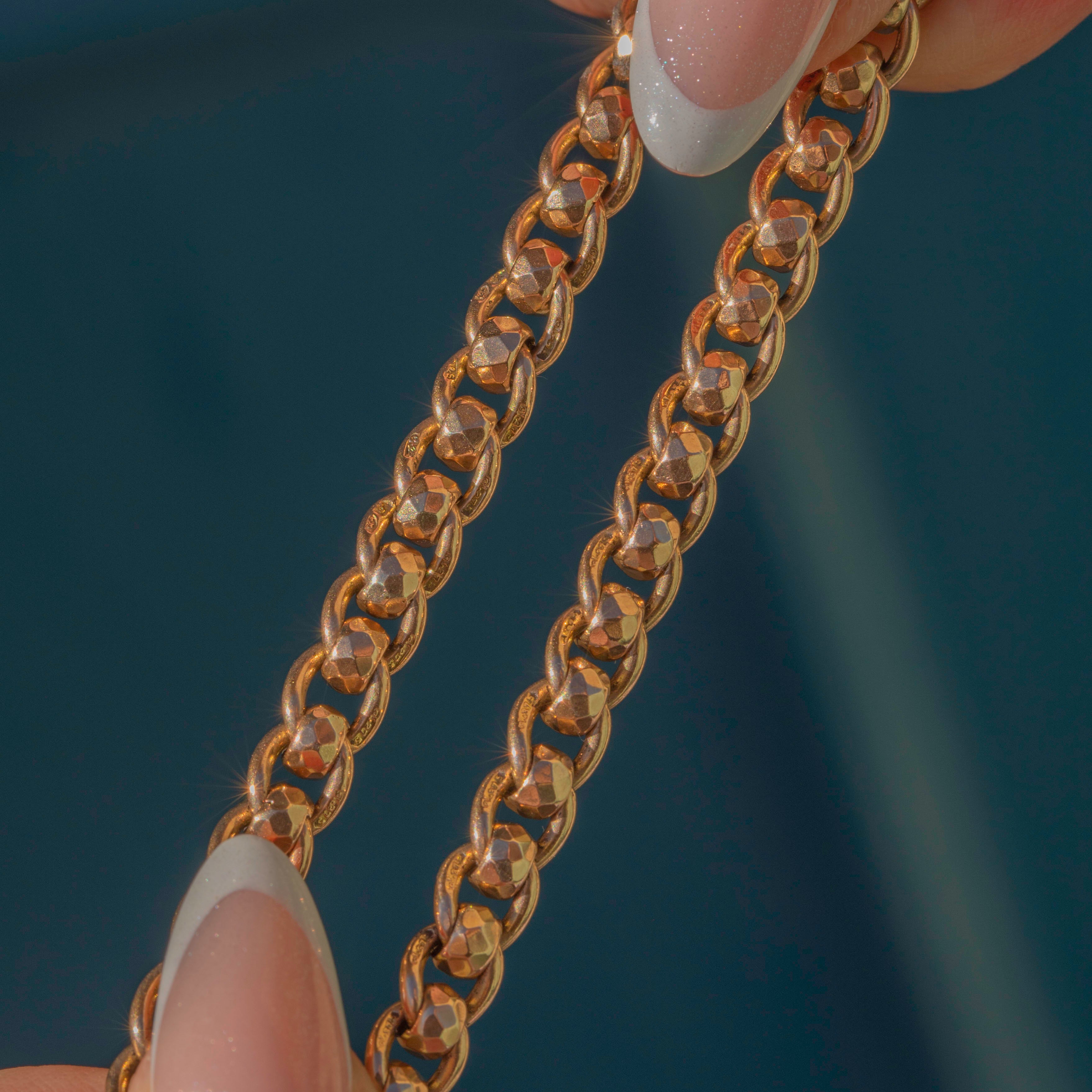 EXCELLENT. This antique 9ct Gold rollerball Albert chain is in excellent condition. The links are all secure, the rollerballs have great movement, and each link is stamped. The dog-clips are in perfect working order so you can wear it with absolute confindece. The bolt-ring opens with a gentle push and sometimes requires a gentle push to close securely. The T-bar can be removed, allowing you to pair it with one of your other pendants or charms!