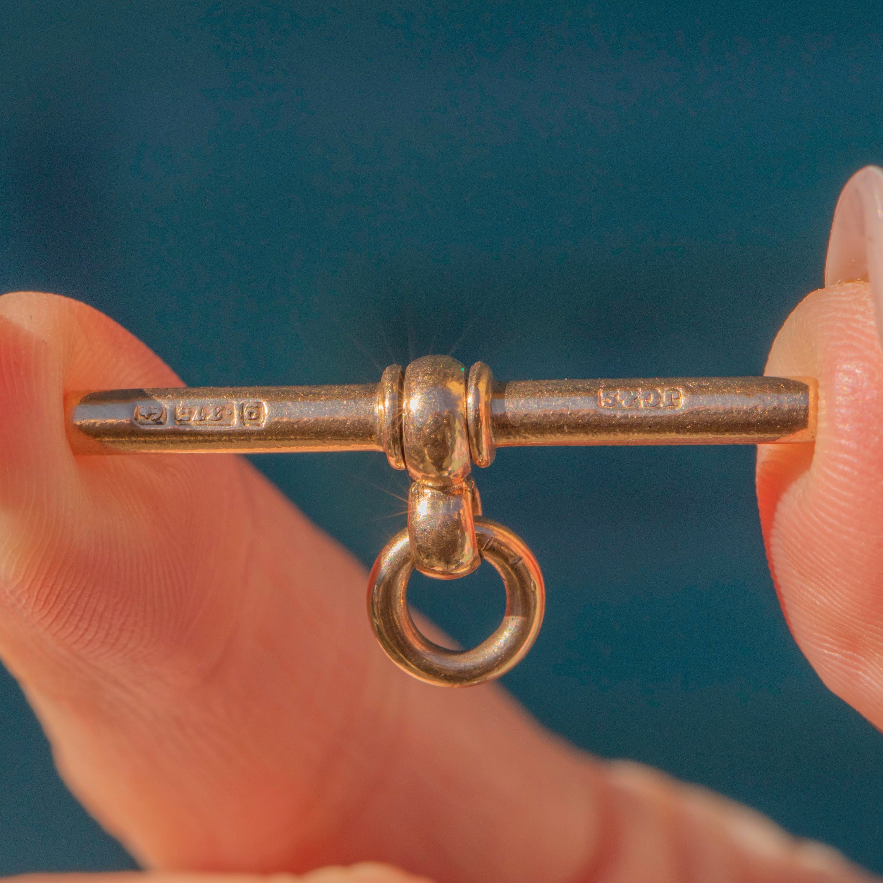 HALLMARKS: 9, .375 on every curb link, 9, .375 on dog-clips, bolt-ring & T-bar, JG&S Makers mark & Birmingham Anchor on T-bar.