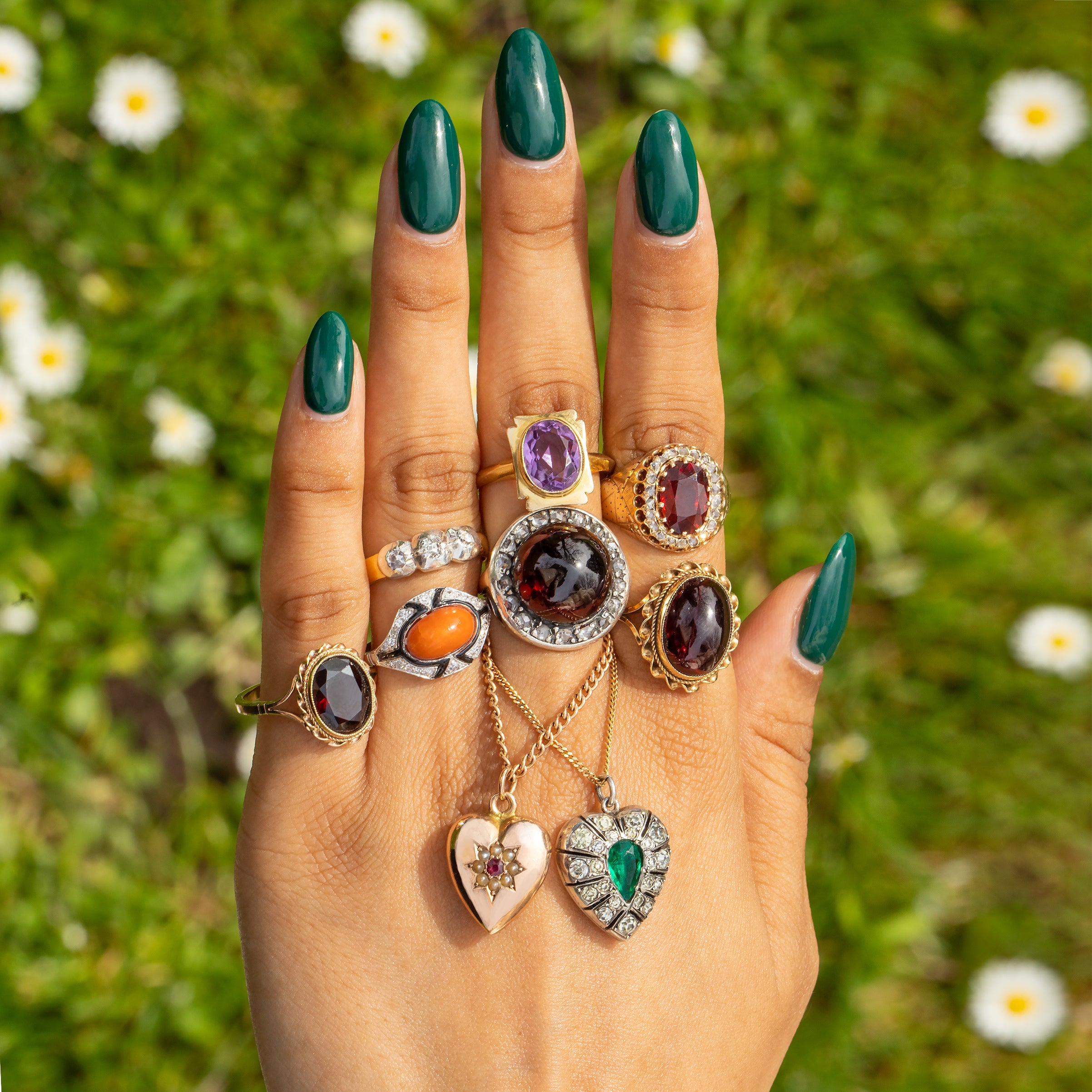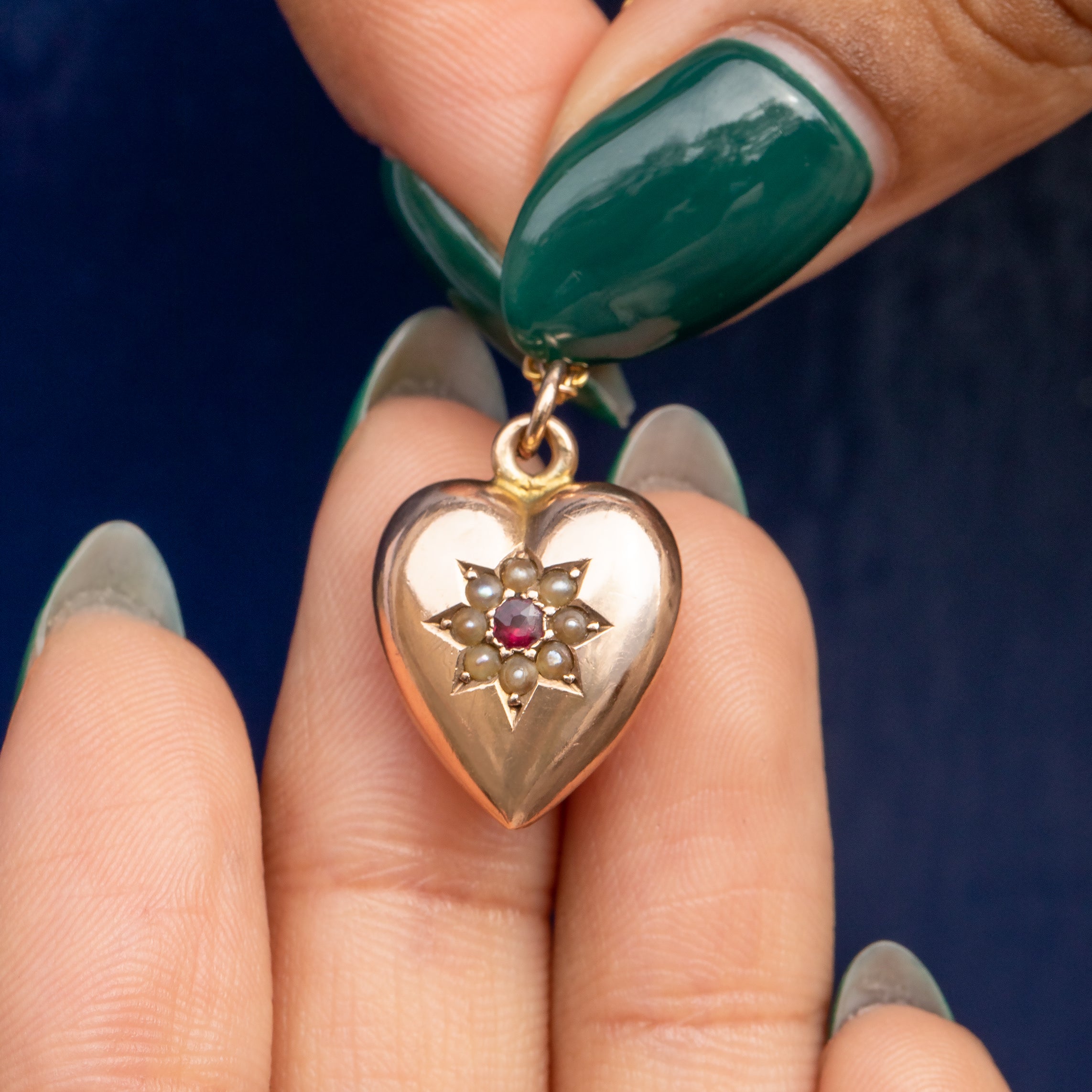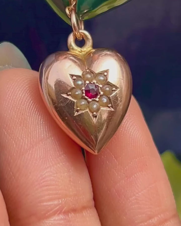We're in love with this sweet antique 9ct Gold Ruby Pearl puffy heart pendant! She's dainty in size and perfect for adding to a charm bracelet or chain.