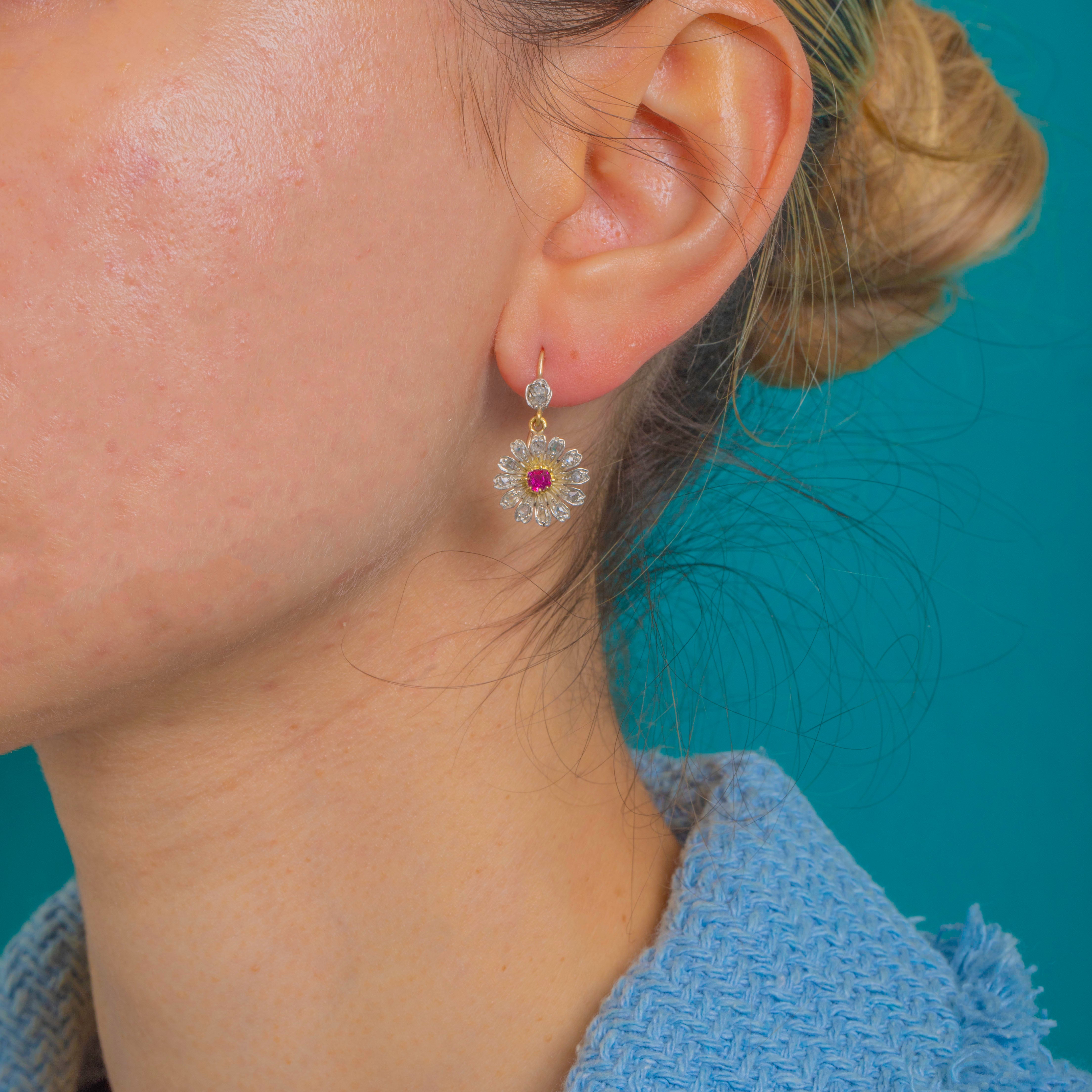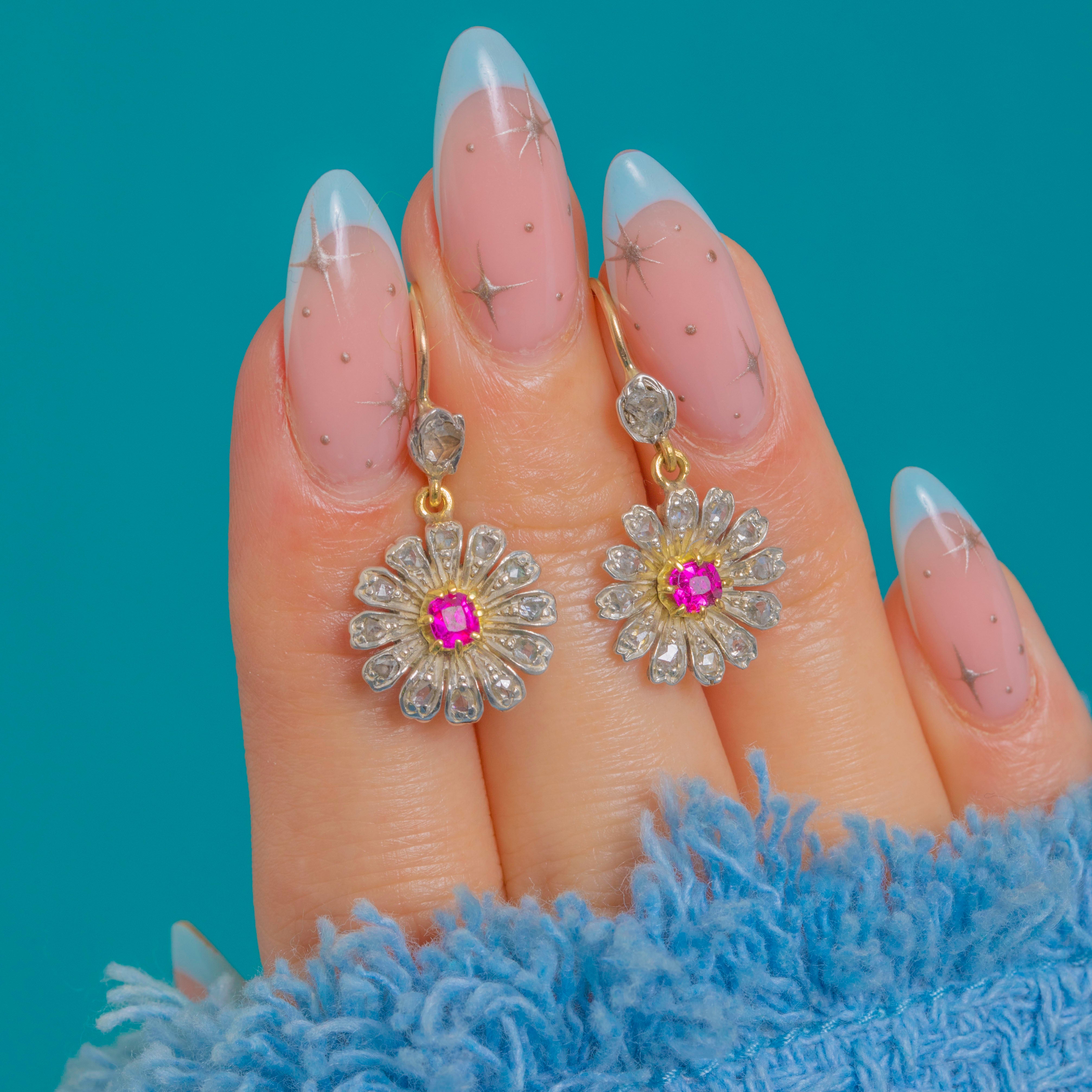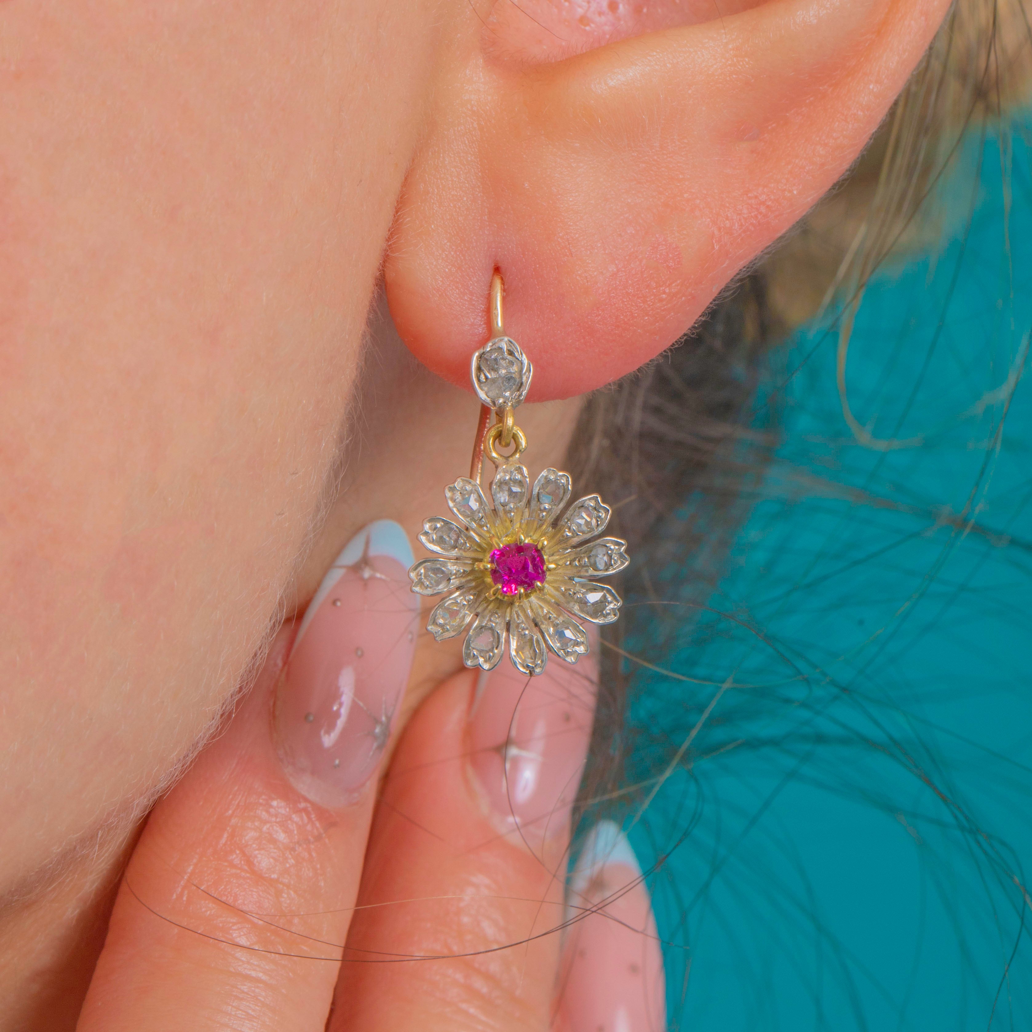 Delicate, feminine and unmistakably Edwardian, these antique drop earrings bloom with a vivid Ruby at the heart of each silver-topped flower, encircled by twinkling Diamonds. A single Diamond surmount sits at the lobe, with the articulated floral drop dancing below—capturing the airy sparkle and refined grace of the period.