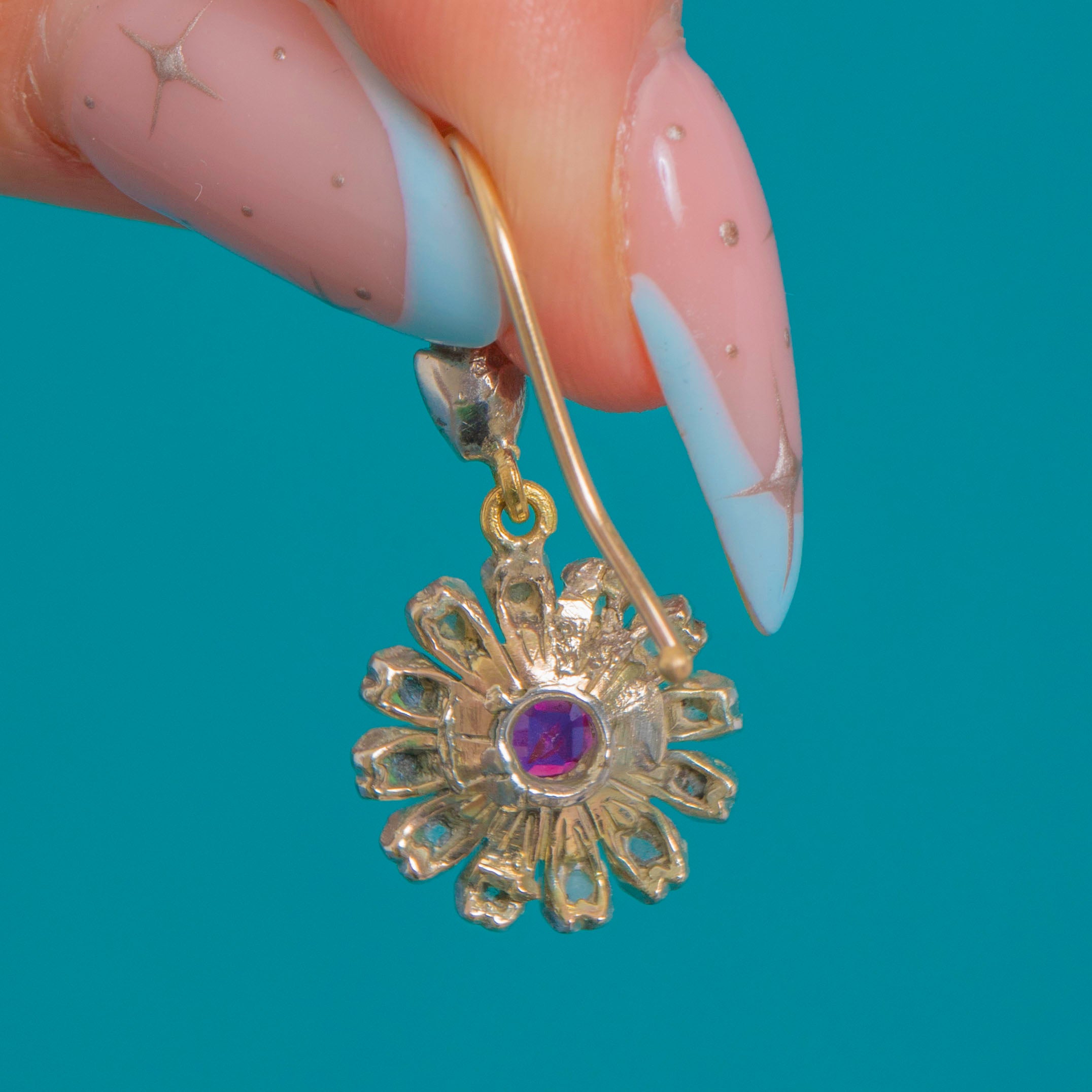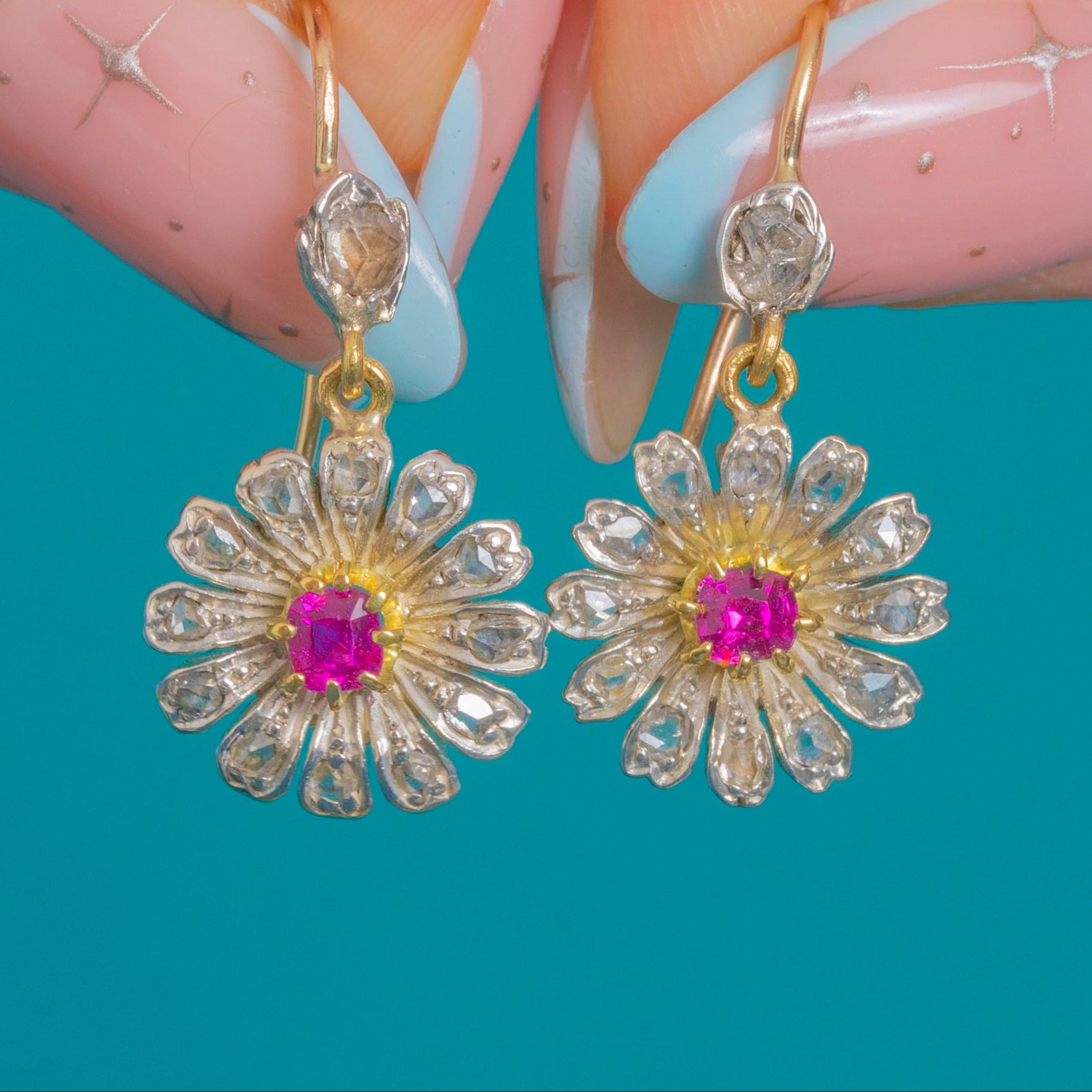 Antique 9ct Gold & Silver Ruby Diamond Flower Cluster Earrings