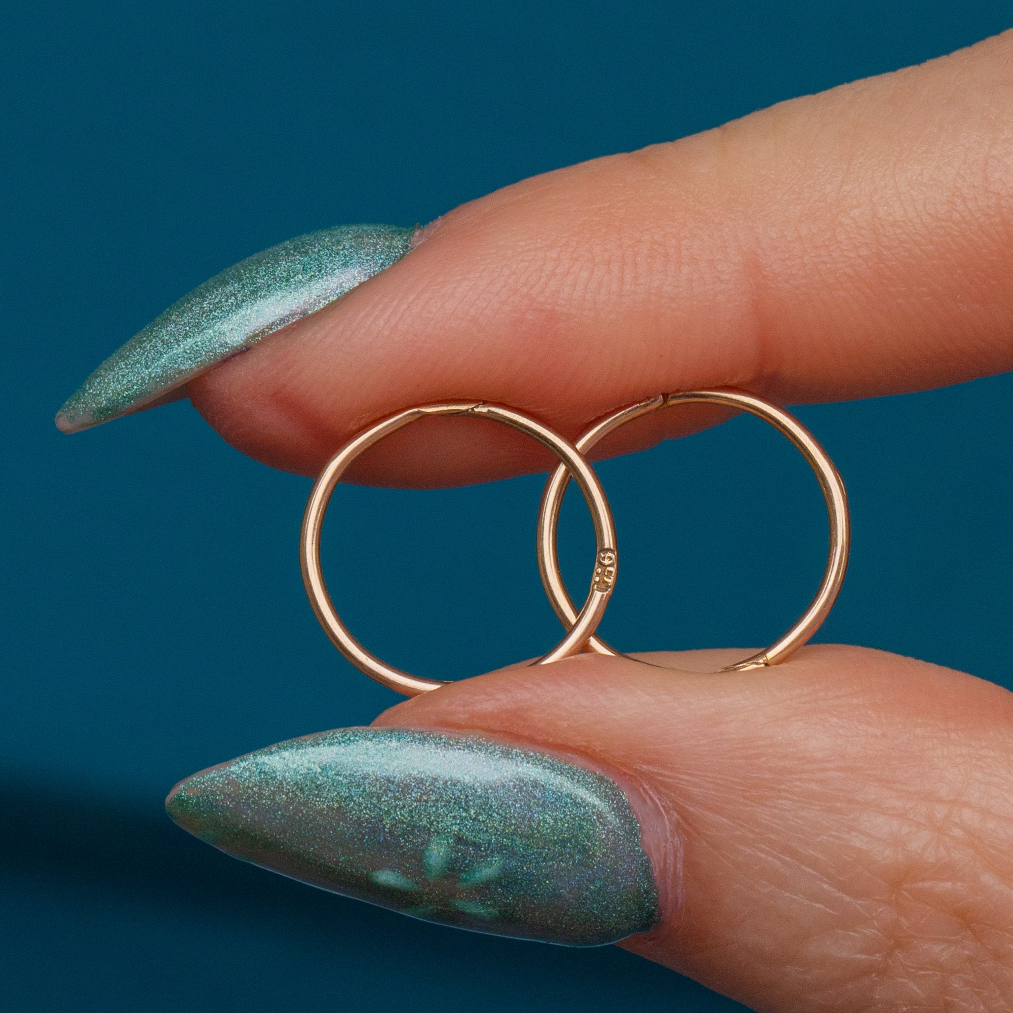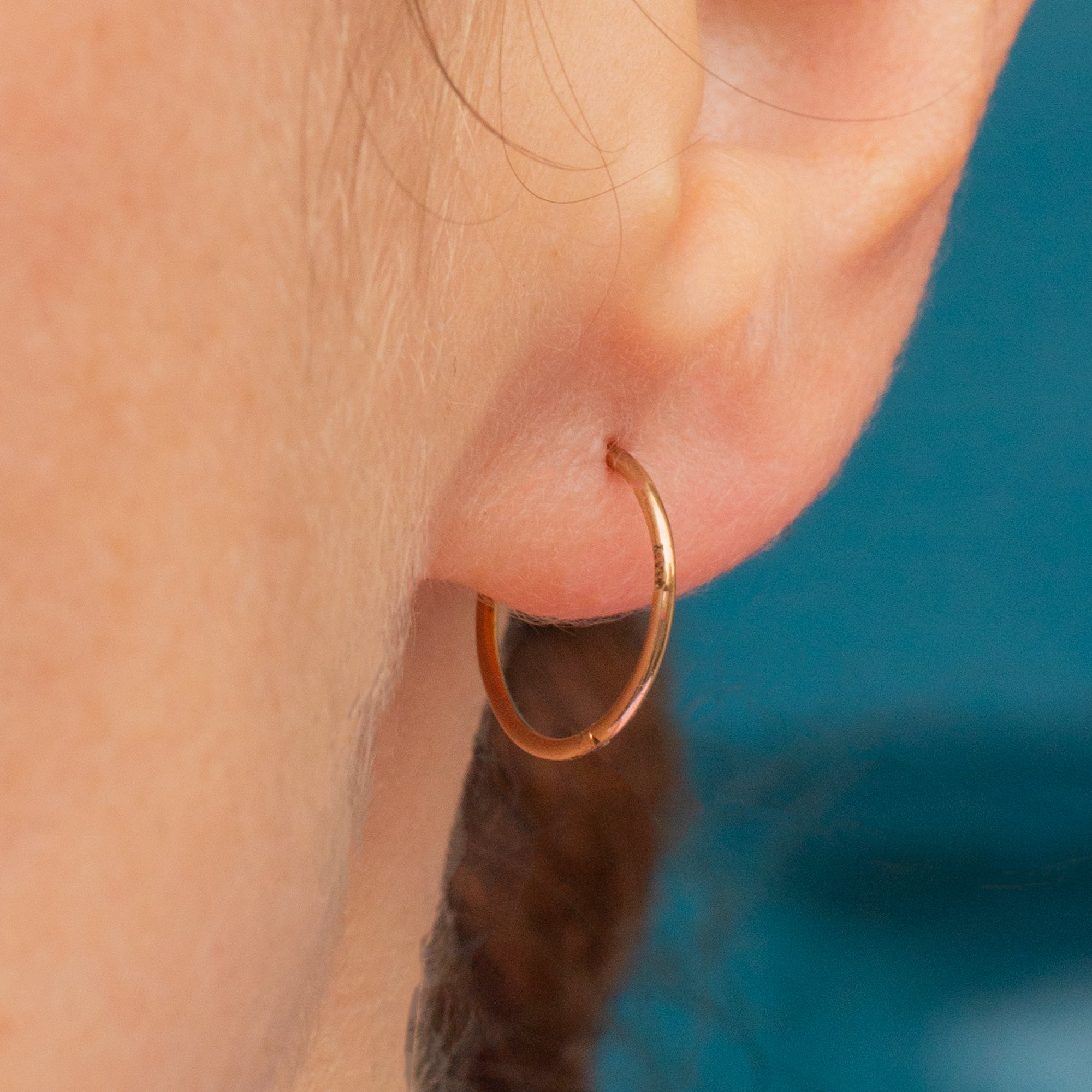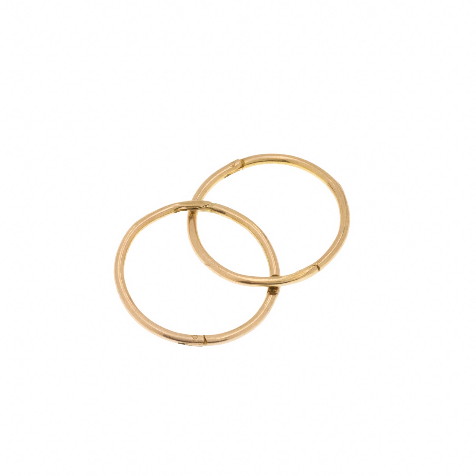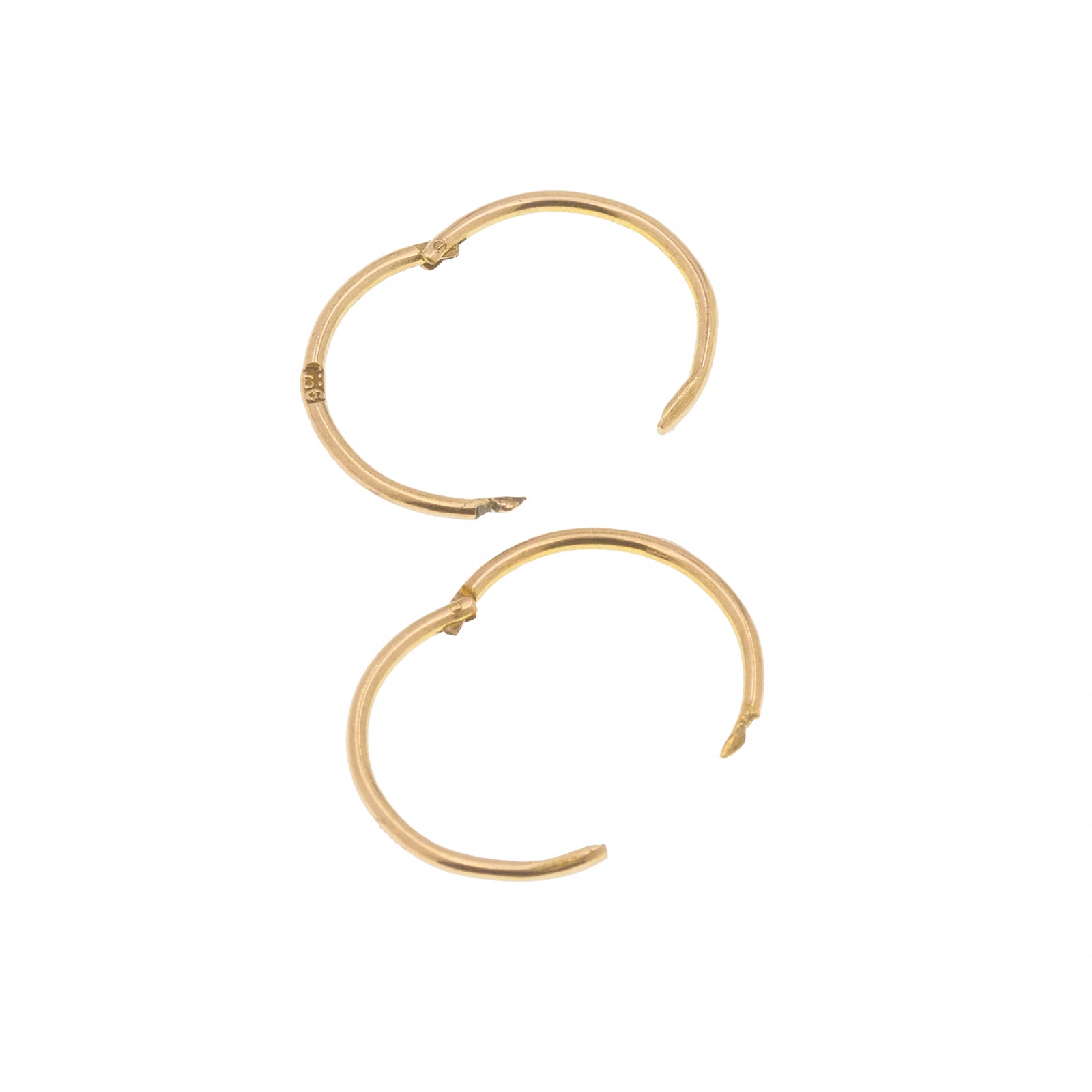 EXCELLENT. This pair of 9ct gold sleeper hoop earrings are in excellent condition overall. Their hinges are in perfect working order and click through your lobes neatly. As they are light and dainty, they must be handled with care when putting them in and taking them out. The Gold hue is splendid and rich, and they have kept their round shape perfectly well.